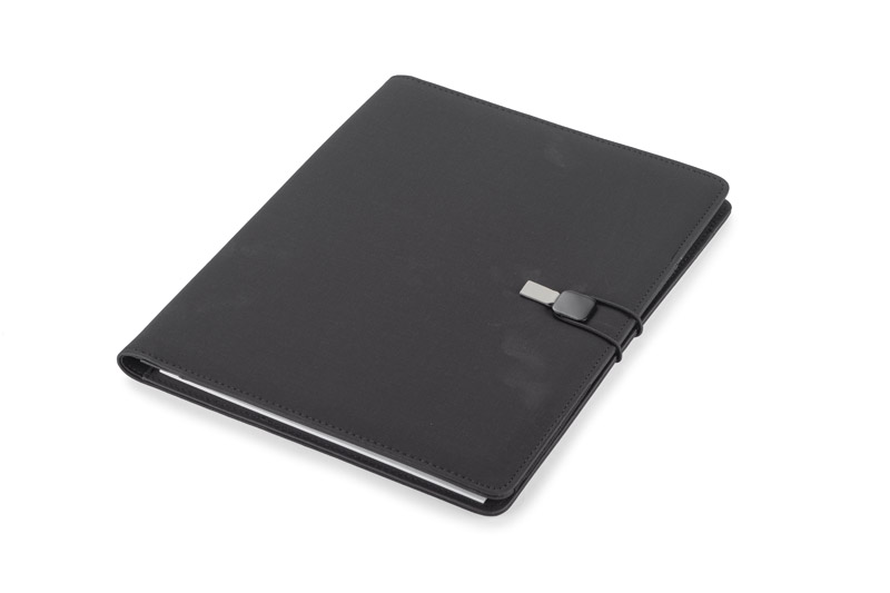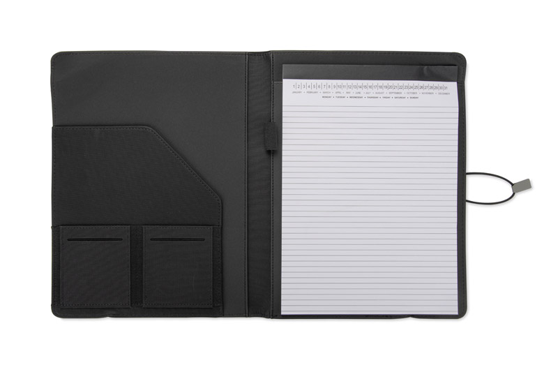 Teczka konferencyjna TELLA zamykana na gumkę zakończonąmateriałem skóropodobnym (PU) w kolorze szarym, która ułatwia otwieranie teczki i jednocześnie stanowi ciekawą i elegancka ozdobę . Zawiera jedną kieszeń do przechowywania dokumentów, dwie mniejsze kieszonki, miejsce na długopis i wizytówki oraz notes o formacie A4 z możliwością jego wymiany.