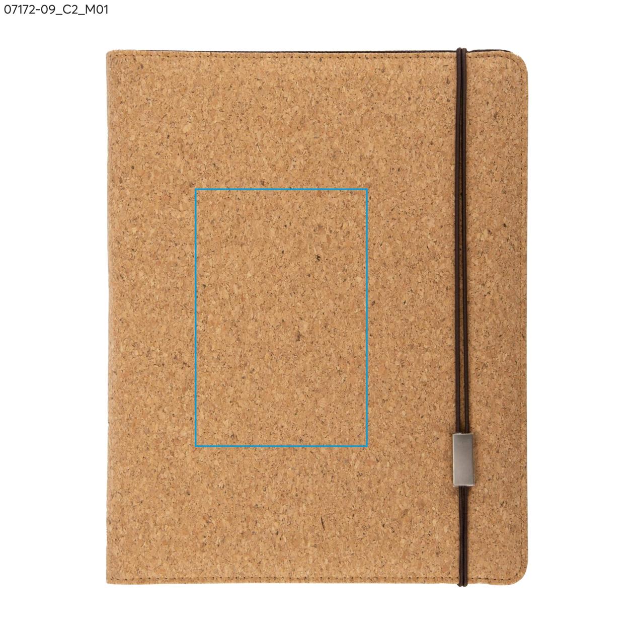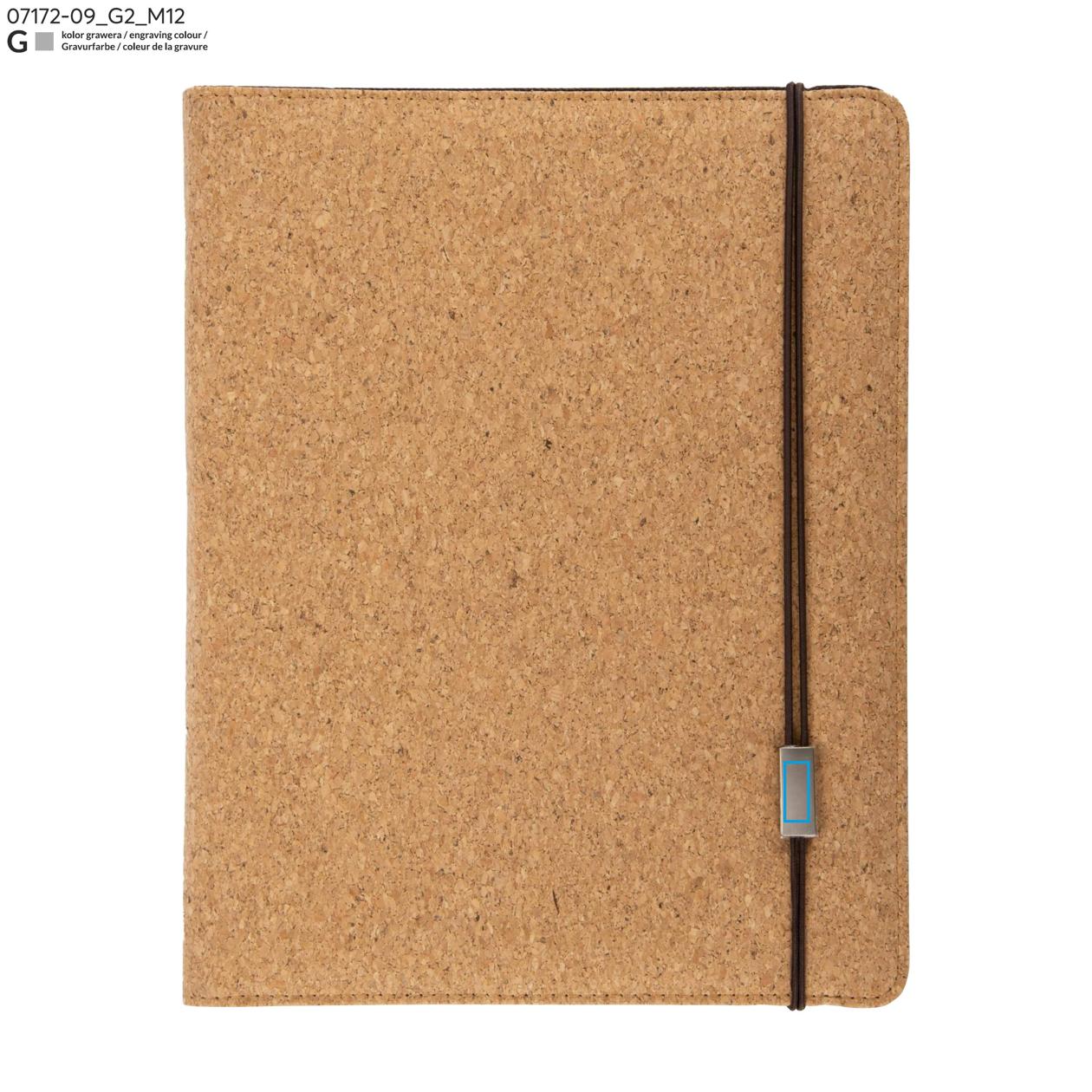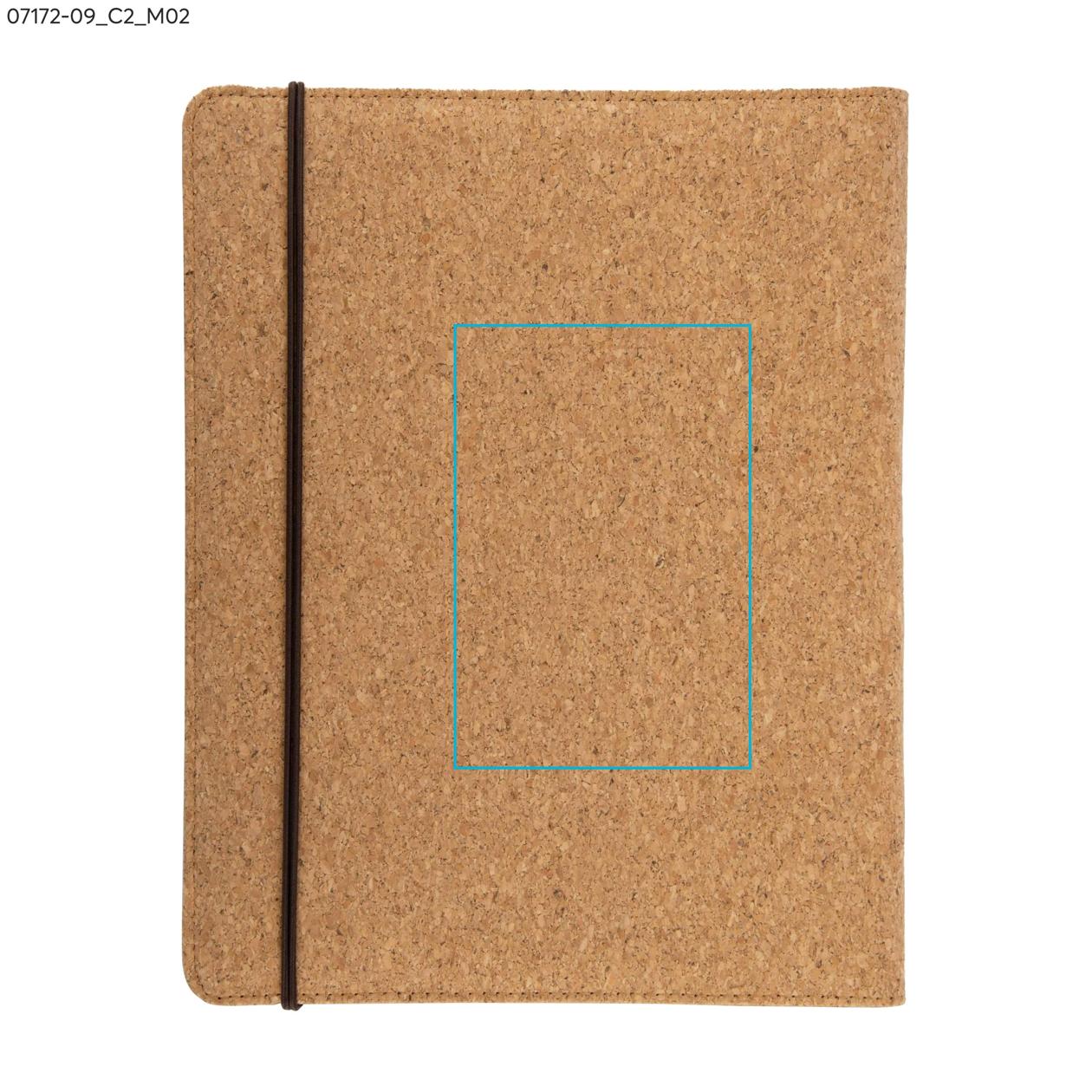 Korkowa teczka A4 z notatnikiem. Zawiera dużą kieszeń do przechowywania dokumentów, dwie mniejsze kieszonki oraz miejsce na długopis. Zamykana za pomocą gumki z metalowym elementem. Zapakowana w woreczek non woven.