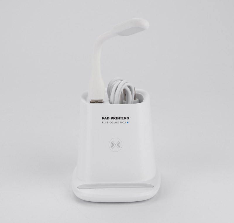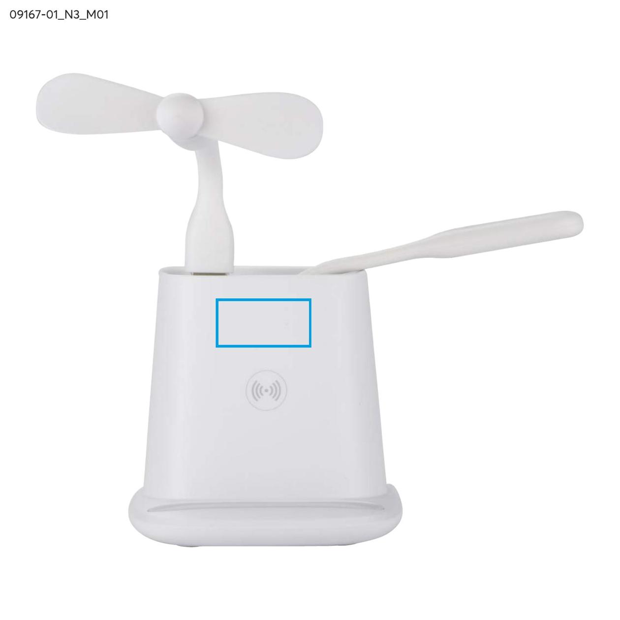 Przybornik na biurko BERGO to idealny gadżet do pracy przy biurku. Posiada on wbudowaną ładowarkę bezprzewodową, która służy również jako stojak do telefonu, jeden port USB, który zasili dołączone do produktu akcesoria: wiatraczek lub lampkę, a także port USB typu C, dzięki któremu za pomocą odpowiedniego kabla możemy naładować telefon. W przypadku niekorzystania z akcesoriów port USB może funkcjonować jako hub. Dane techniczne: wejście USB typu C: 5V/2A, wyjście ładowarki bezprzewodowej: 5W, 2 wyjścia: USB typu A i USB typu C: 5 V/2A (maks.)