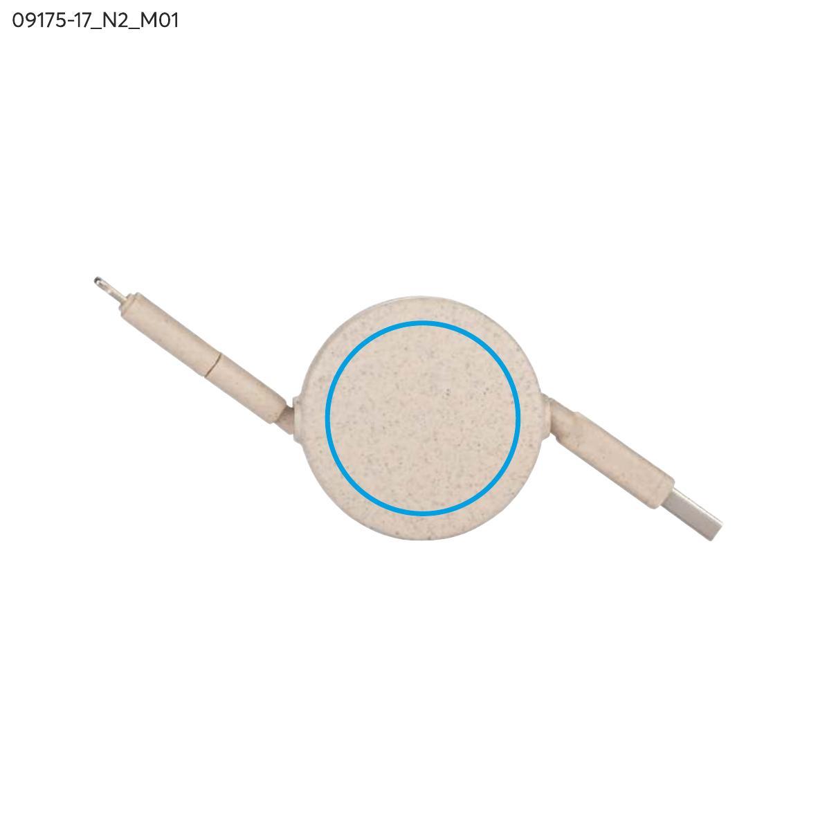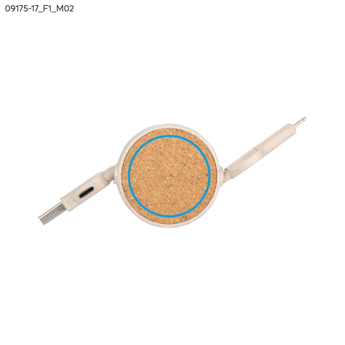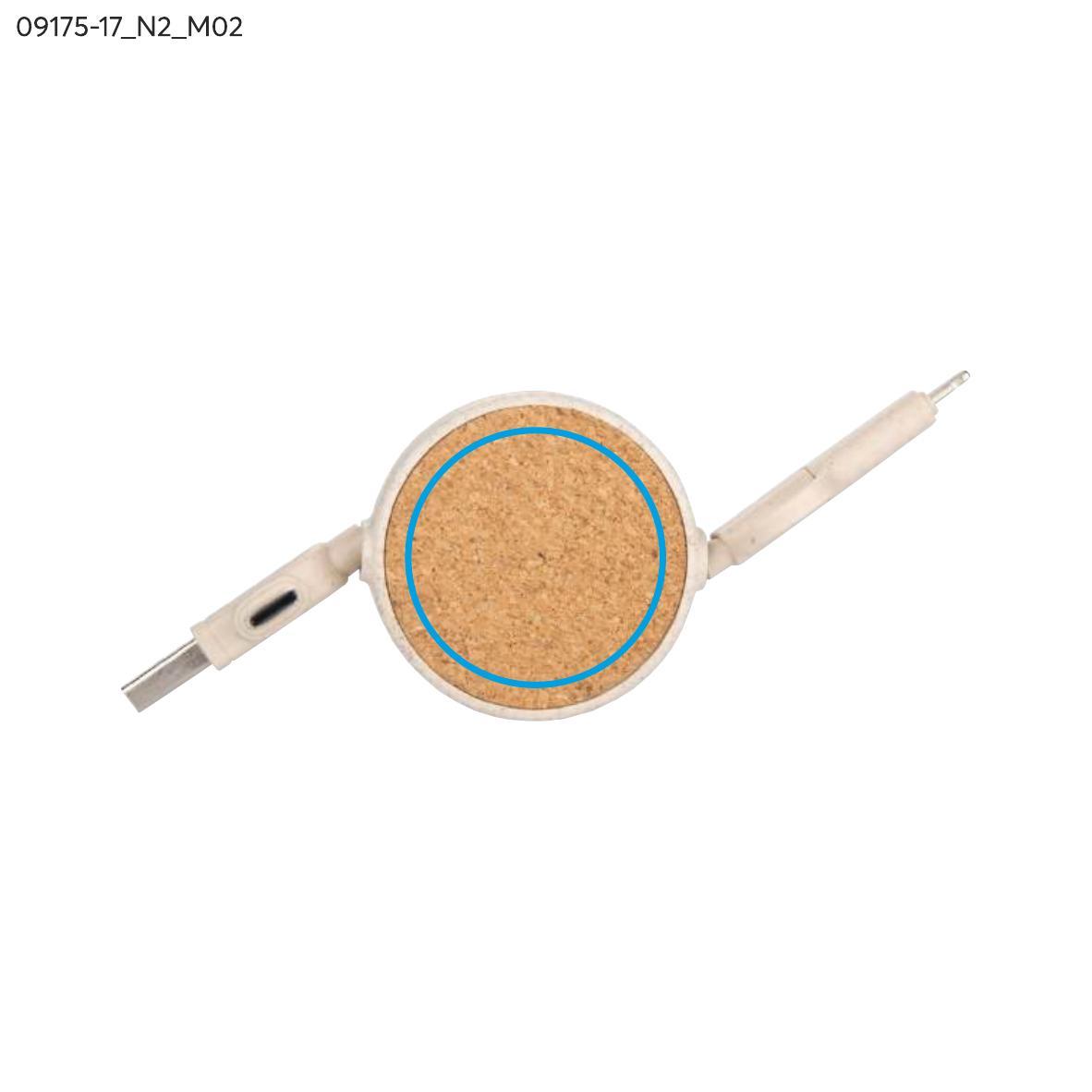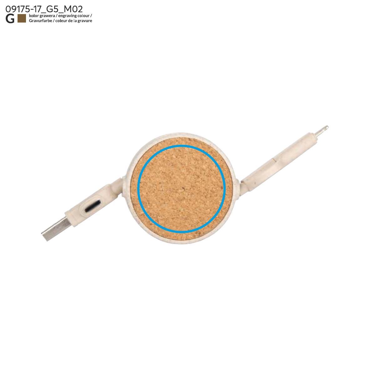 Kabel do ładowania SLOPI łączy naturalne materiały z funkcjonalnością. Wykonany z korka oraz tworzywa ze słomy pszennej, oferuje końcówki USB, 2 x USB C oraz Lightning, zapewniając uniwersalność i wygodę. Zwijana konstrukcja ułatwia przechowywanie, a naturalny wygląd nadaje mu unikalny charakter. Idealny jako praktyczny gadżet promocyjny.