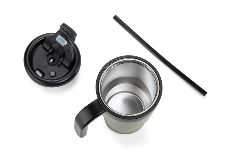 Kubek termiczny TUVO o pojemności 530 ml to solidny i stylowy gadżet wykonany ze stali nierdzewnej. Posiada poręczny uchwyt, klasyczny ustnik oraz praktyczne miejsce na słomkę z elastyczną zatyczką. Gumowa, antypoślizgowa podstawa zapewnia stabilność na różnych powierzchniach. To funkcjonalny dodatek dla mobilnych pracowników, branży kreatywnej i wszystkich, którzy lubią mieć ulubiony napój zawsze pod ręką – wygodnie i w dobrym stylu.