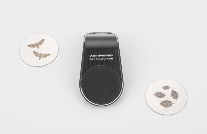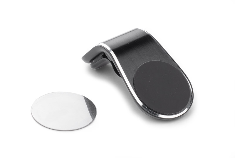 Uchwyt magnetyczny do telefonu do użycia w kratce wentylacyjnej samochodu. Wygodny klip do mocowania, w zestawie dwie srebrne blaszki.