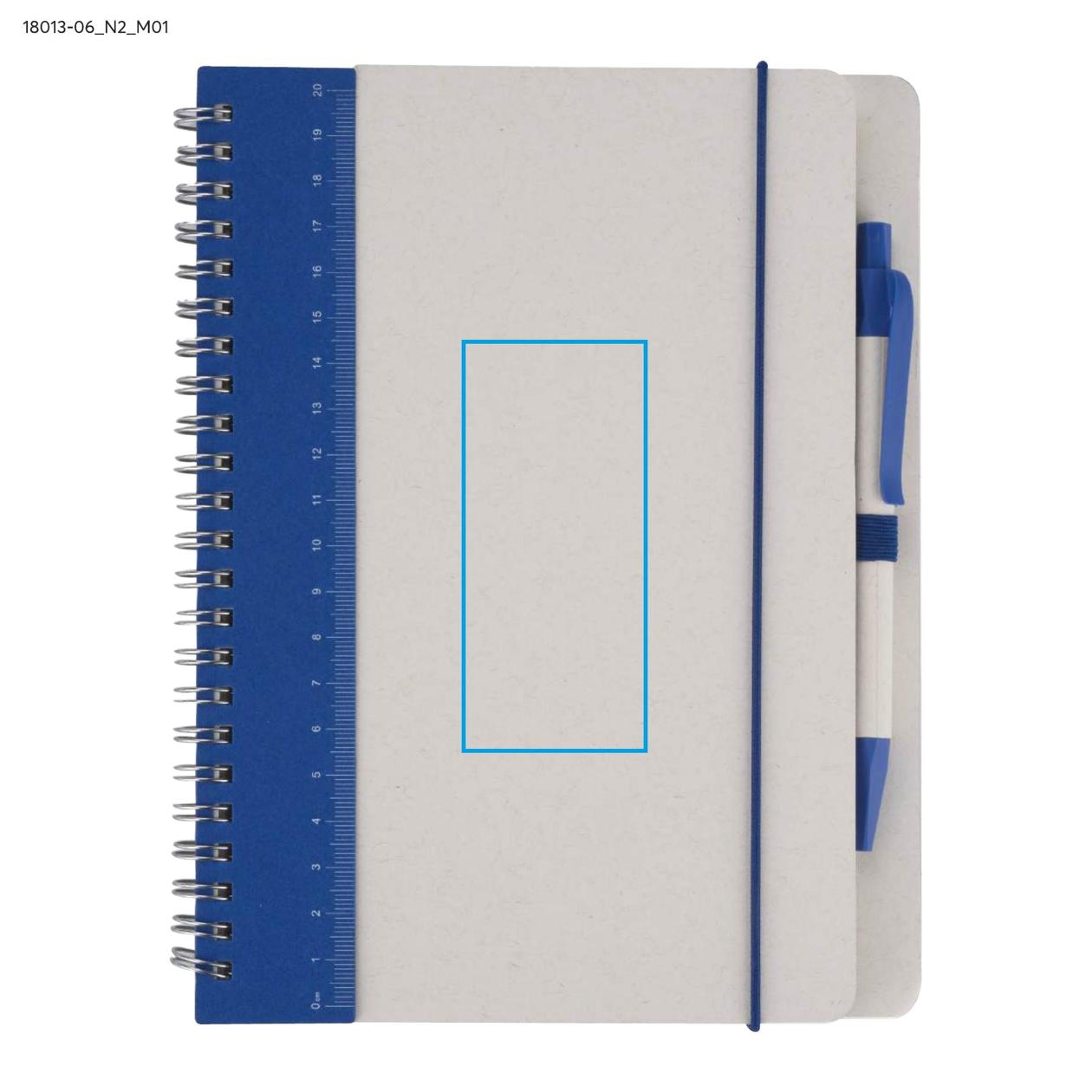 Notes REGALI wraz z długopisem wykonane są z kartonów po mleku. Długopis posiada wkład w kolorze niebieskim. Do notesu dołączona jest linijka o długości 20 cm pasująca kolorem do wykończeń na długopisie. Gumka na długopis oraz ta zamykająca notes w kolorystyce wykończeń długopisu.