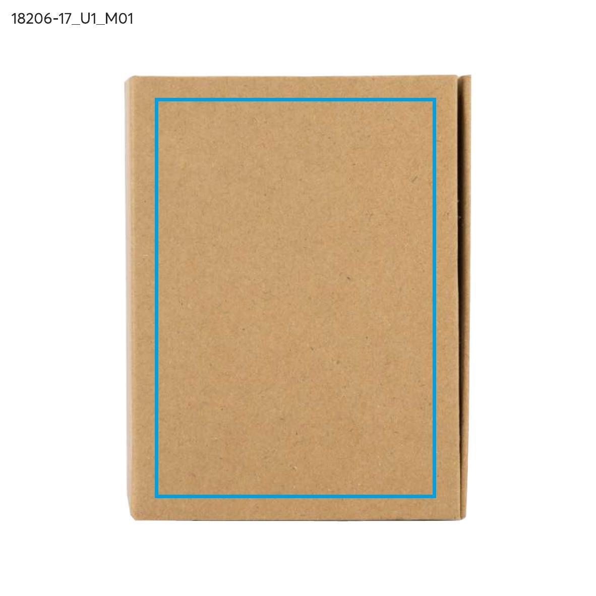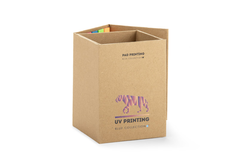 Przybornik na biurko KOS to funkcjonalny gadżet reklamowy wykonany z papieru kraftowego. W wersji złożonej pełni rolę eleganckiego stojaka na przybory biurowe, co pozwala na zachowanie porządku na biurku. Po rozłożeniu odkrywa zestaw karteczek samoprzylepnych, w tym pięć foliowych znaczników w różnych kolorach (po 25 sztuk każdy), średnie żółte karteczki samoprzylepne (25 sztuk) oraz około 200 luźnych kartek o wymiarach 72x72 mm, umieszczonych w dedykowanym miejscu. Przybornik KOS wyposażony jest także w miejsce na notatki mazakiem ścieralnym, co zwiększa jego funkcjonalność. Dzięki możliwości znakowania, można umieścić na nim logo lub inny tekst promocyjny, co sprawia, że jest doskonałym narzędziem do budowania wizerunku marki.