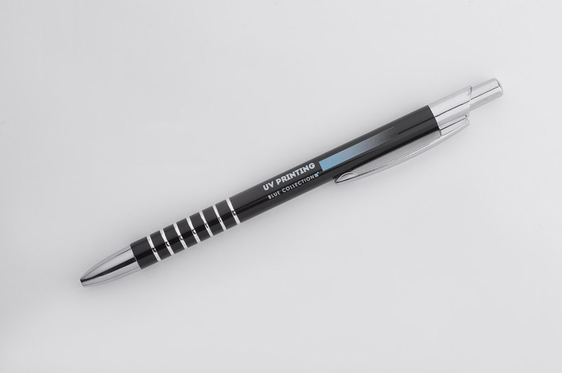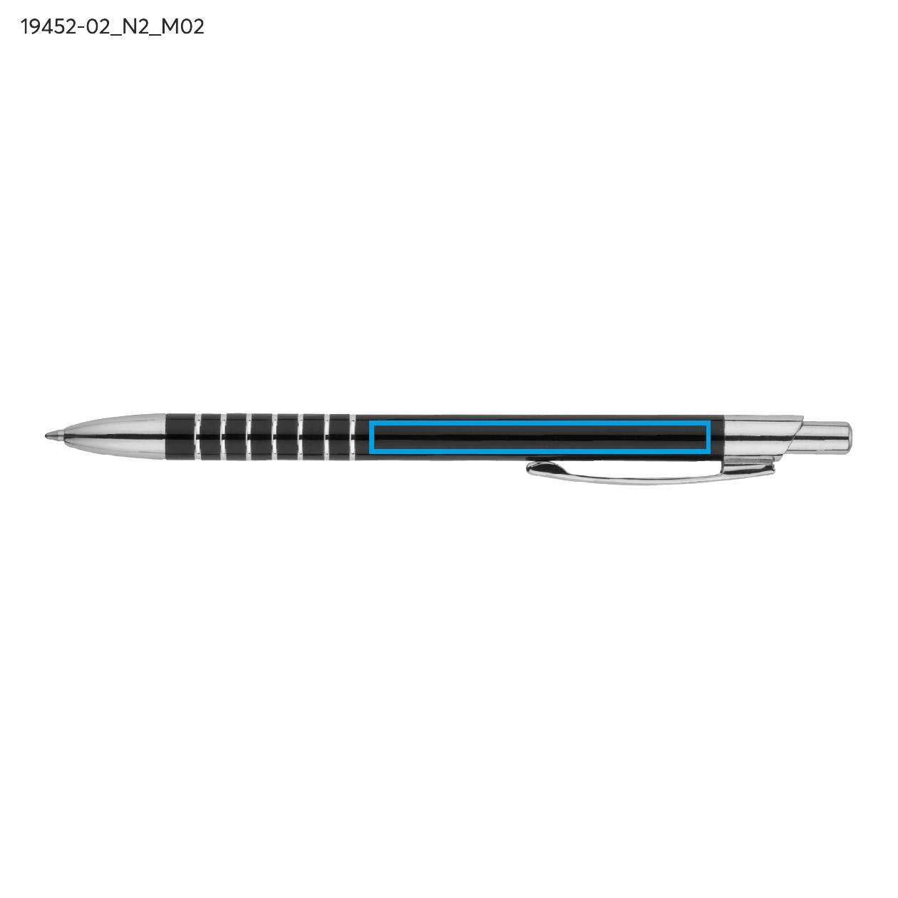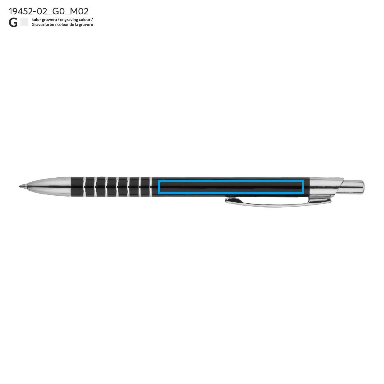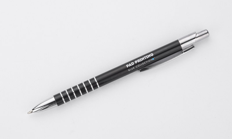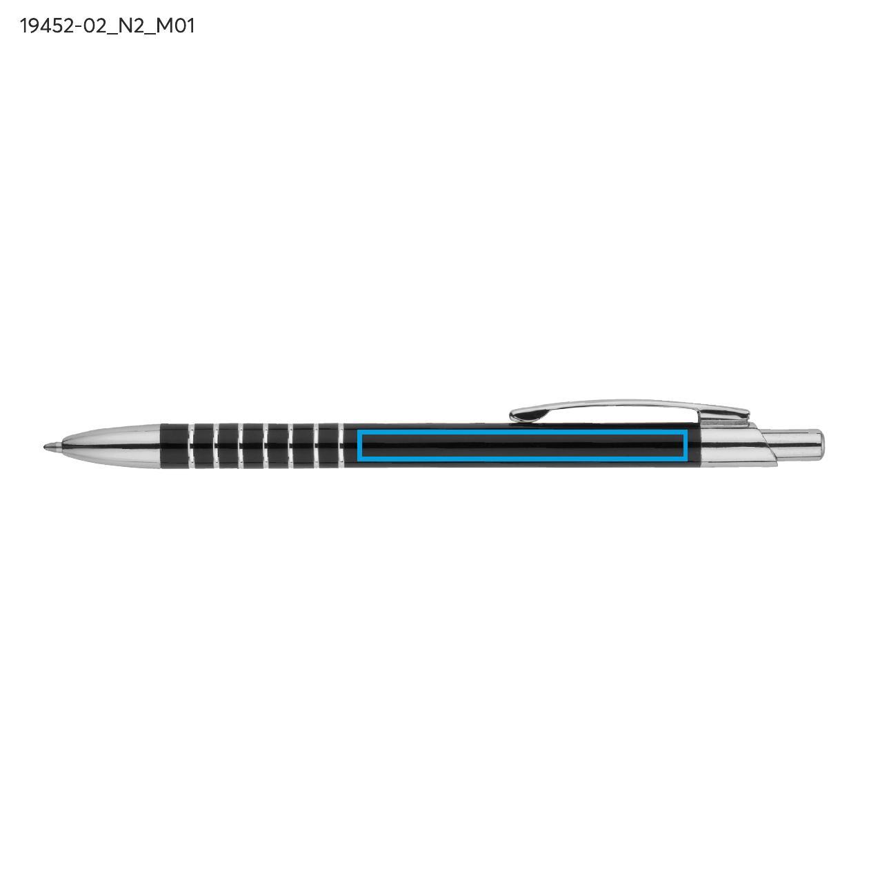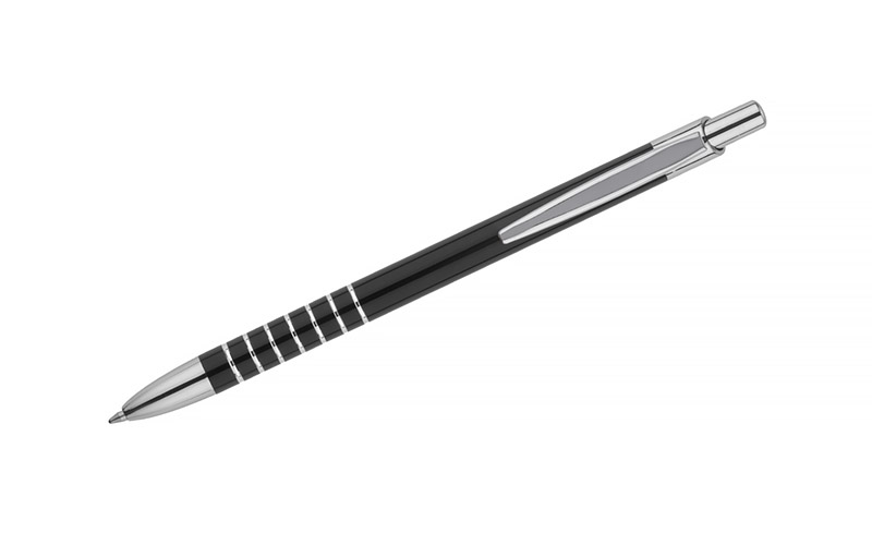 Prosty długopis wykonany z aluminium ozdobiony szerokimi ringami. Logo wygrawerujemy.