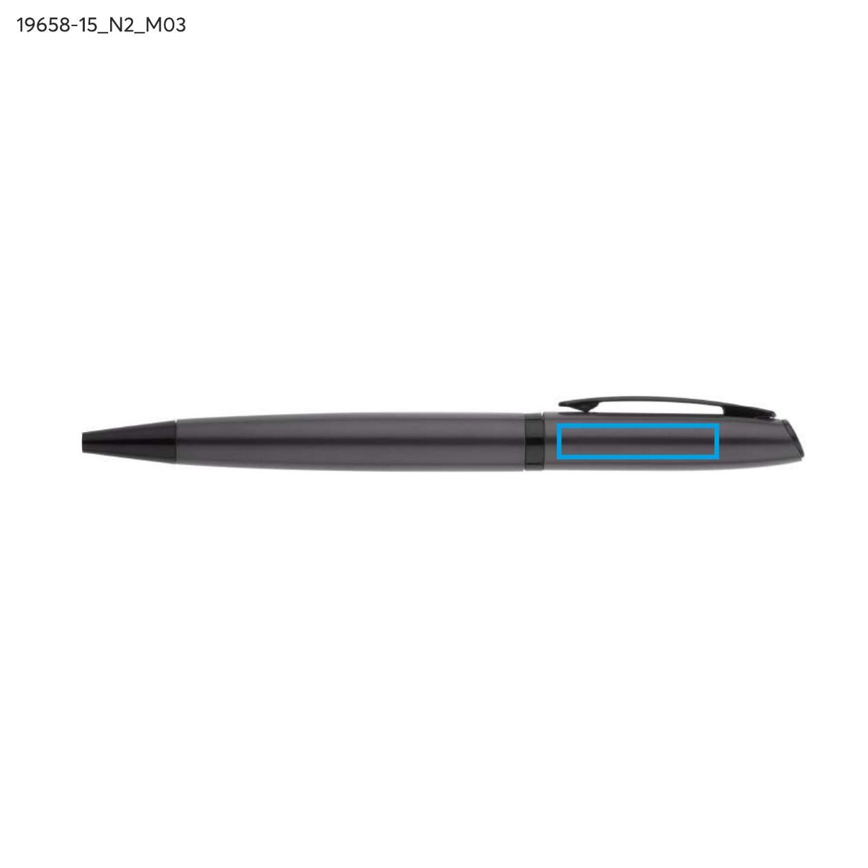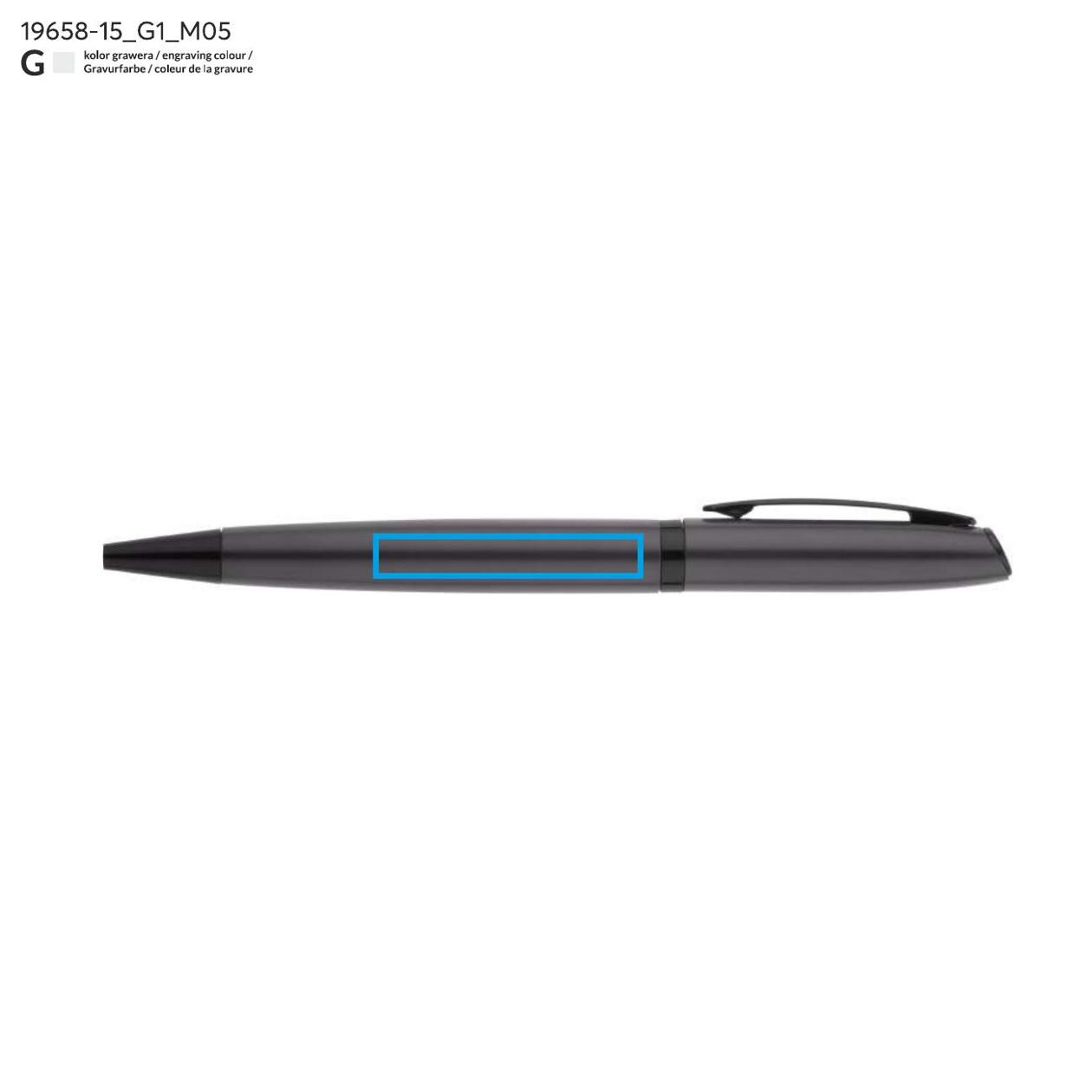 RIO to elegancki długopis zapakowany w papierowy kartonik dopasowany kolorystycznie do obudowy długopisu. Matowy kolor ładnie kontrastuje z czarnymi wykończeniami. Długopis z mechanizmem typu twist, z wkładem typu G2 w kolorze niebieskim.