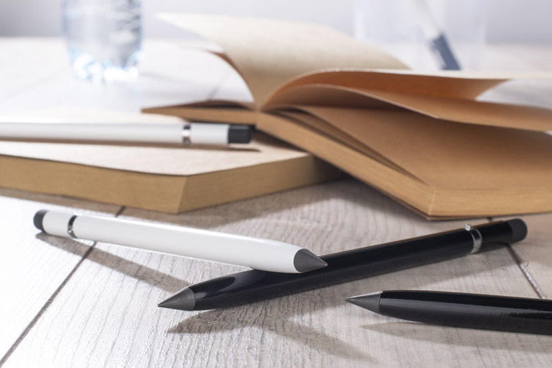 ETERNO to nowy typ ołówka, który zawsze będzie zatemperowany i nigdy się nie wypisze. Tradycyjny grafit został tu zastąpiony specjalnym utwardzonym rysikiem, który daje komfort pisania podobny do świeżo zatemperowanego ołówka. Korpus wykonany z aluminium zapewnia trwałość na lata. Na górze umieszczona gumka do mazania, która bez problemu zetrze notatki wykonane ołówkiem ETERNO (możliwość użycia także innych standardowych gumek). Ołówek wpisuje się w trend eko pozwalający zminimalizować ilość odpadów oraz surowców zużytych do produkcji przedmiotów codziennego użytku. Pakowany w czarne papierowe etui z infografiką z tyłu.