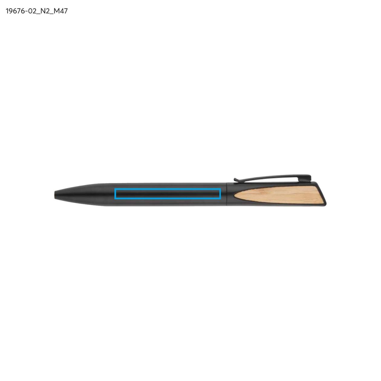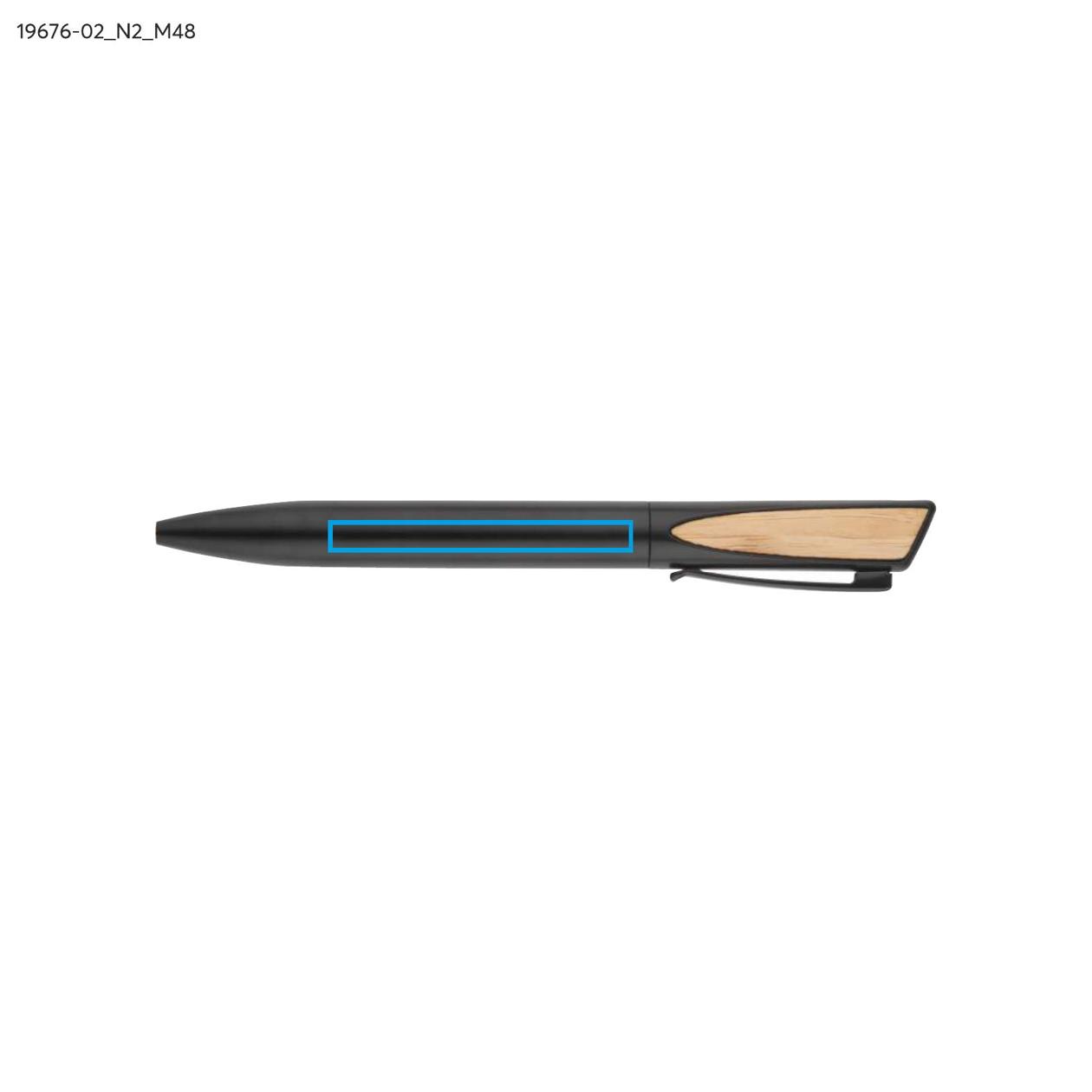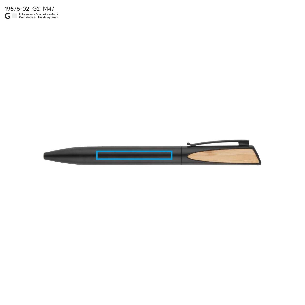 OYA to elegancki długopis wykonany z metalu oraz tworzywa w czarnym kolorze z ciekawym elementem ozdobnym z naturalnego bambusa. Długopis zapakowany jest w papierowy kartonik w kolorze brązowym. Mechanizm typu twist, wkład w kolorze niebieskim.