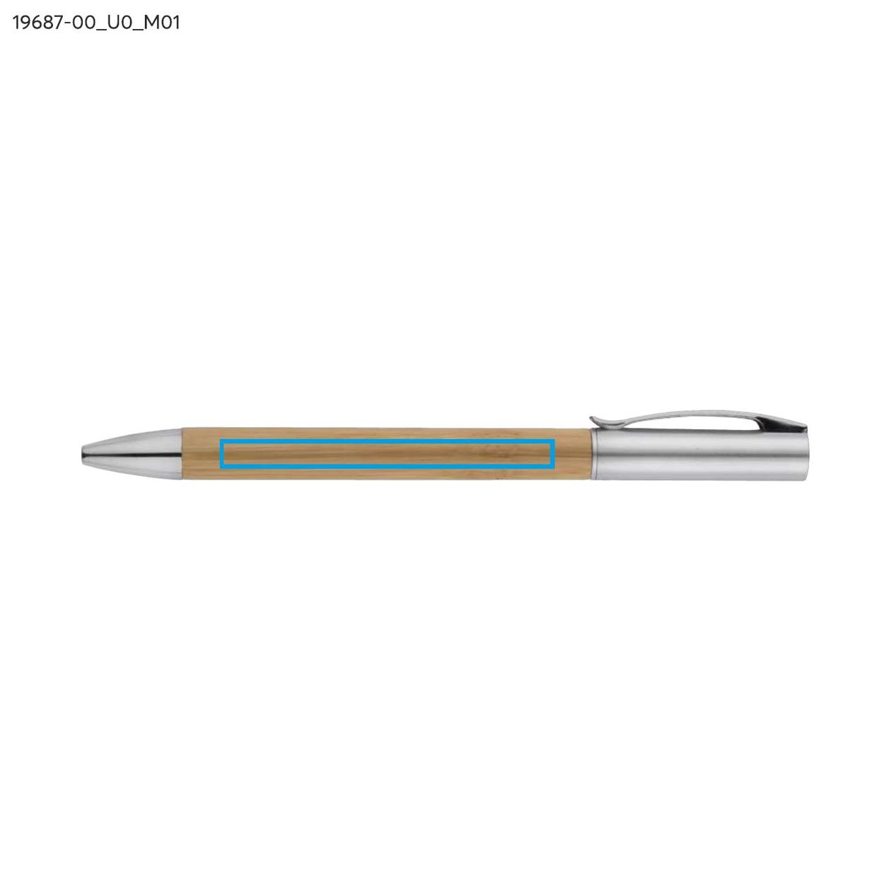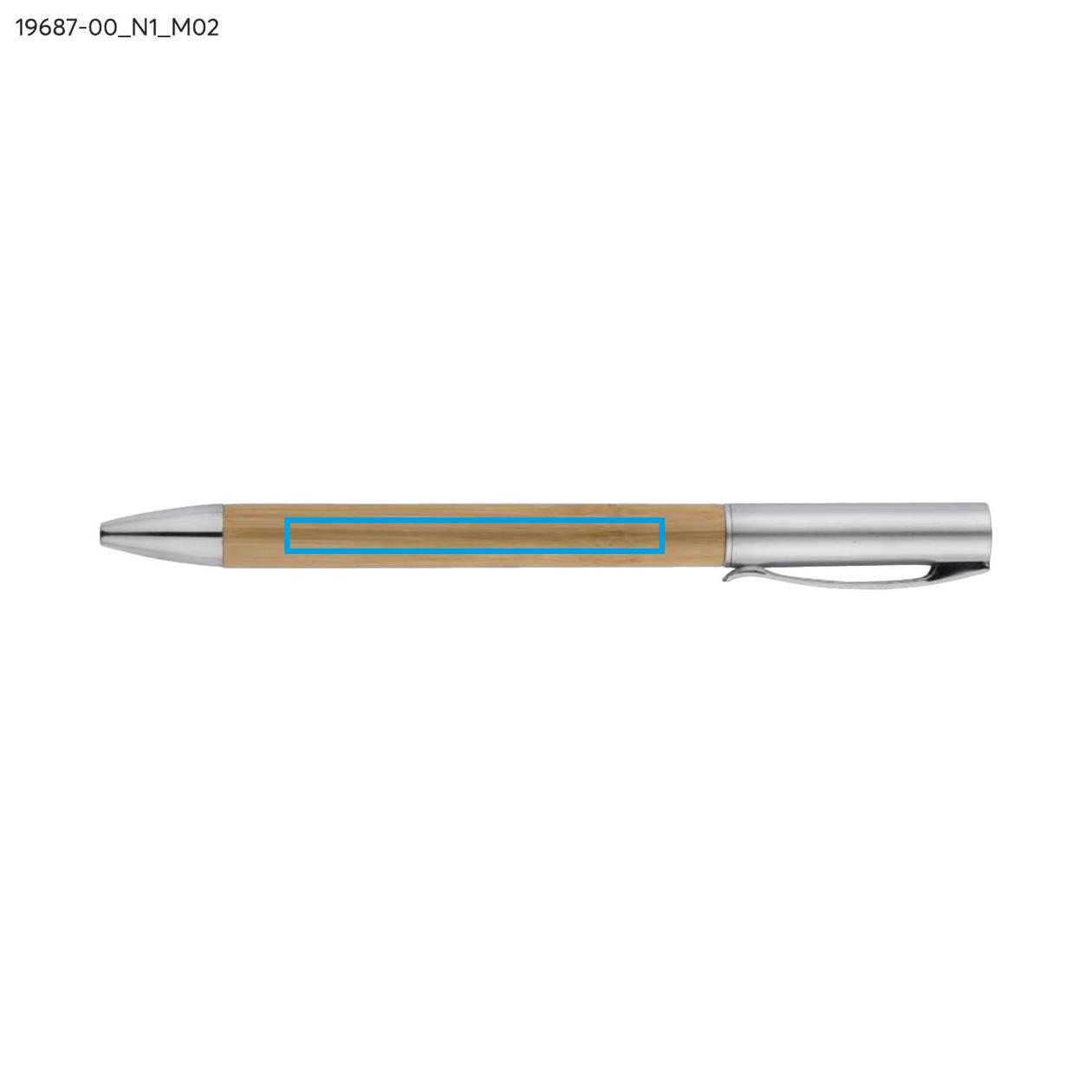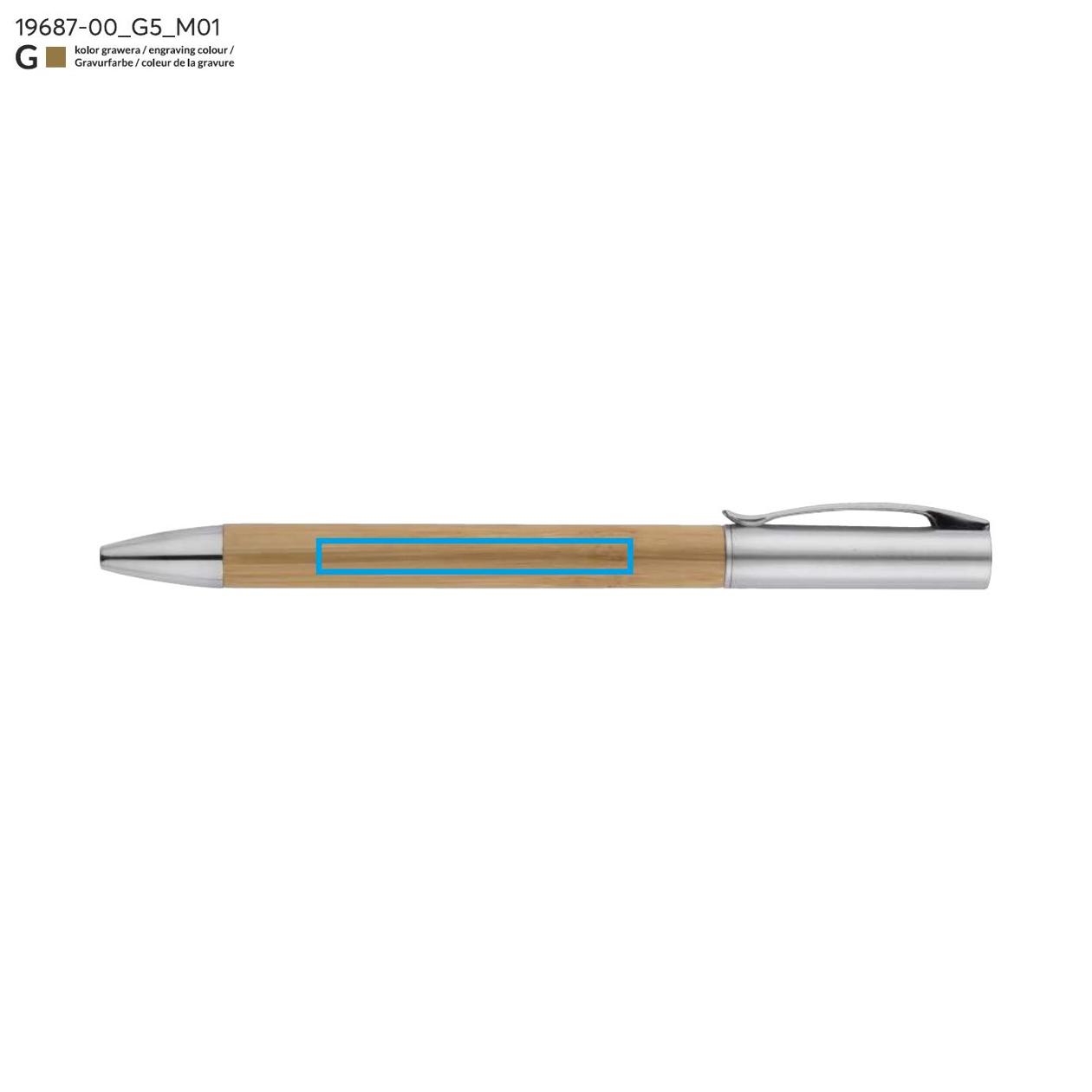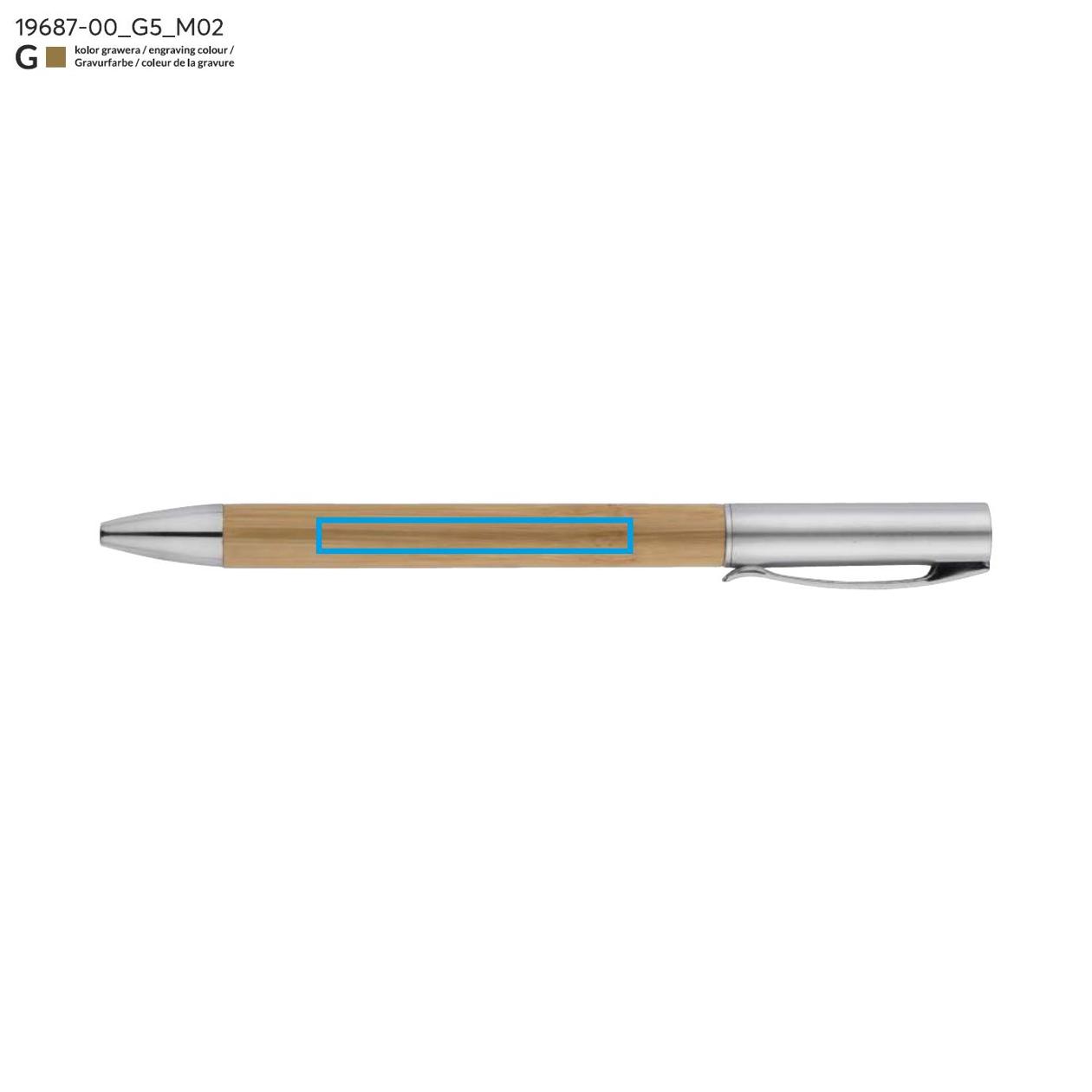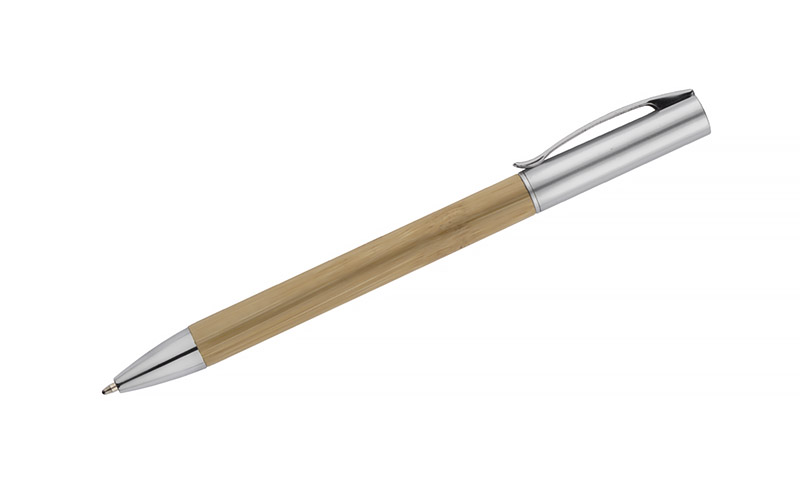Elegancki długopis z bambusowym korpusem. Długopis jest wykończony metalowym klipsem i elementami w kolorze srebrnym.