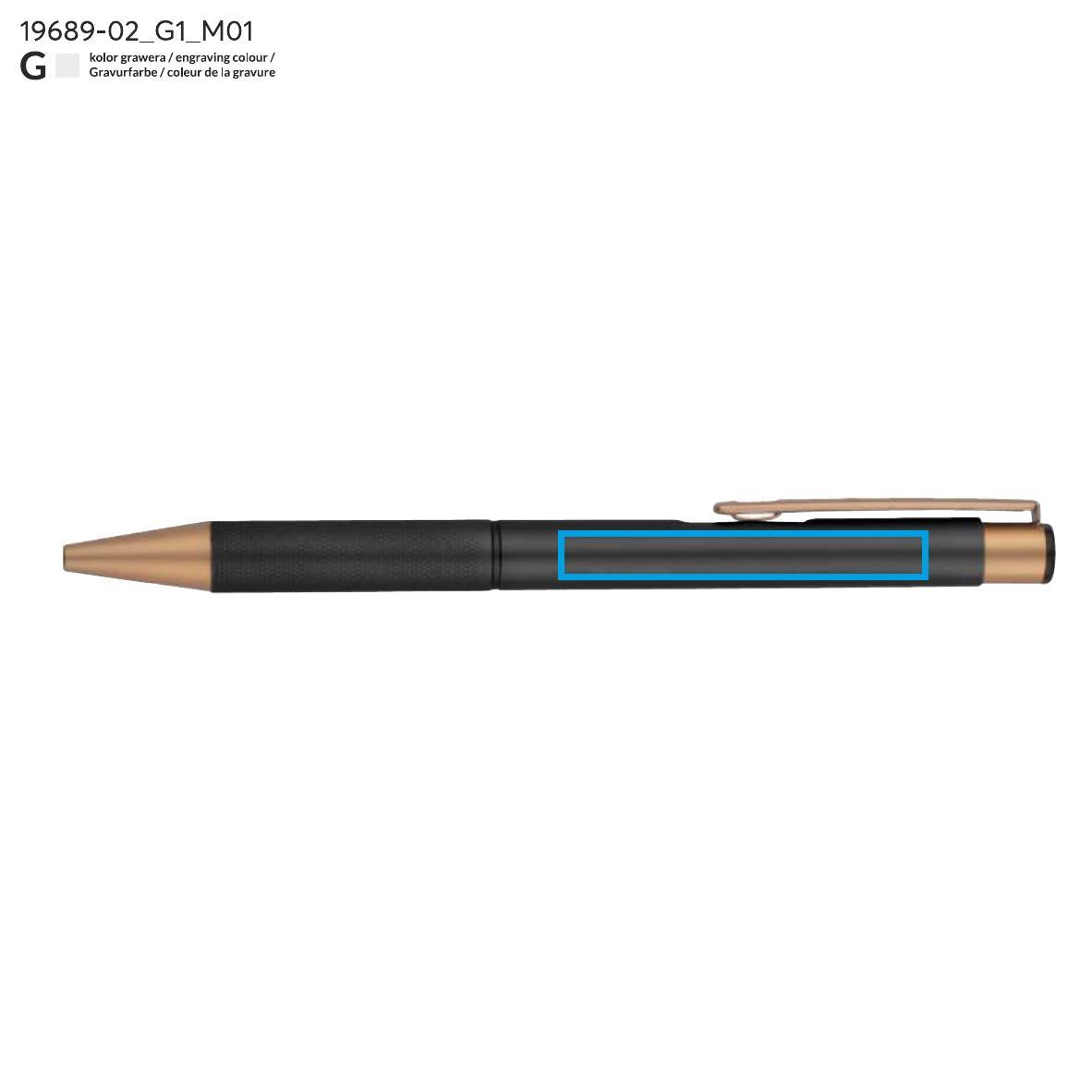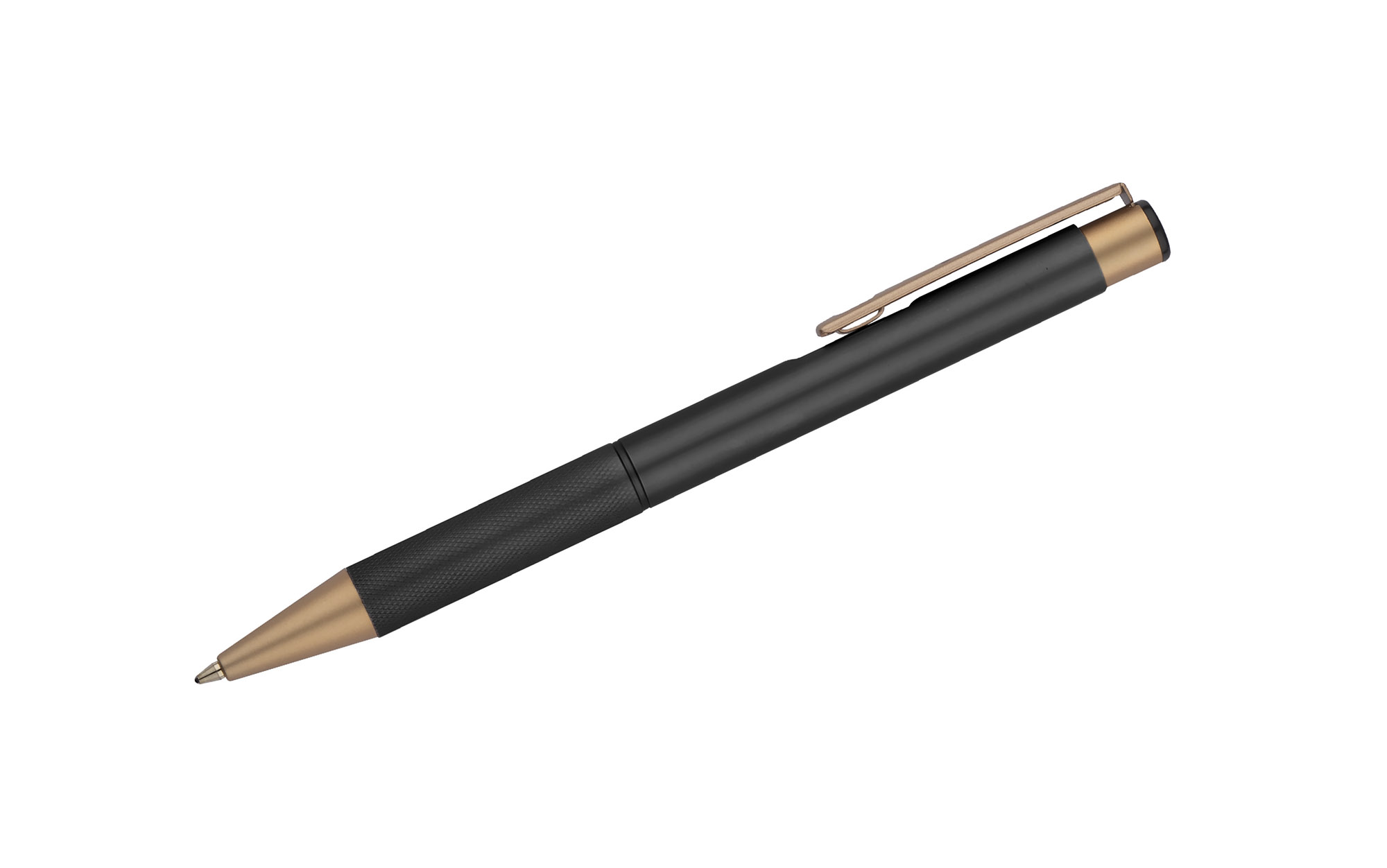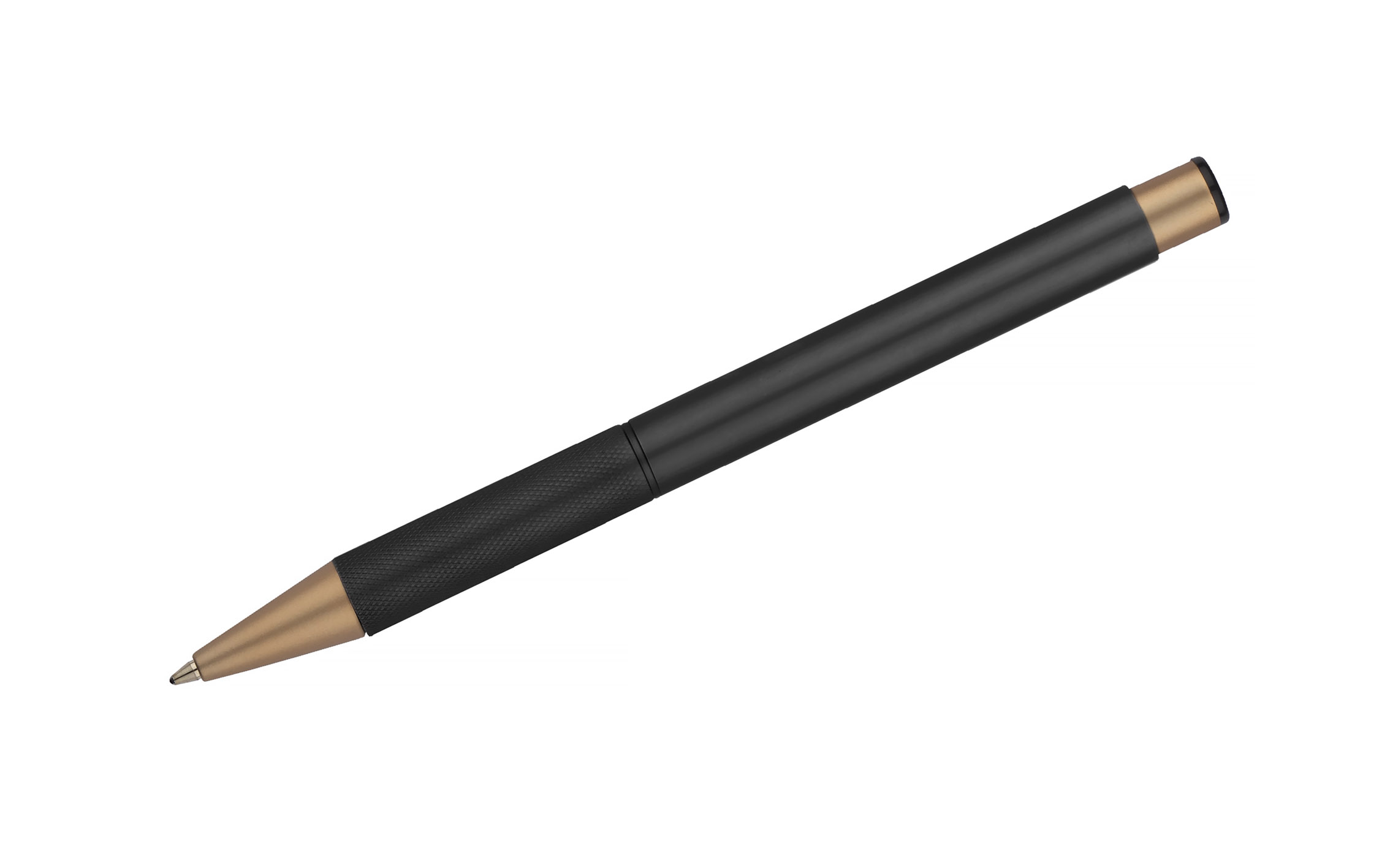 Elegancki aluminiowy długopis. Wykończenia w kolorze złotym. Wkład półżelowy w kolorze niebieskim.