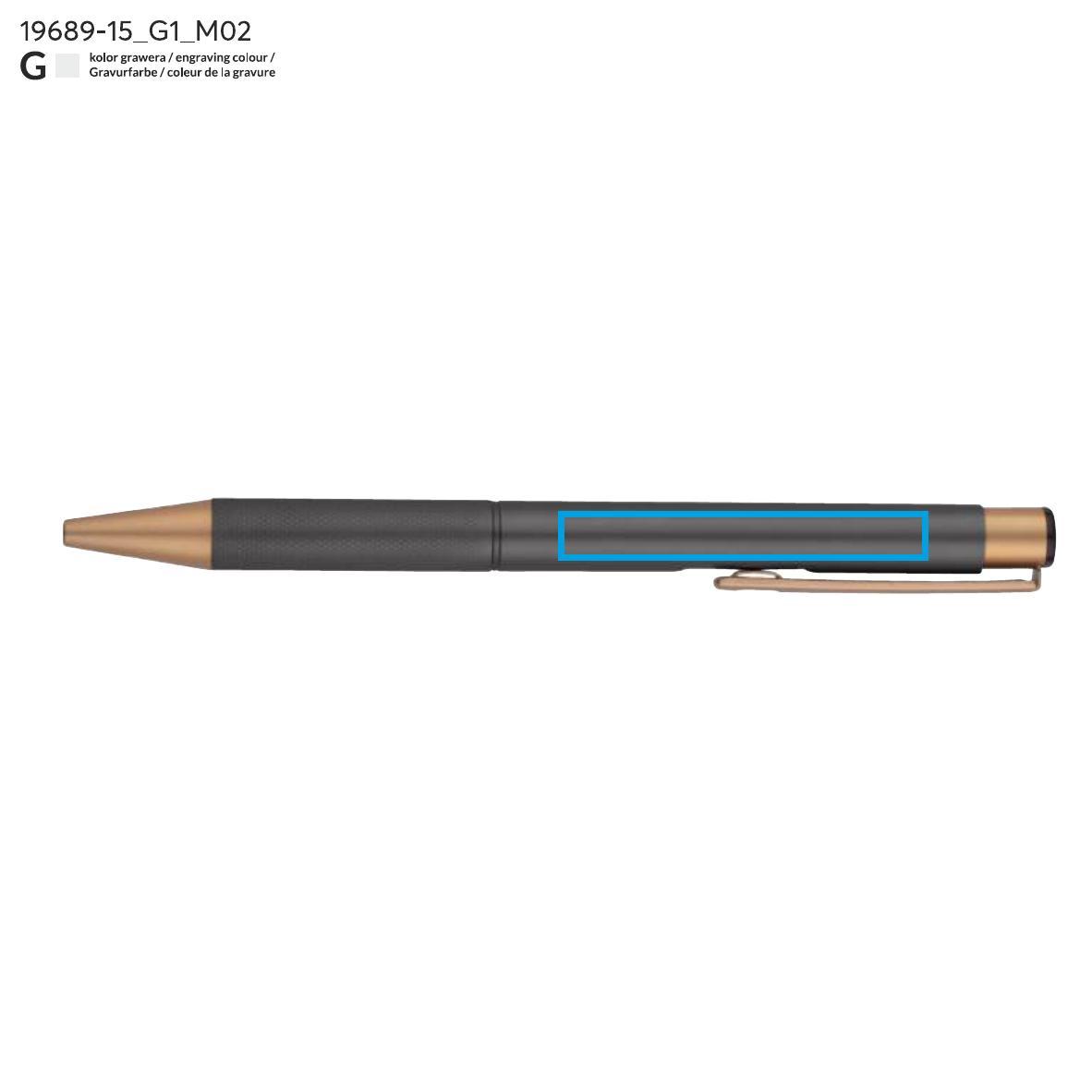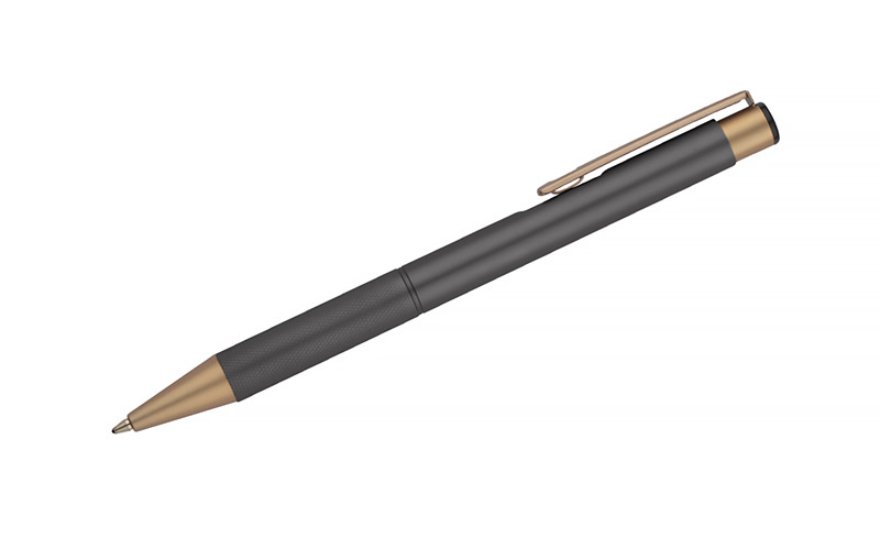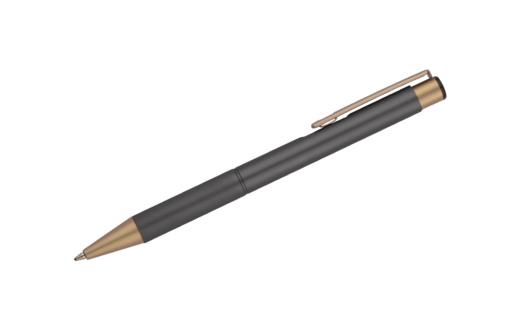 Elegancki aluminiowy długopis. Wykończenia w kolorze złotym. Wkład półżelowy w kolorze niebieskim.