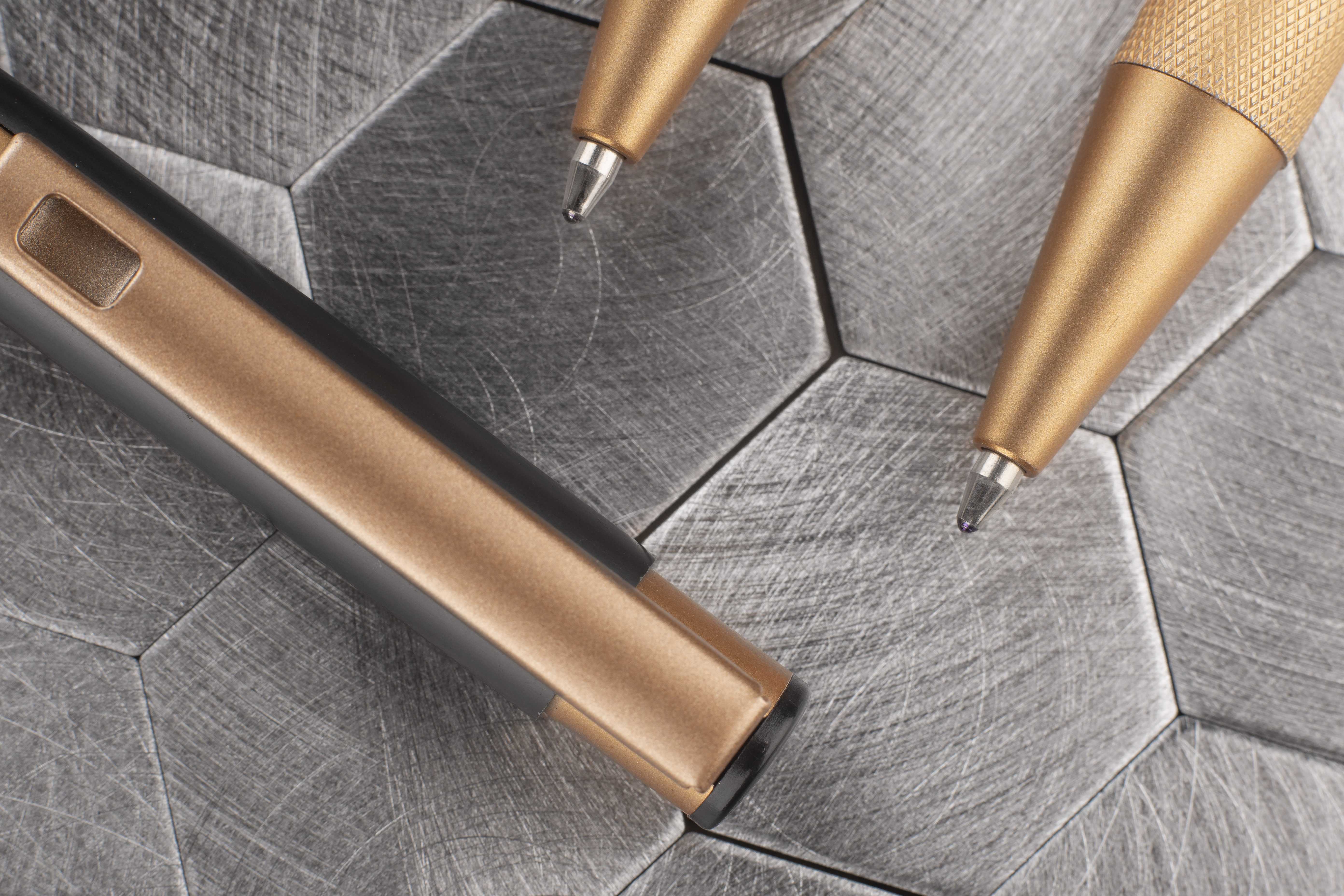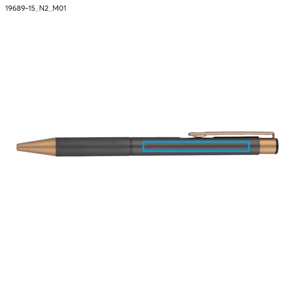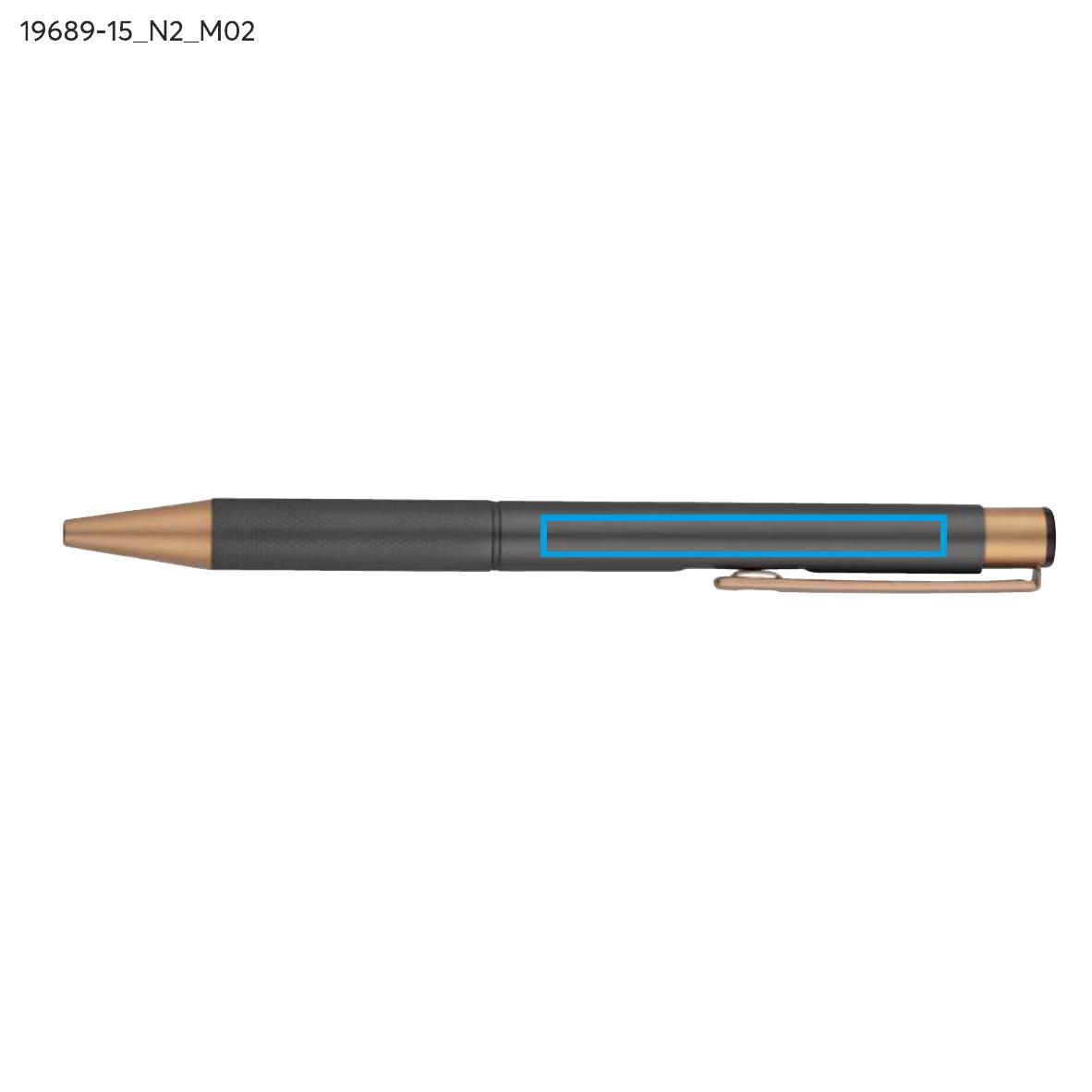 Elegancki aluminiowy długopis. Wykończenia w kolorze złotym. Wkład półżelowy w kolorze niebieskim.