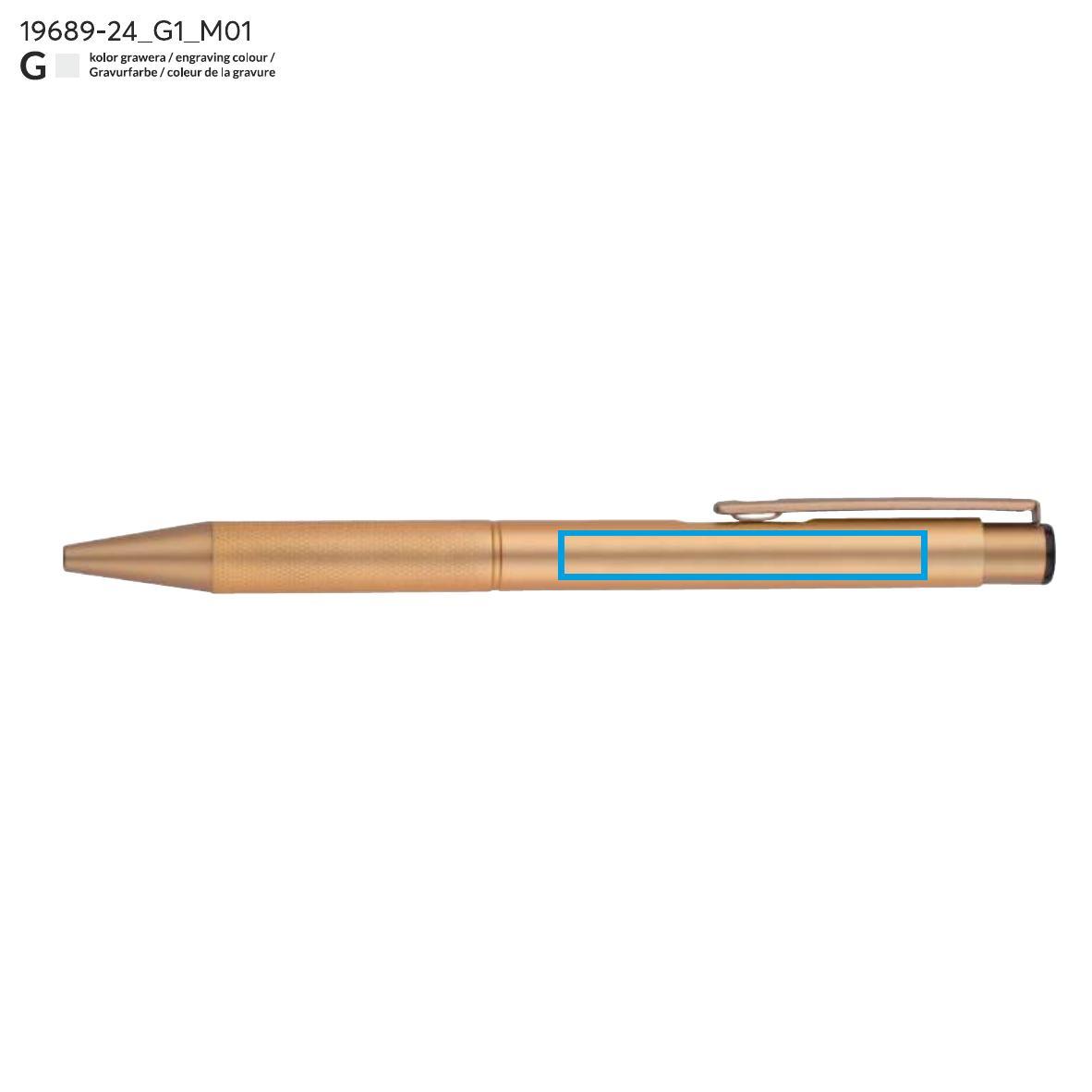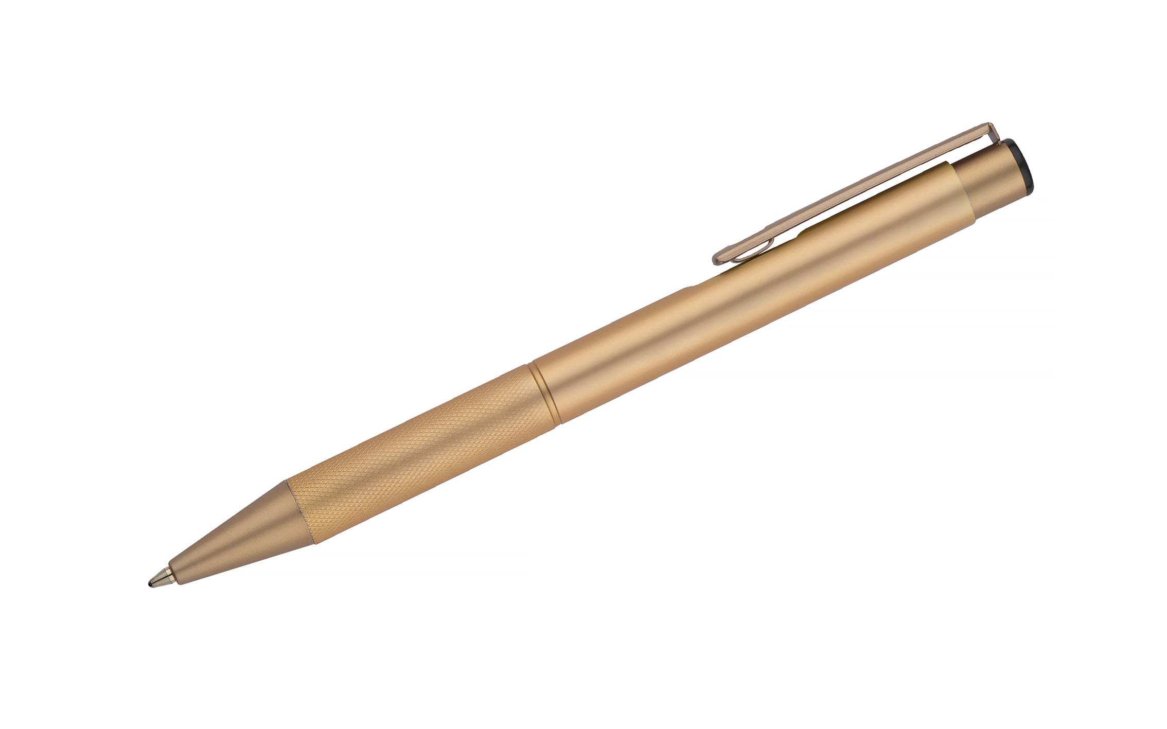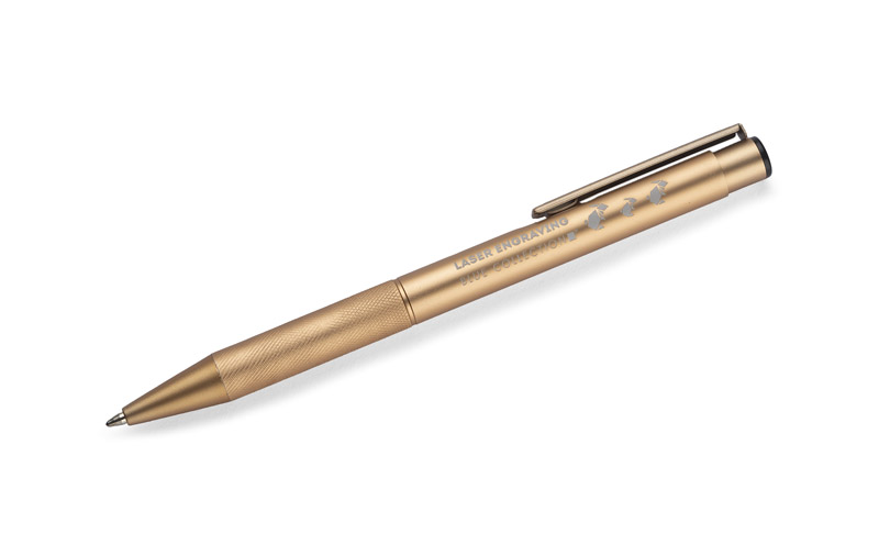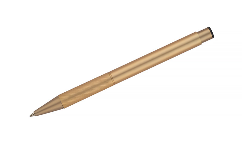 Elegancki aluminiowy długopis. Wykończenia w kolorze złotym. Wkład półżelowy w kolorze niebieskim.