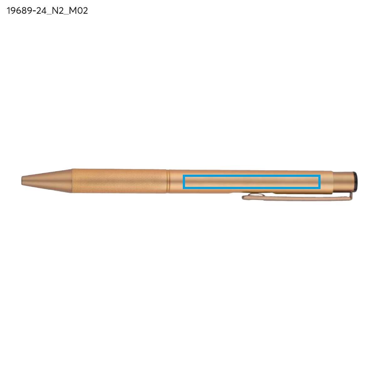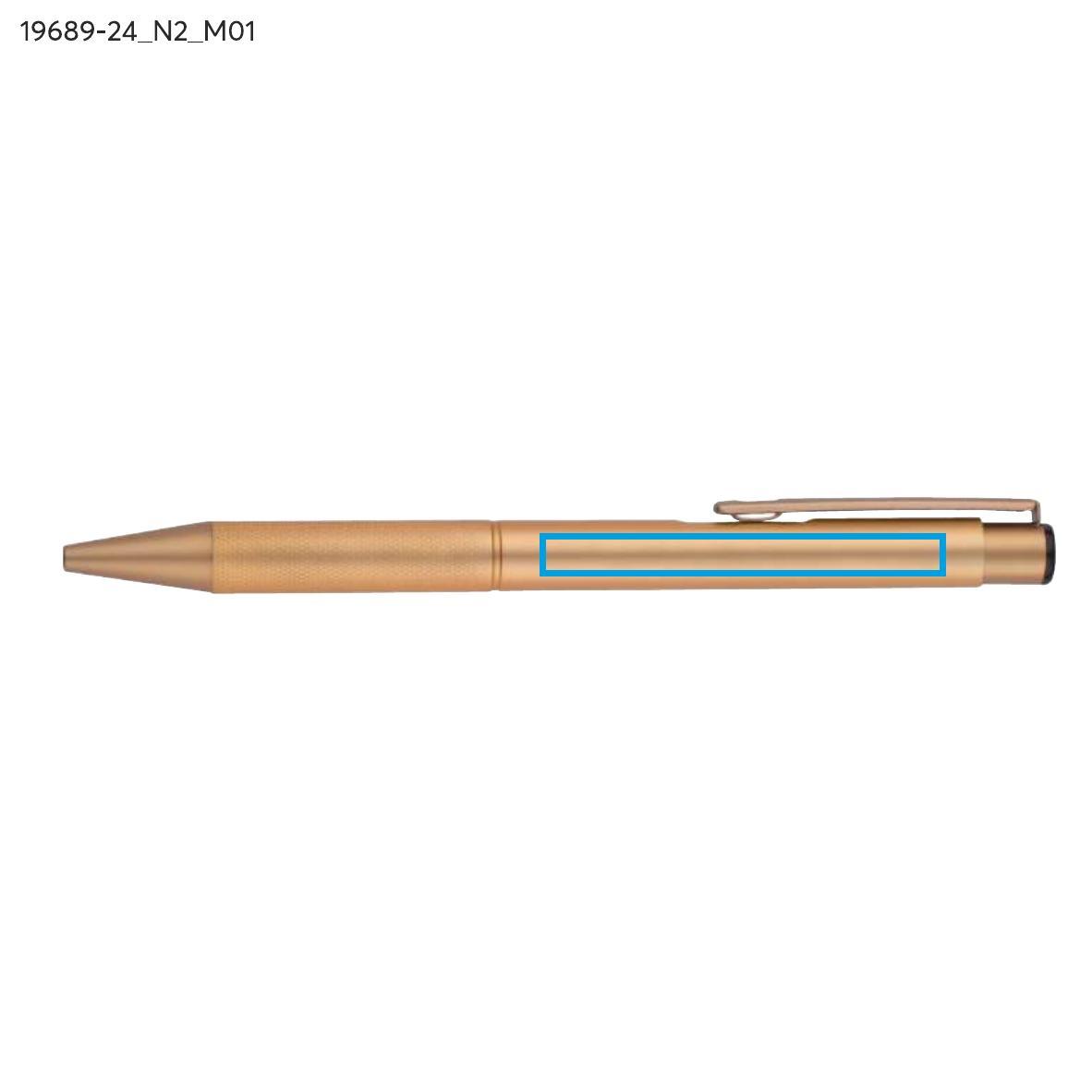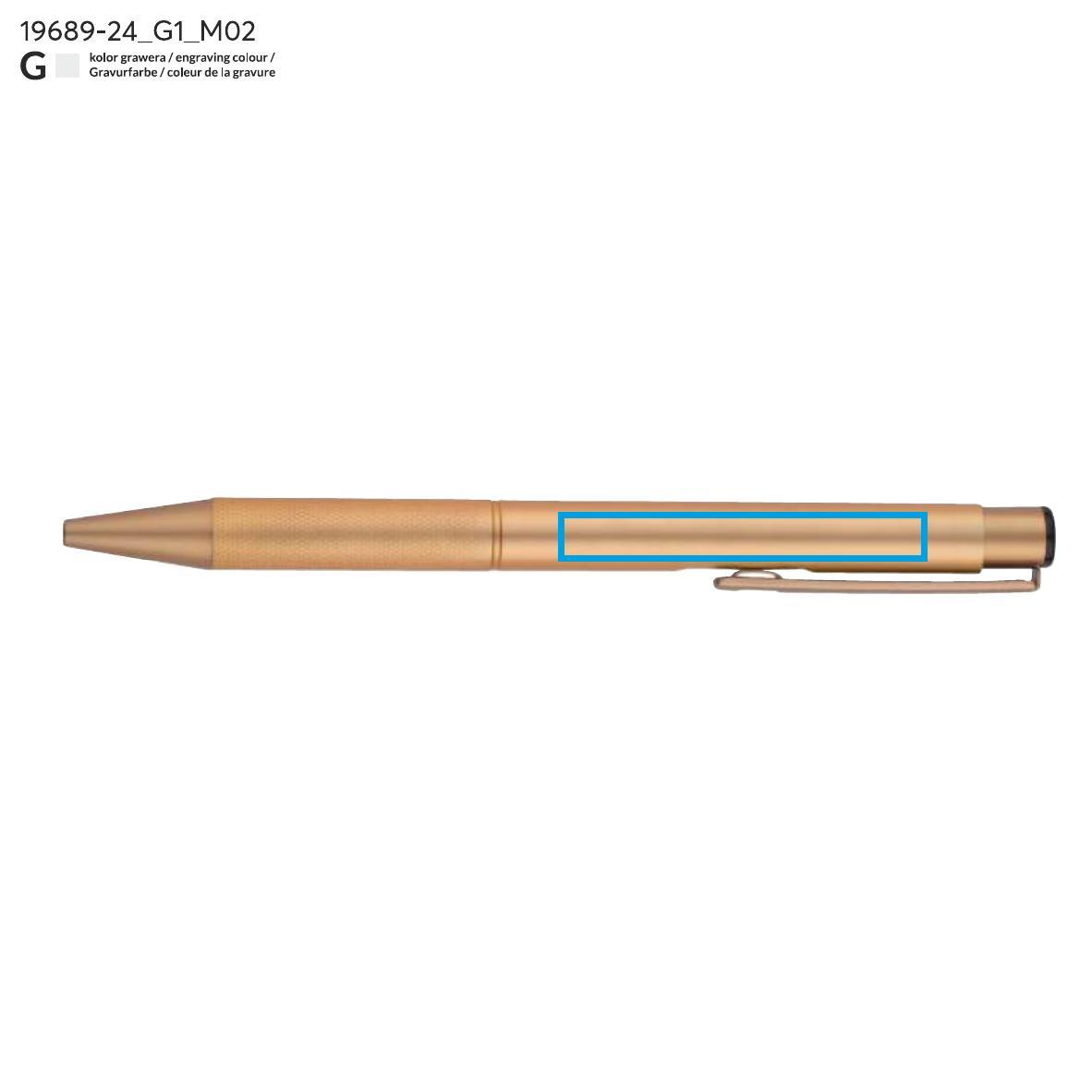 Elegancki aluminiowy długopis. Wykończenia w kolorze złotym. Wkład półżelowy w kolorze niebieskim.