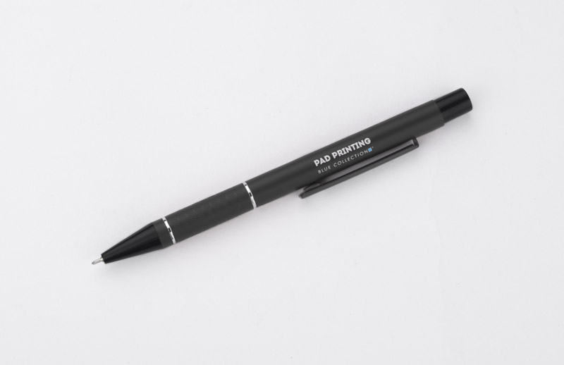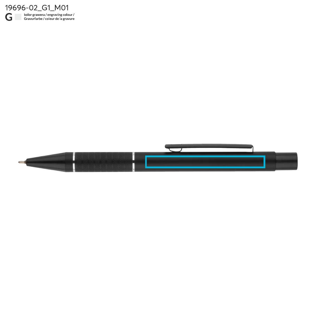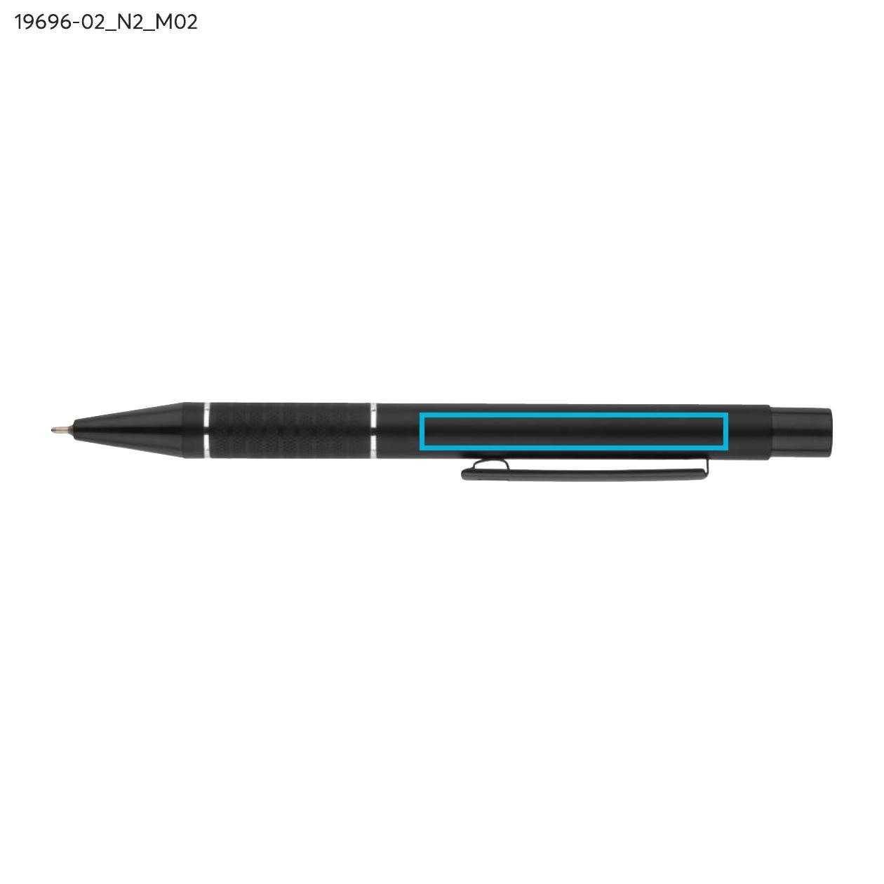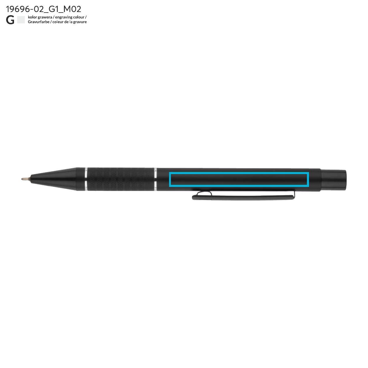 Długopis SATO łączy w sobie niezawodność, piękno i funkcjonalność. Wykonany jest z lekkiego aluminium, a czarne wykończenie nadaje mu elegancji i prestiżu, sprawiając, że doskonale sprawdzi się jako produkt reklamowy w każdej branży. Korpus długopisu został ozdobiony dwoma srebrnymi ringami oraz paskami o delikatnie chropowatej strukturze, dodając mu przyjemnie sensorycznego wymiaru. Wkład z tuszem pół żelowym zapewnia niesamowicie gładkie i płynne pisanie. Grubość linii 0,7 mm pozwoli użytkownikom cieszyć się wyjątkowo precyzyjnymi notatkami, podkreśleniami i listami.