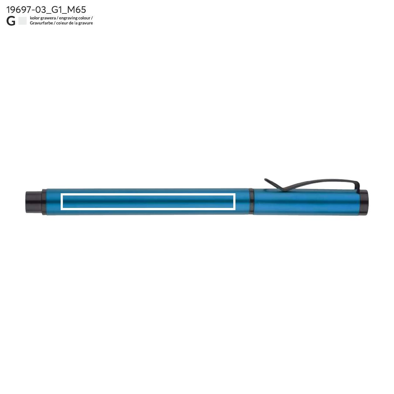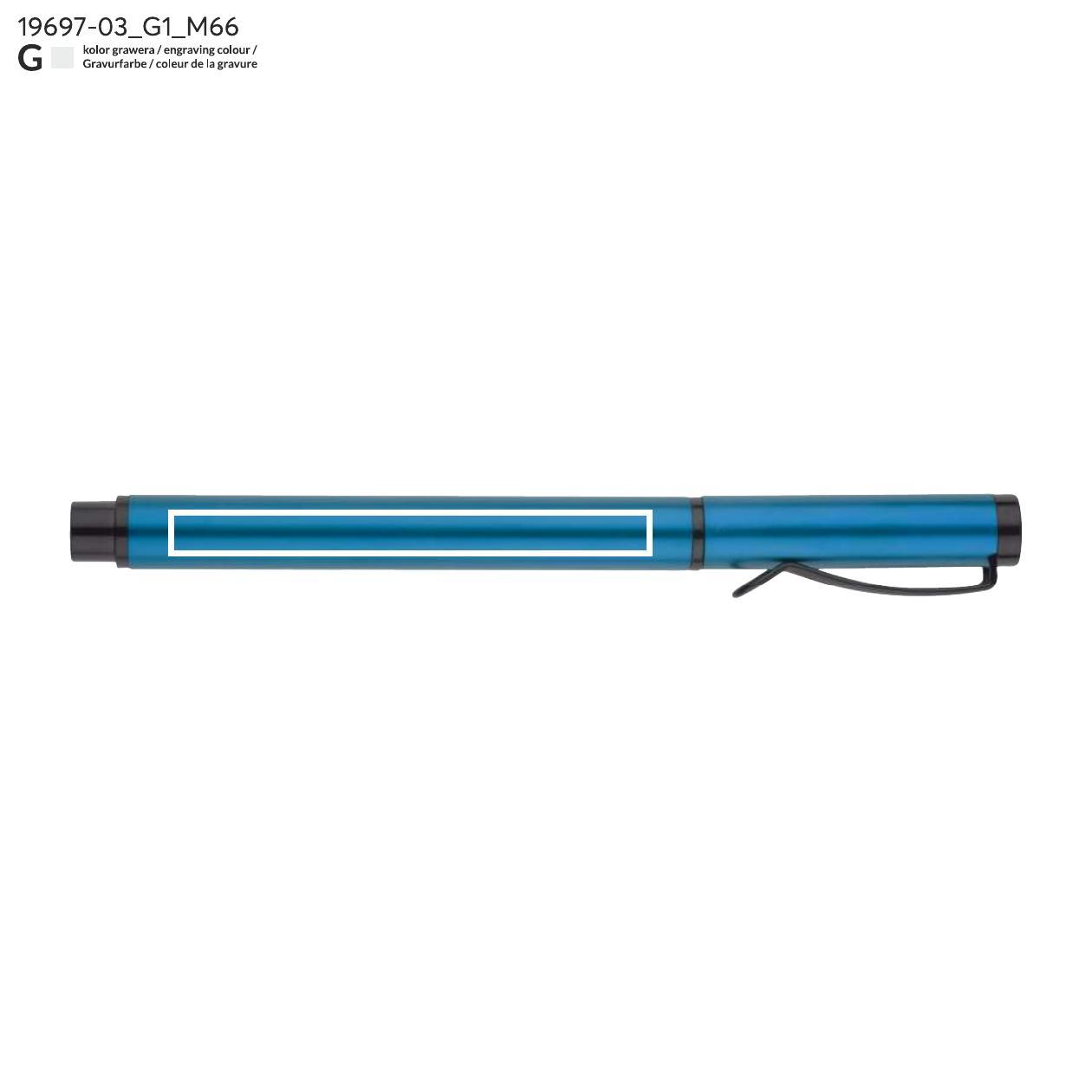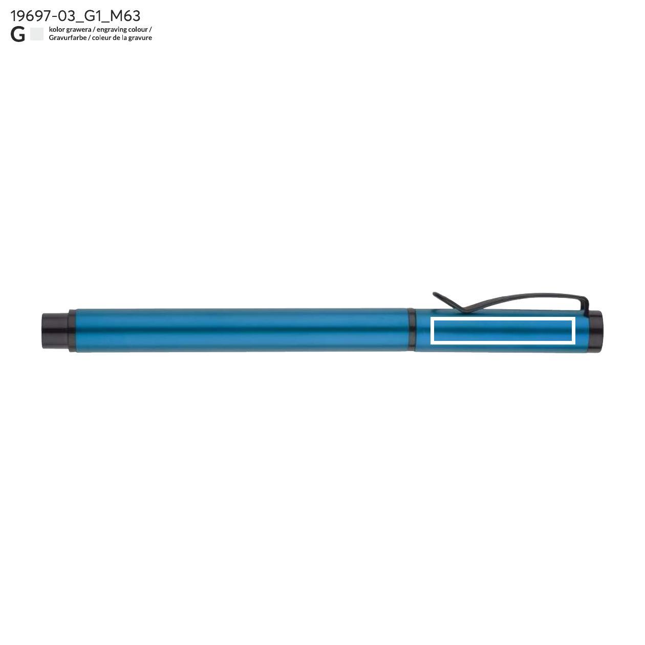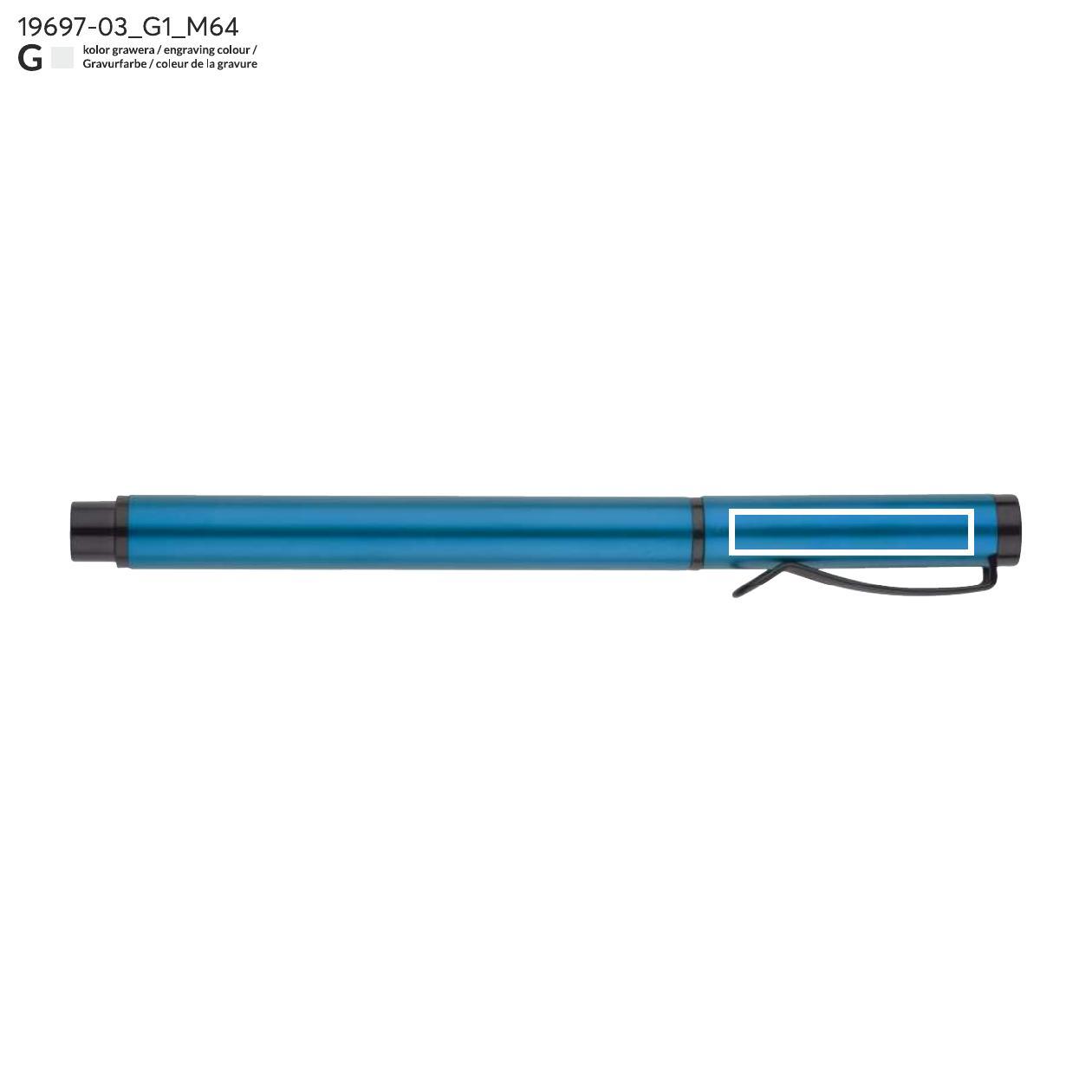 Długopis CHEN to oryginalny i niezwykle elegancki produkt wykonany z lekkiego aluminium. Wykończenie w kolorze czarnym gustownie dopełnia wyraziste kolory korpusu, a unikalna w formie zatyczka z niestandardowym klipem nadaje temu długopisowi niepowtarzalny charakter. Wkład żelowy w kolorze niebieskim o grubości linii 0,5 mm zapewnia płynność pisania.