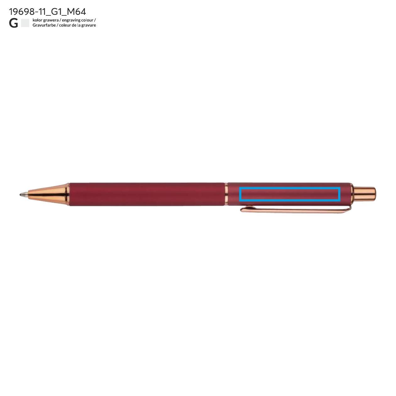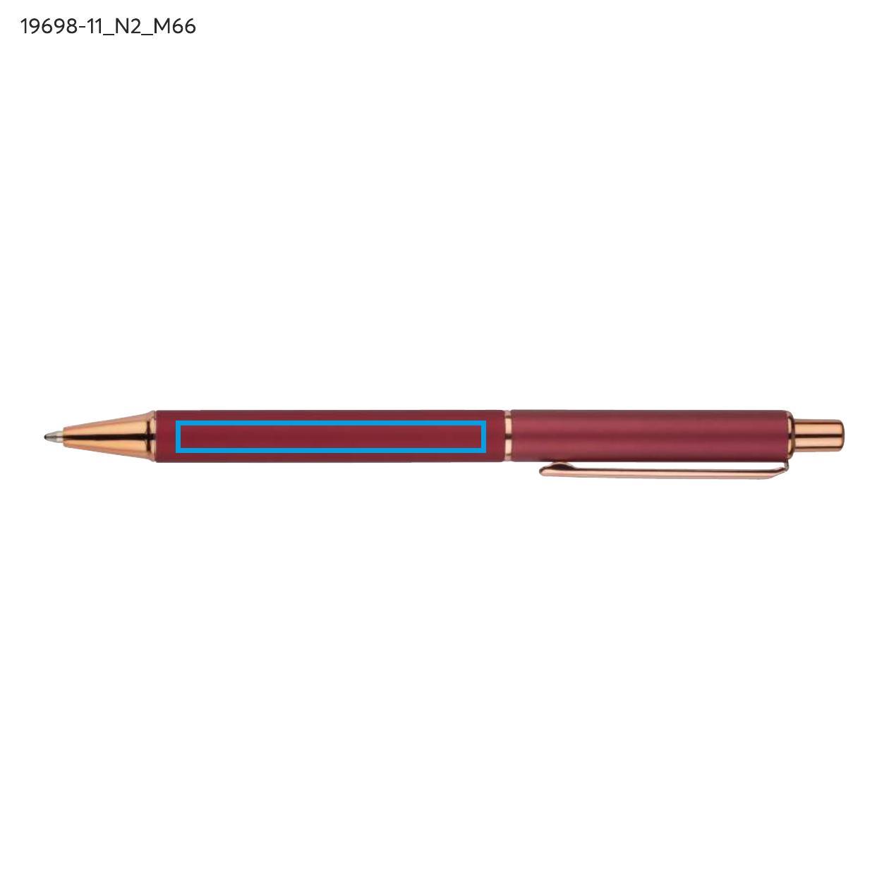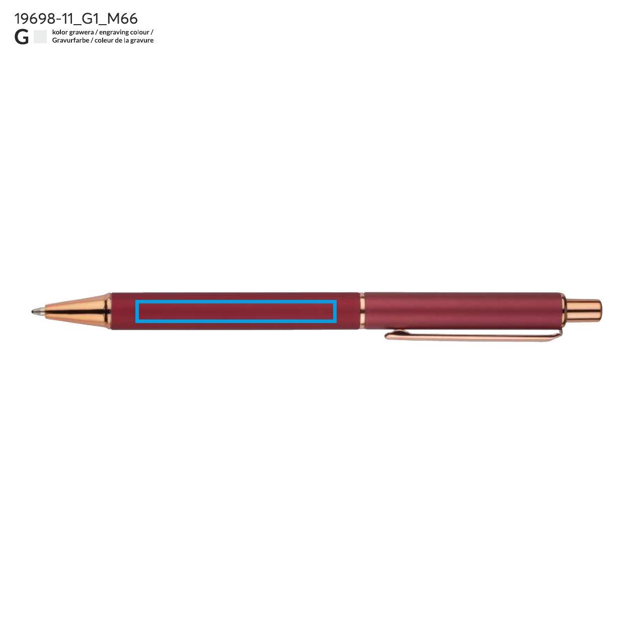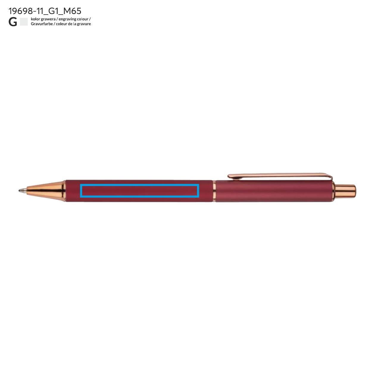 Matowy długopis z akcentami w kolorze różowego złota. Korpus oraz klips wykonane z metalu.