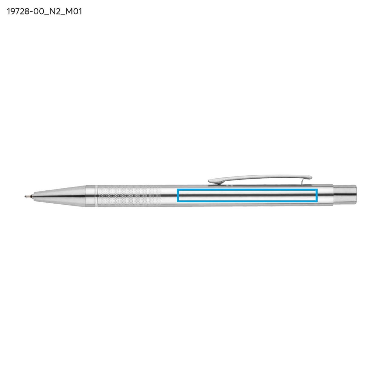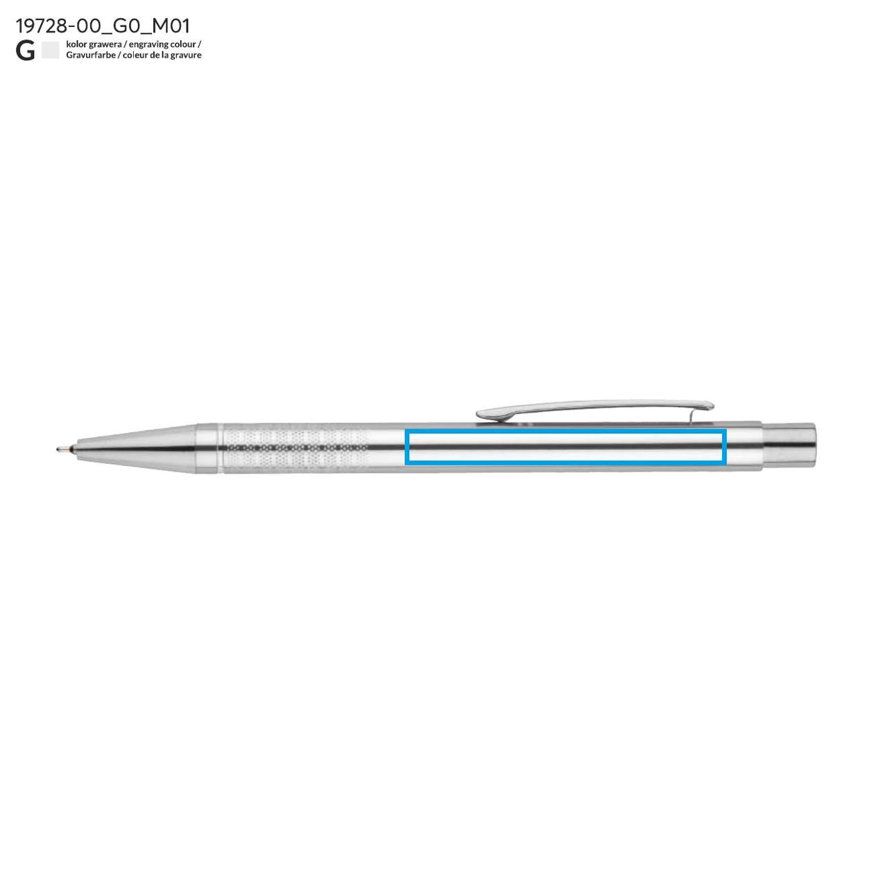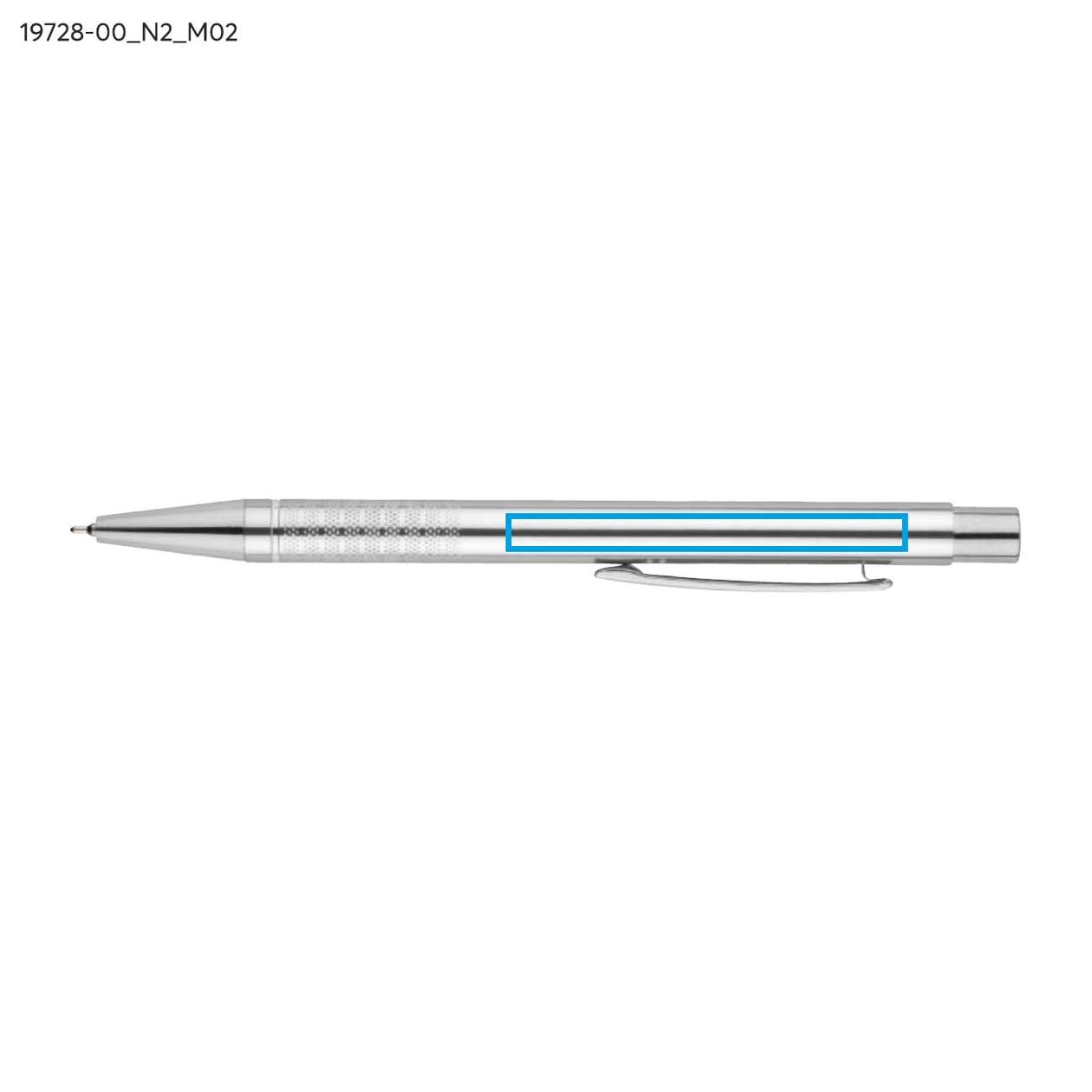 Długopis BONITO to elegancki metalowy długopis w metalicznych kolorach z chromowanymi wykończeniami. Wykonany z wysokiej jakości aluminium, korpus długopisu ozdobiony jest srebrnym ringiem oraz paskami o delikatnie chropowatej strukturze. Długopis wyposażony jest w wkład z tuszem półżelowym w kolorze czarnym o grubości 0,7 mm.