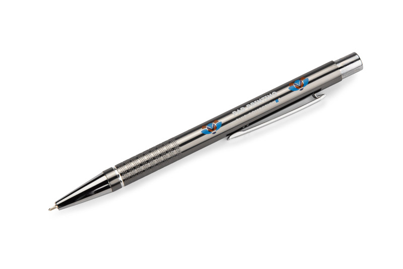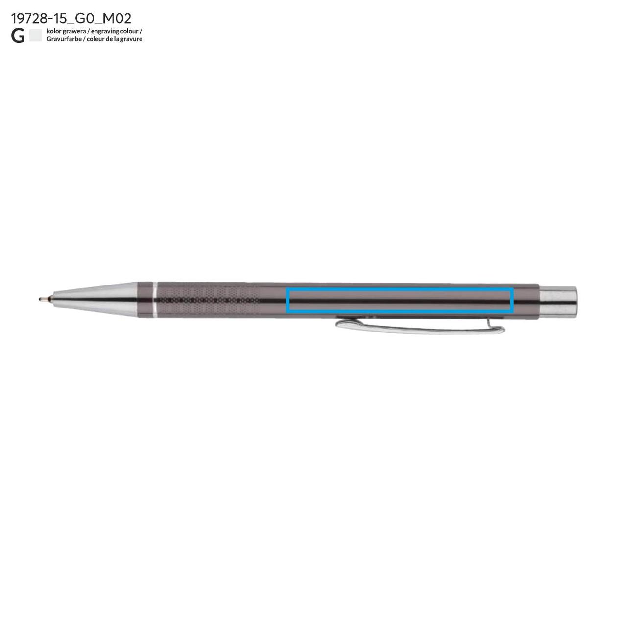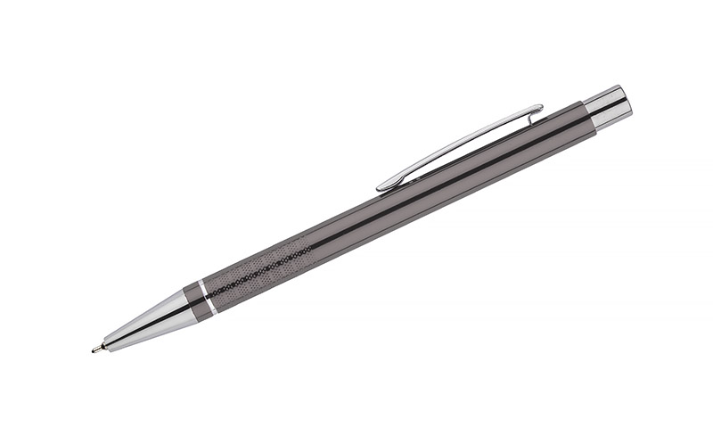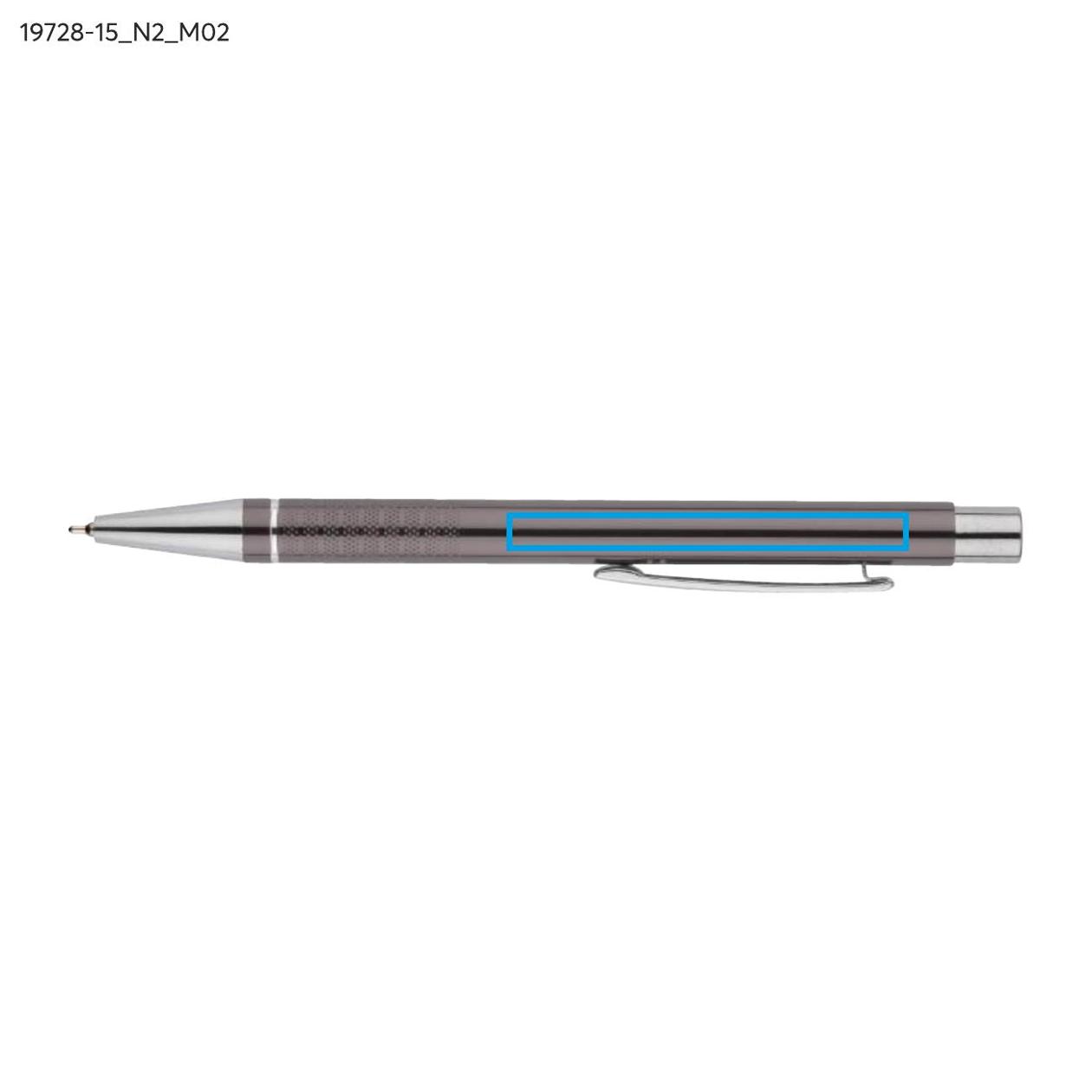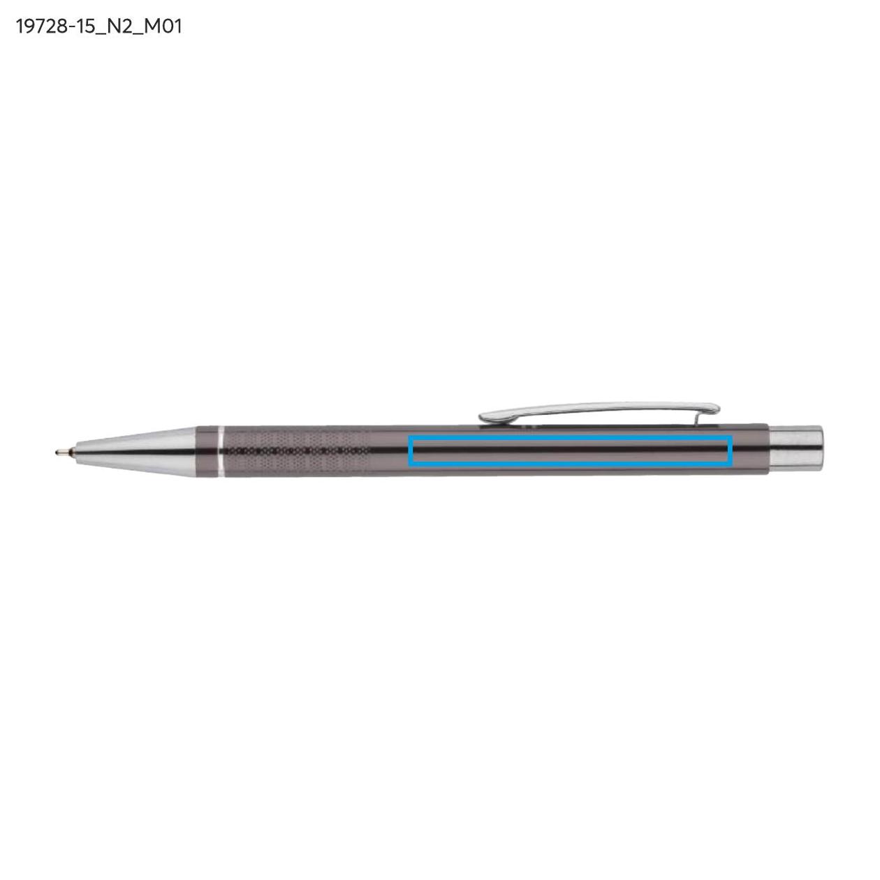 Długopis BONITO to elegancki metalowy długopis w metalicznych kolorach z chromowanymi wykończeniami. Wykonany z wysokiej jakości aluminium, korpus długopisu ozdobiony jest srebrnym ringiem oraz paskami o delikatnie chropowatej strukturze. Długopis wyposażony jest w wkład z tuszem półżelowym w kolorze czarnym o grubości 0,7 mm.