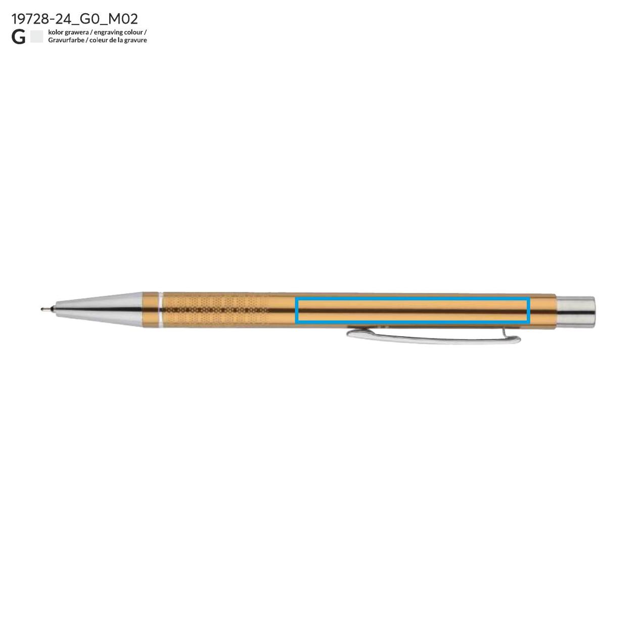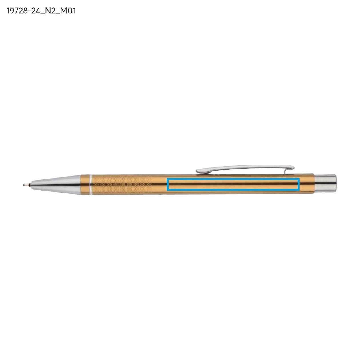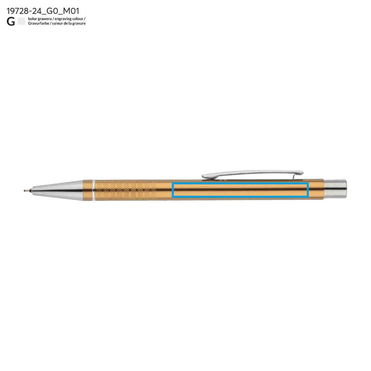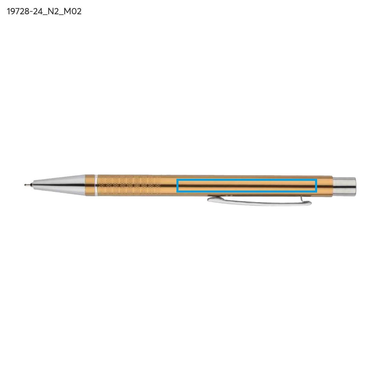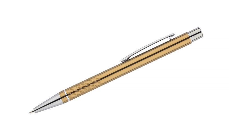 Długopis BONITO to elegancki metalowy długopis w metalicznych kolorach z chromowanymi wykończeniami. Wykonany z wysokiej jakości aluminium, korpus długopisu ozdobiony jest srebrnym ringiem oraz paskami o delikatnie chropowatej strukturze. Długopis wyposażony jest w wkład z tuszem półżelowym w kolorze czarnym o grubości 0,7 mm.