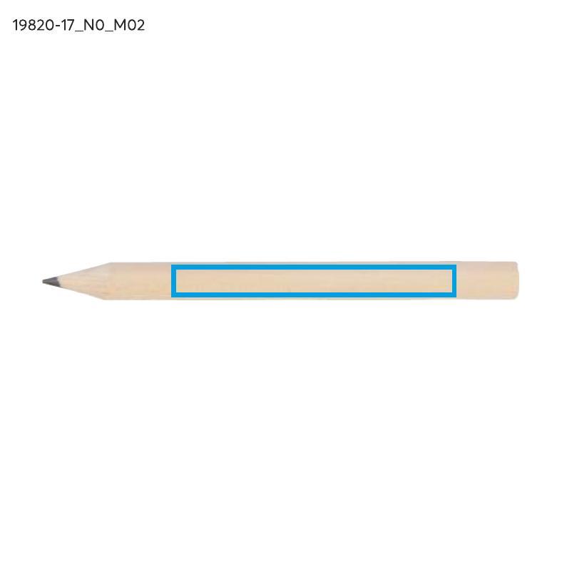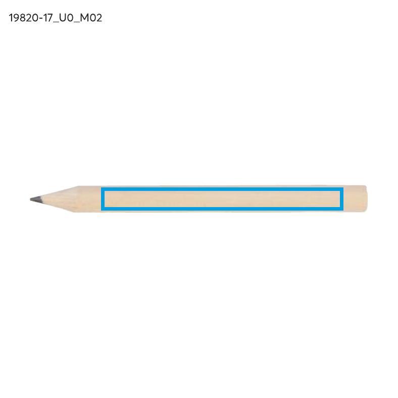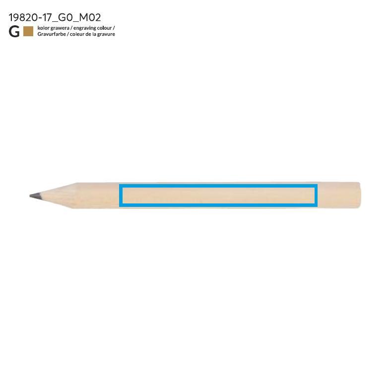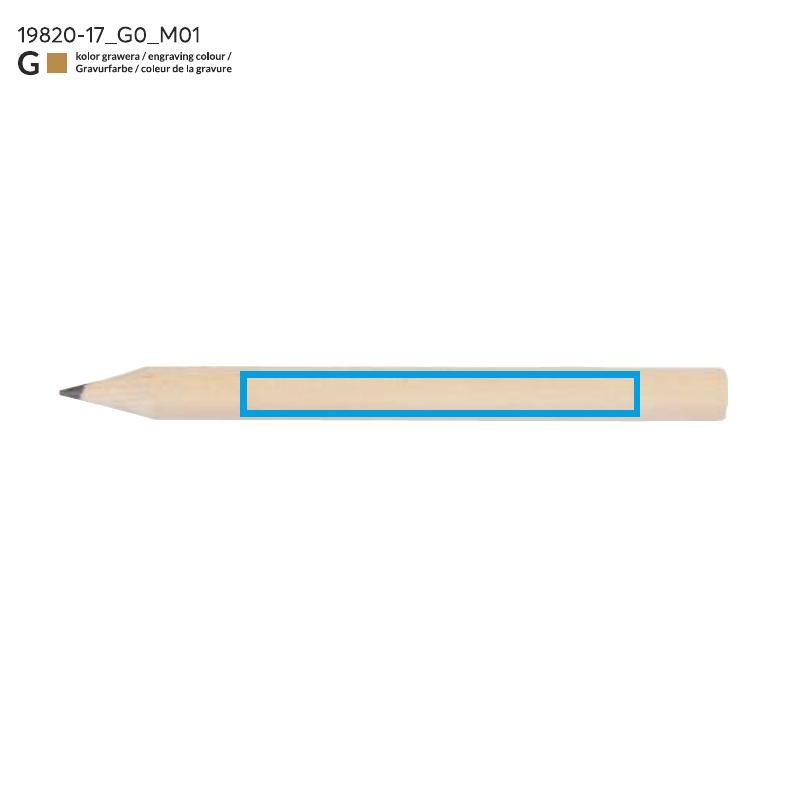 Krótki, drewniany ołówek IKKO z szeroką możliwością znakowania. Długość 8,5 cm. Ołówek zatemperowany.