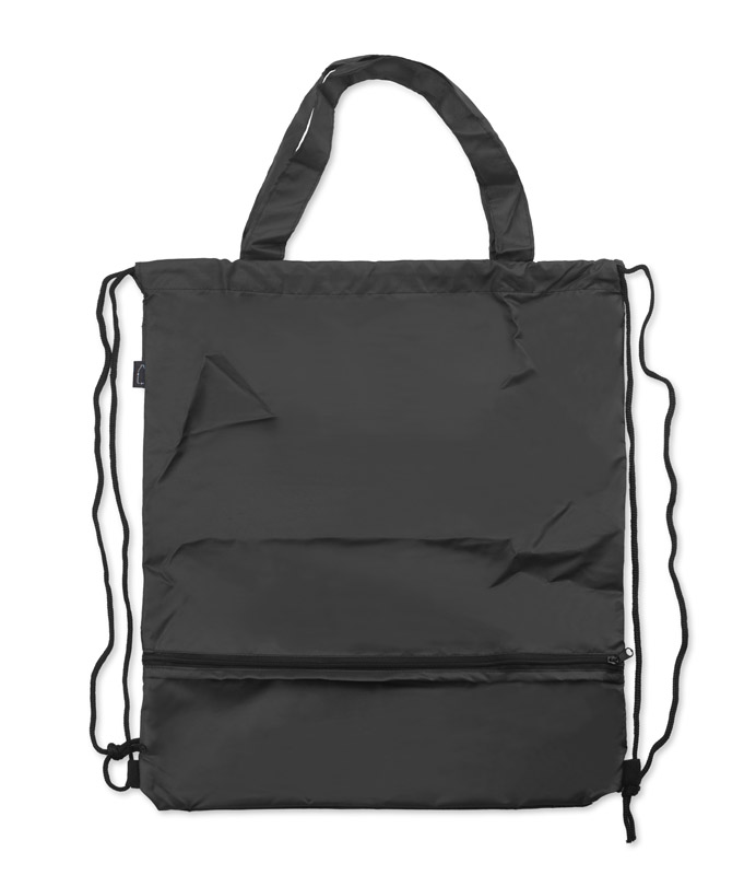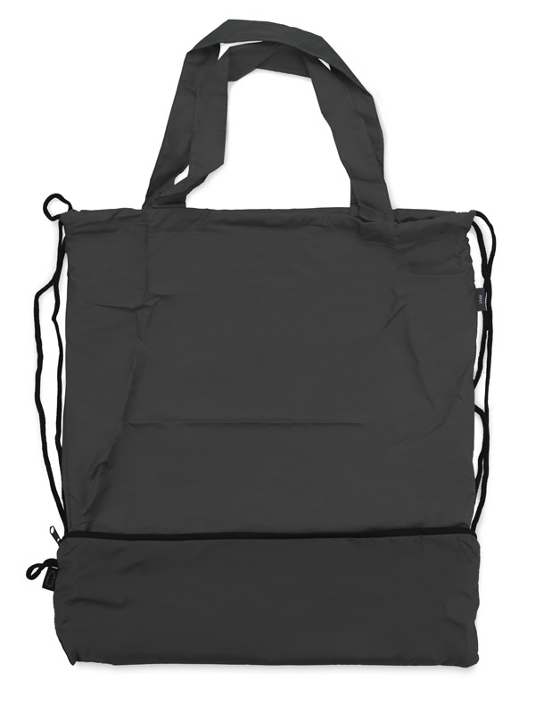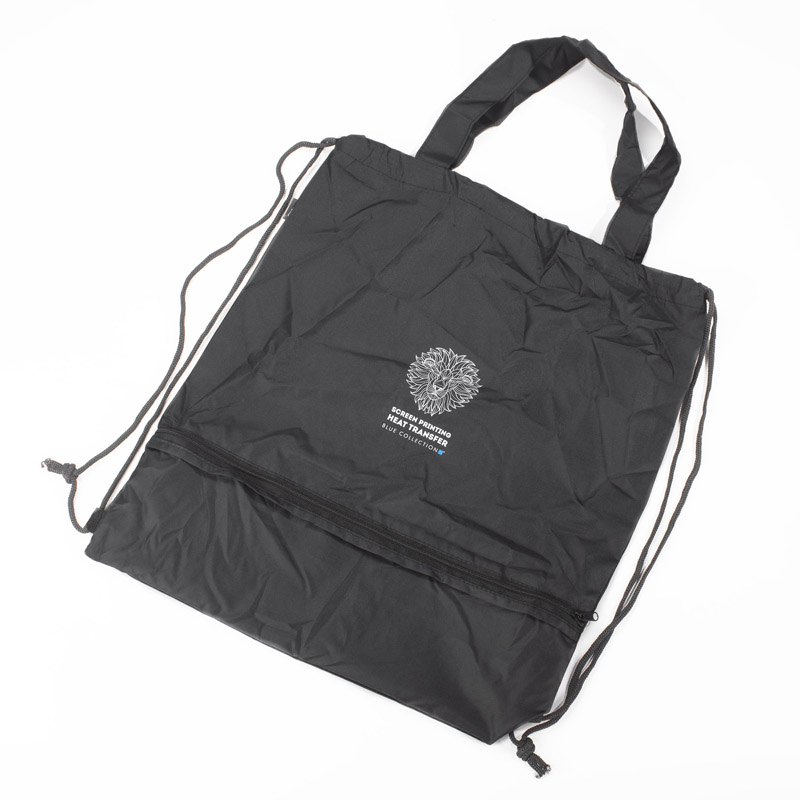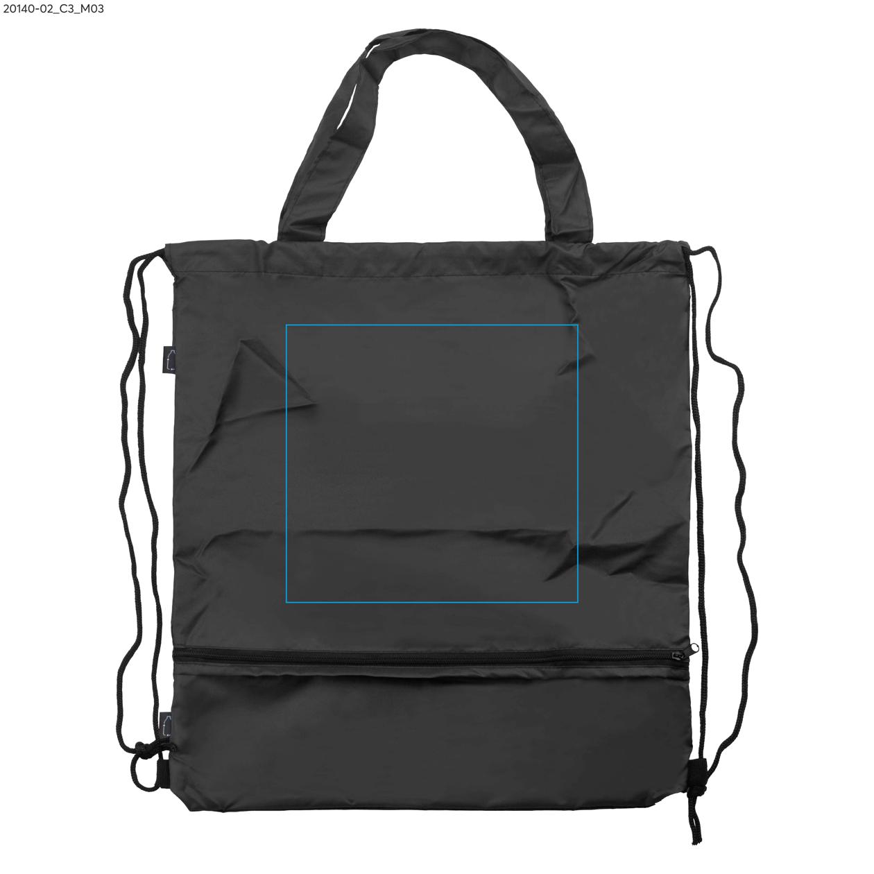 Worek na sznurkach z parasolem RAINY wykonany jest z poliestru RPET, co czyni go bardziej przyjaznym środowisku. Środek worka jest jednokomorowy. Oprócz tradycyjnych sznurków posiada jeszcze rączki o długości 44 cm, dzięki czemu może być używany także jako torba na zakupy. Na dole worka znajduje się zamykana na zamek kieszeń, w której schowany jest dołączony do zestawu parasol, także wykonany z poliestru RPET. Parasol jest otwierany i zamykany ręcznie. Maksymalny udźwig worka to około 3 kg.