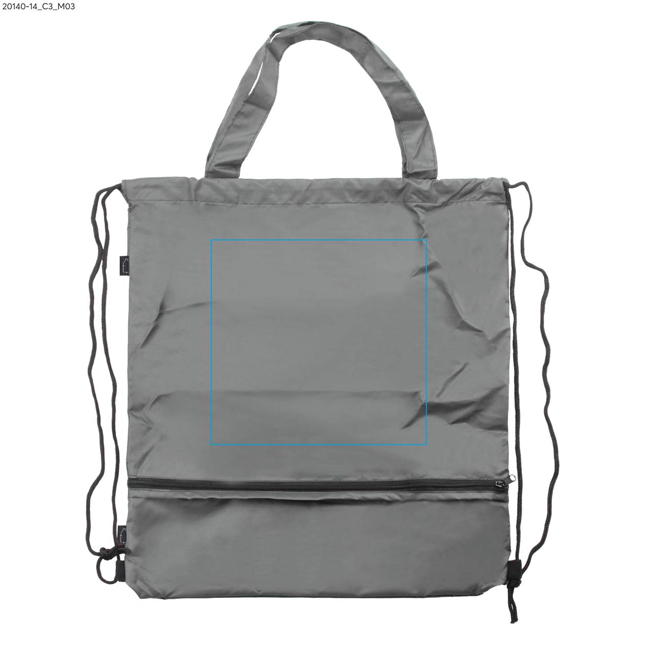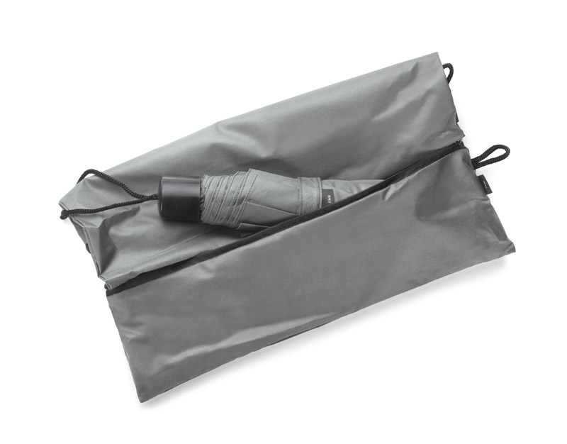 Worek na sznurkach z parasolem RAINY wykonany jest z poliestru RPET, co czyni go bardziej przyjaznym środowisku. Środek worka jest jednokomorowy. Oprócz tradycyjnych sznurków posiada jeszcze rączki o długości 44 cm, dzięki czemu może być używany także jako torba na zakupy. Na dole worka znajduje się zamykana na zamek kieszeń, w której schowany jest dołączony do zestawu parasol, także wykonany z poliestru RPET. Parasol jest otwierany i zamykany ręcznie. Maksymalny udźwig worka to około 3 kg. Wymiary produktu: worek: 370 x 410 mm, parasol: ⌀ 990 mm, dł. 550 mm (złożony: 240 x 60 x 50 mm)