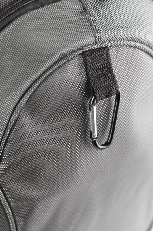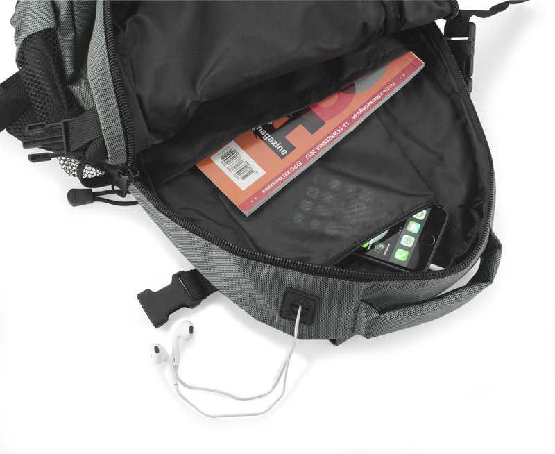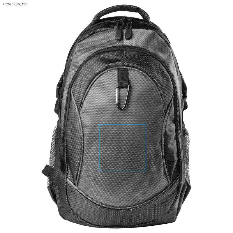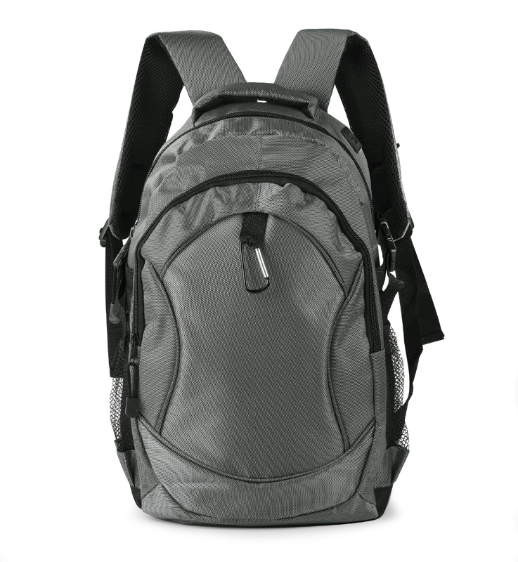 Profesjonalny plecak turystyczny wykonany z niezwykle mocnego poliestru 1680D wzmocnionego technologią RIP-STOP, która dodatkowo czyni materiał wyjątkowo odpornym na rozdarcia. Wzmocniona wodoodporność materiału pozwala na swobodne podróżowanie także przy niesprzyjającej pogodzie. Komora główna z kieszenią na plecach i małą kieszonką na zamek oraz z otworem na przewód słuchawkowy. 1 kieszeń przednia oraz 2 boczne kieszenie siateczkowe. Plecak ściągany paskami bocznymi, wyposażony w karabińczyk. Szelki z grubą gąbką, od spodu wykończone siateczką. Usztywniane plecy. Plecak łączy w sobie funkcjonalność, wygodę użytkowania oraz wysoką jakość wykonania. Znakowanie haftem jest możliwe, ale wyłącznie pod indywidualne zapytanie.