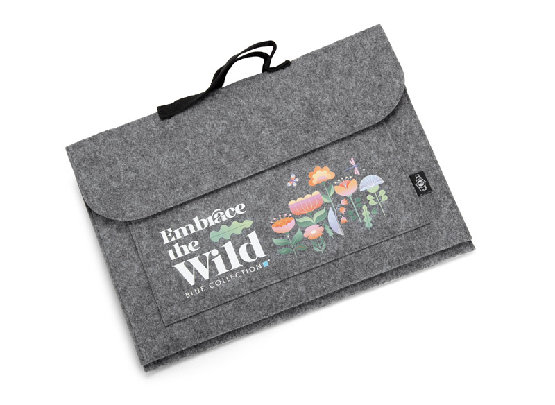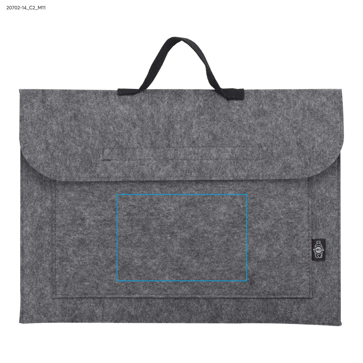 Stylowe etui na laptop TARO wykonane z recyklingowanego filcu rPET. Etui jest poręczne i lekkie mieszczące laptop 15”. Dodatkowa kieszeń umożliwia przechowywanie dokumantów, czy drobiazgów. Uchwyt ułatwia wygodne przenoszenie. Zamykane na rzep.