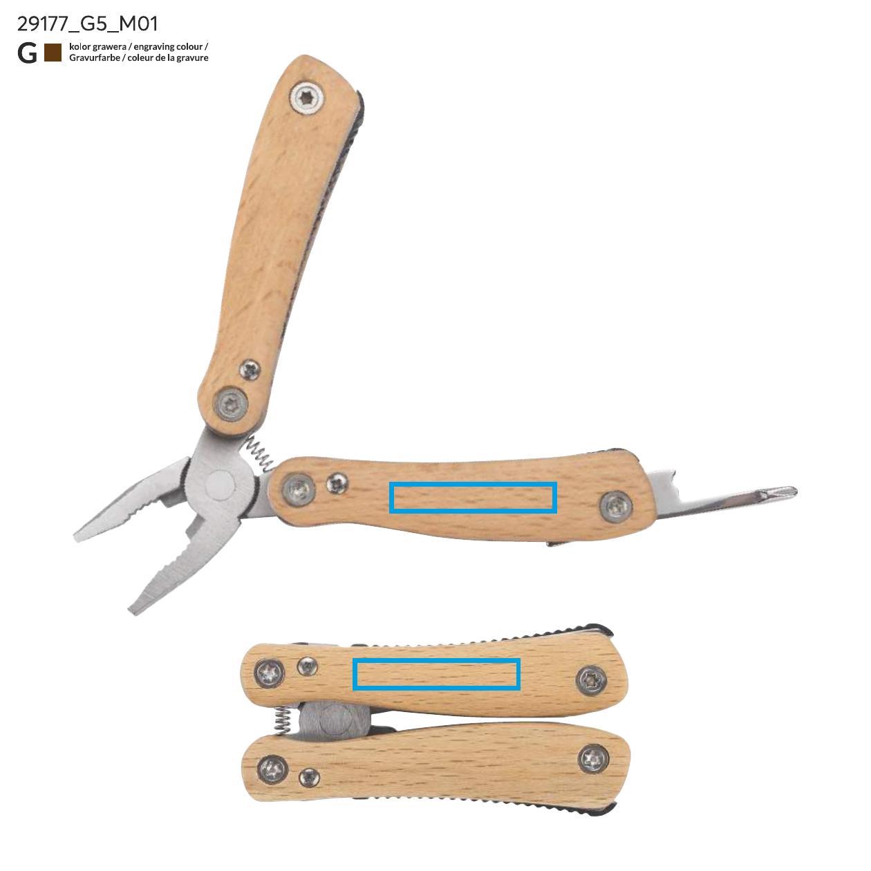 Narzędzie wielofunkcyjne FORT to gadżet w kieszonkowym rozmiarze, wykończony drewnem. Funkcje: kombinerki, przecinak, nóż, śrubokręt płaski i krzyżowy, pilnik, piła, otwieracz do butelek i puszek. W komplecie znajduje się również czarny, materiałowy pokrowiec na narzędzie.