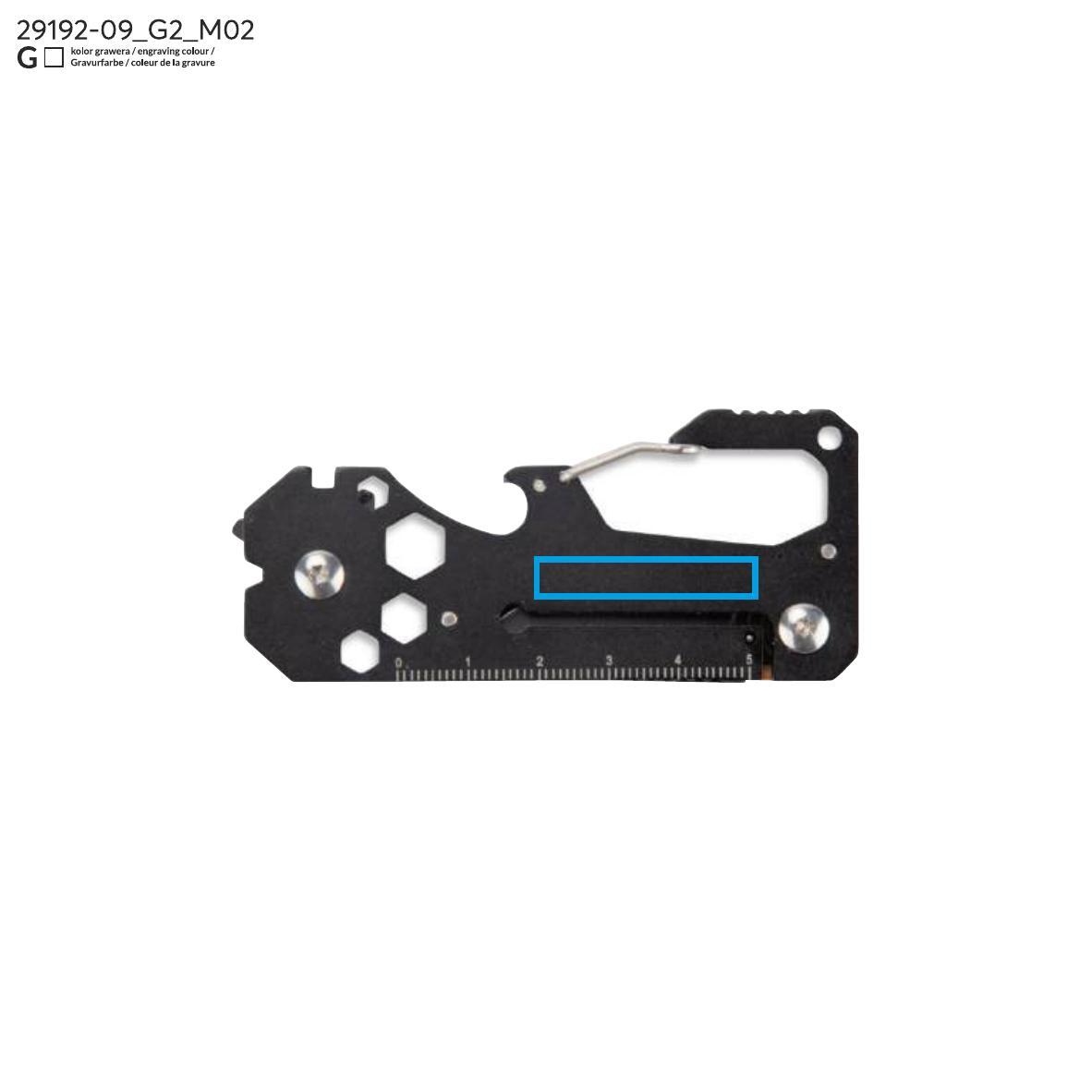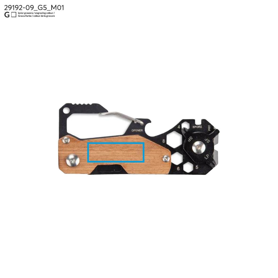 Narzędzie wielofunkcyjne FINLI z karabińczykiem to praktyczne rozwiązanie w każdej sytuacji. Wykonane z metalu z elementami drewnianymi, łączy funkcje miary/linijki, karabińczyka do przypięcia do paska lub plecaka, otwieracza do butelek, nożyka, wkrętaka płaskiego i krzyżowego, klucza łomowego, klucza do szprych oraz kluczy sześciokątnych. Dodatkowo, dzięki funkcji podważania, jest idealnym narzędziem do codziennego użytku oraz działań serwisowych.