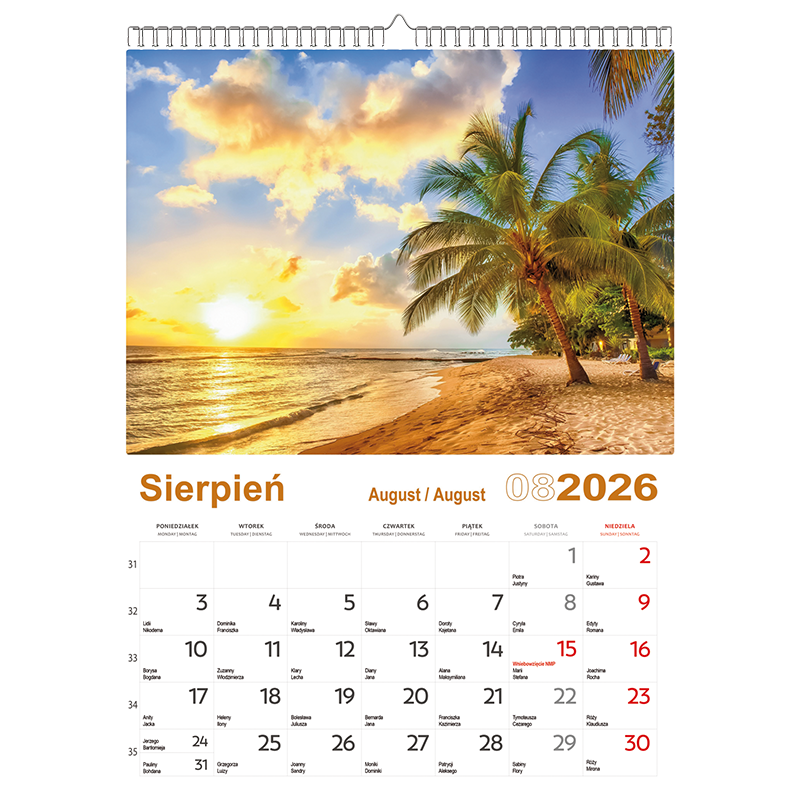 Kalendarium: | kalendarium wielojęzyczne z numeracją tygodni, miesiąc na jednej planszy |