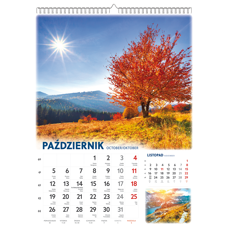Kalendarium: | kalendarium wielojęzyczne z numeracją tygodni, miesiąc na jednej planszy |