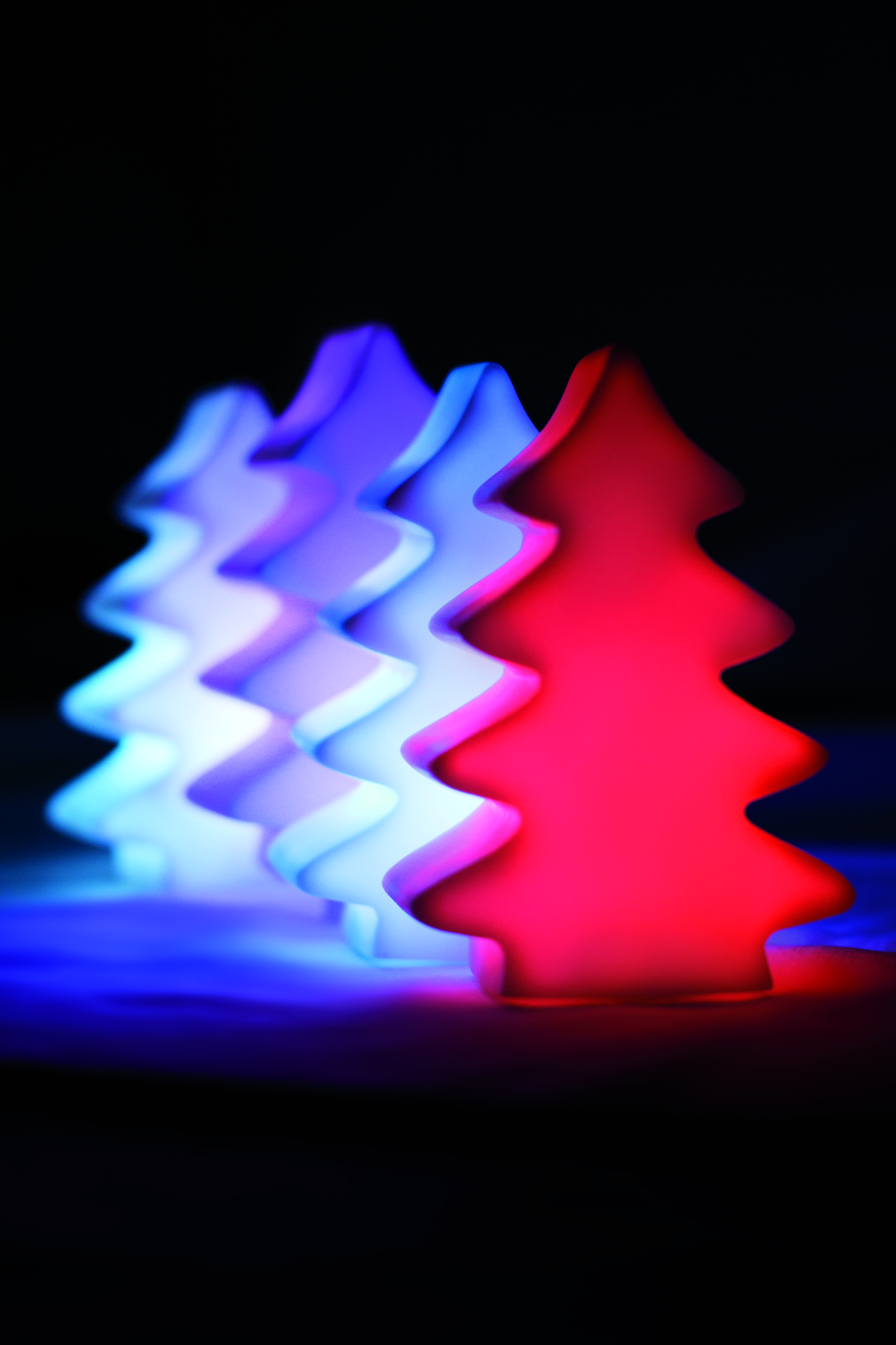 Lampka LED w kształcie choinki wykonana z PVC, zmieniająca kolory: biały, fioletowy, czerwony, żółty i zielony. 3 baterie LR44 dołączone.