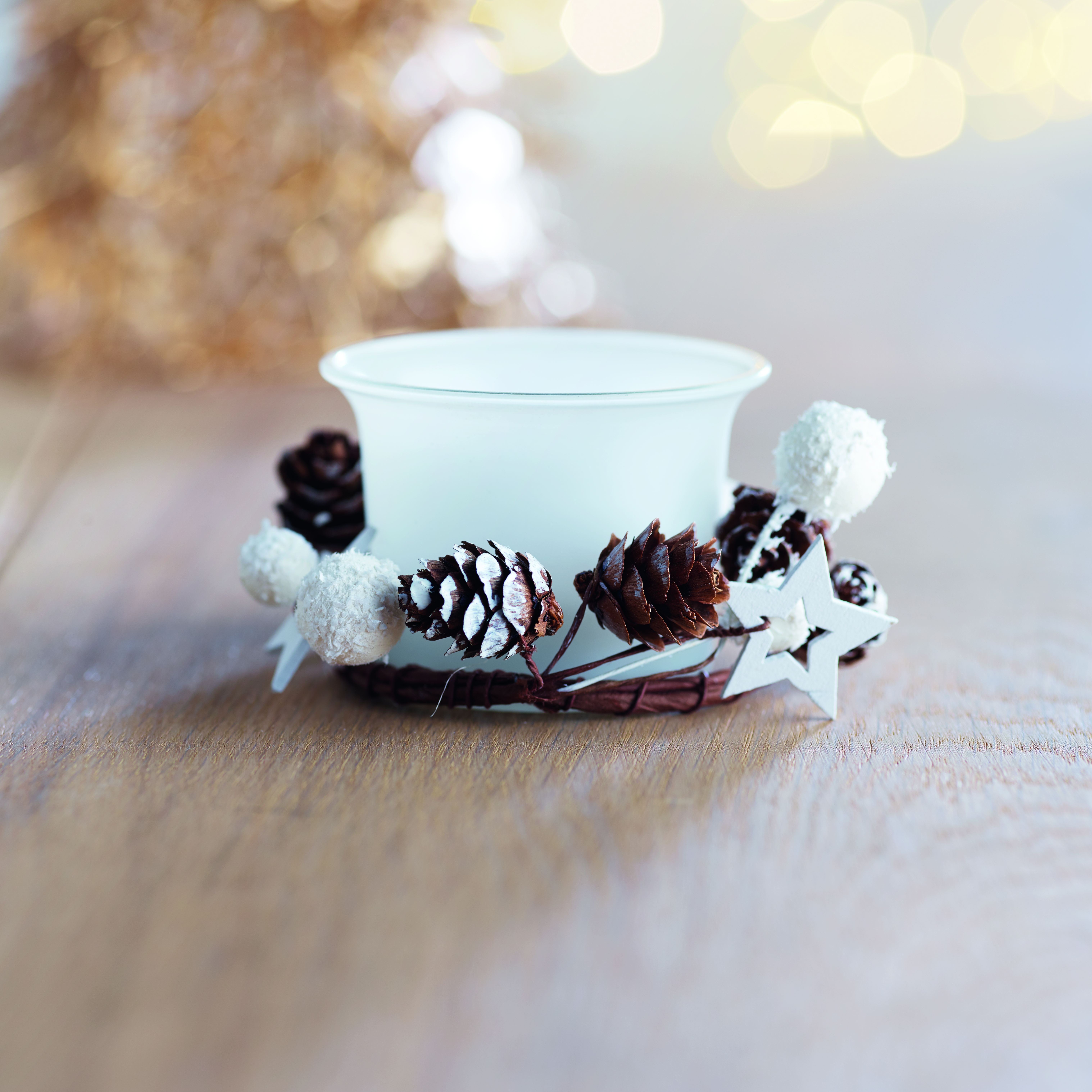 Szklany świecznik świąteczny. Zapakowany w pudełko kartonowe i pudełko PCV ze wstążką i etykietą.