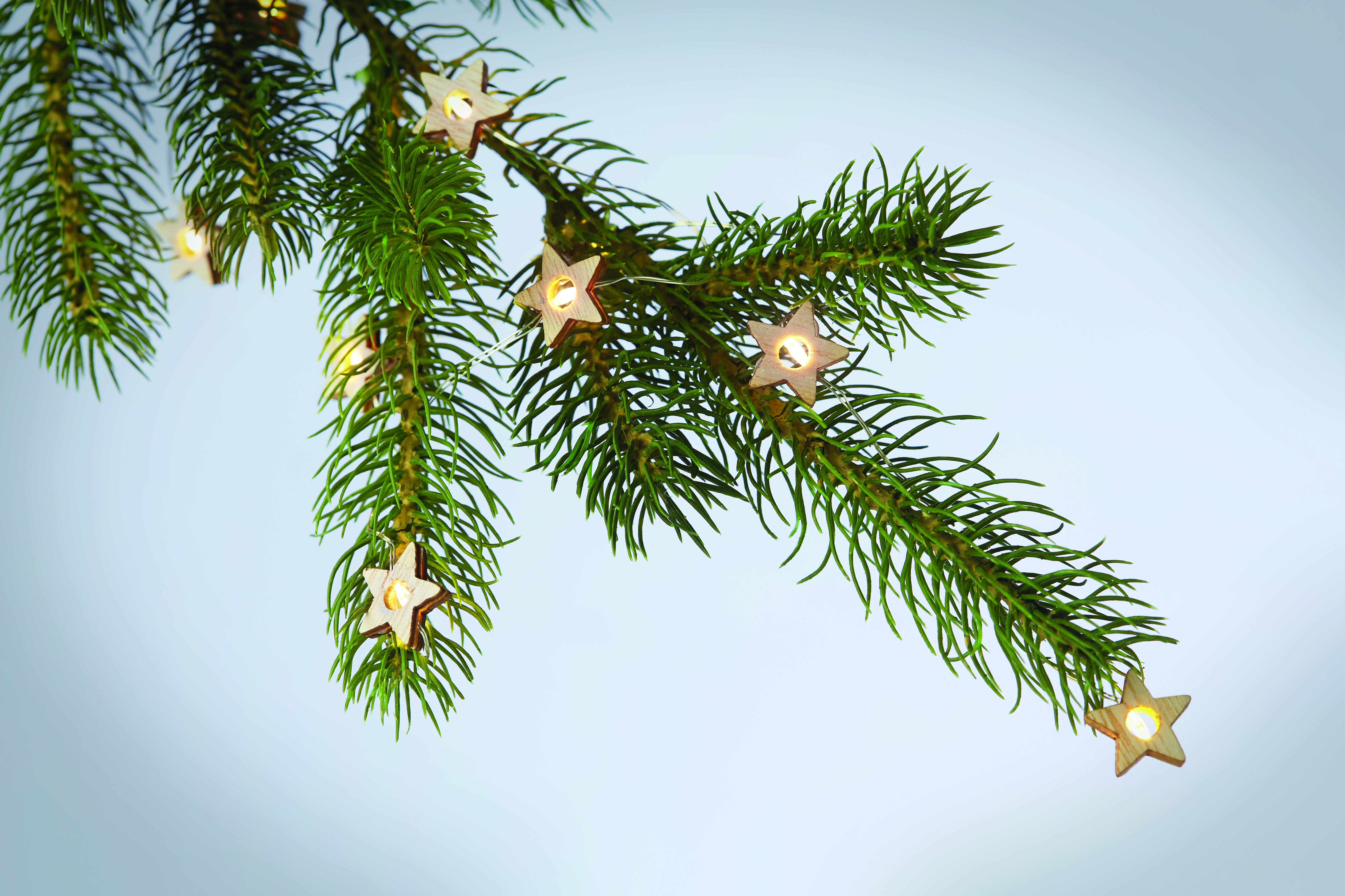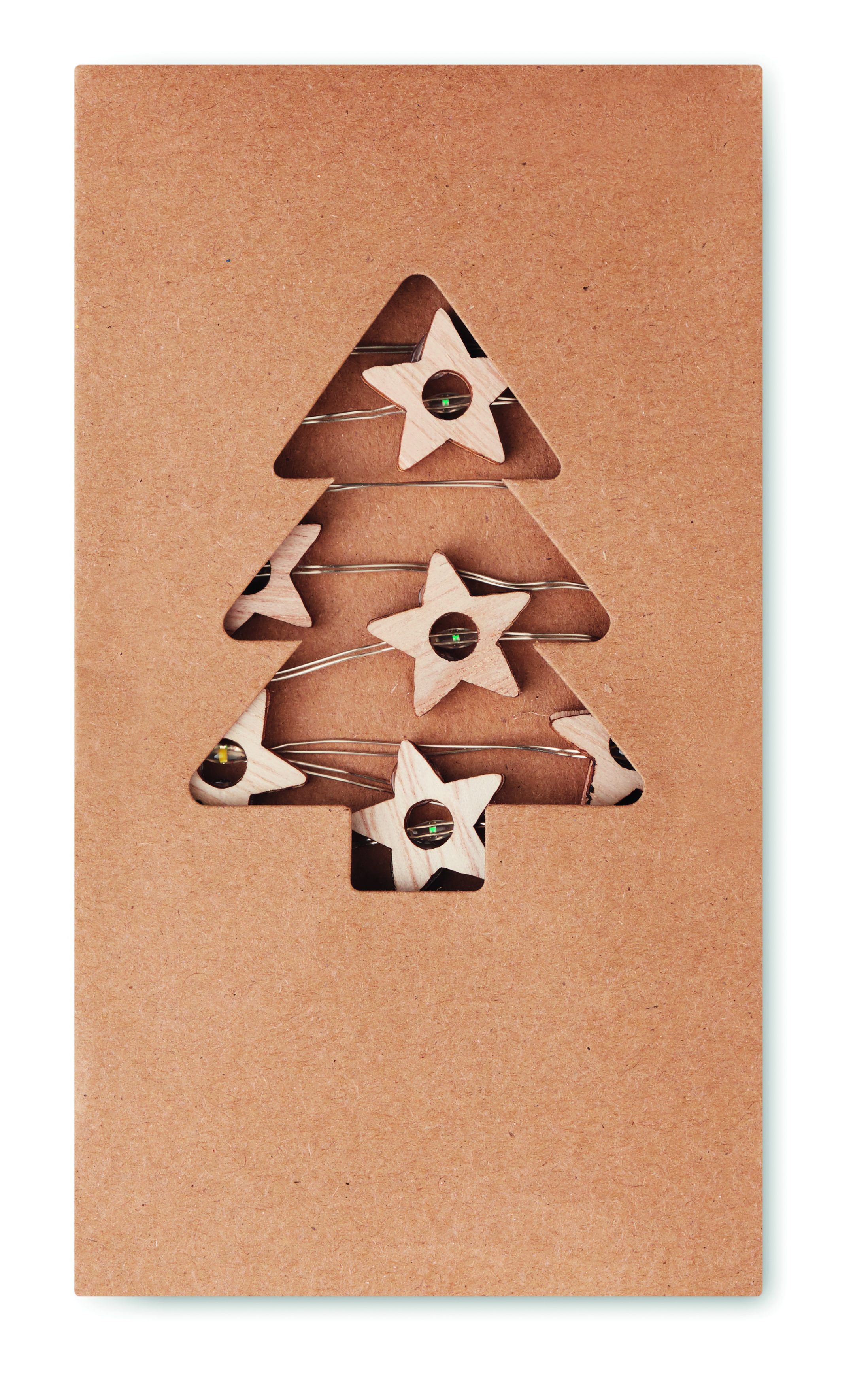 Łańcuch świetlny 20 LED, lampki w kształcie drewnianych gwiazdek. Zapakowany w kartonowe pudełko. 2 baterie AA nie dołączone. Przycisk włączania / wyłączania w obudowie baterii.