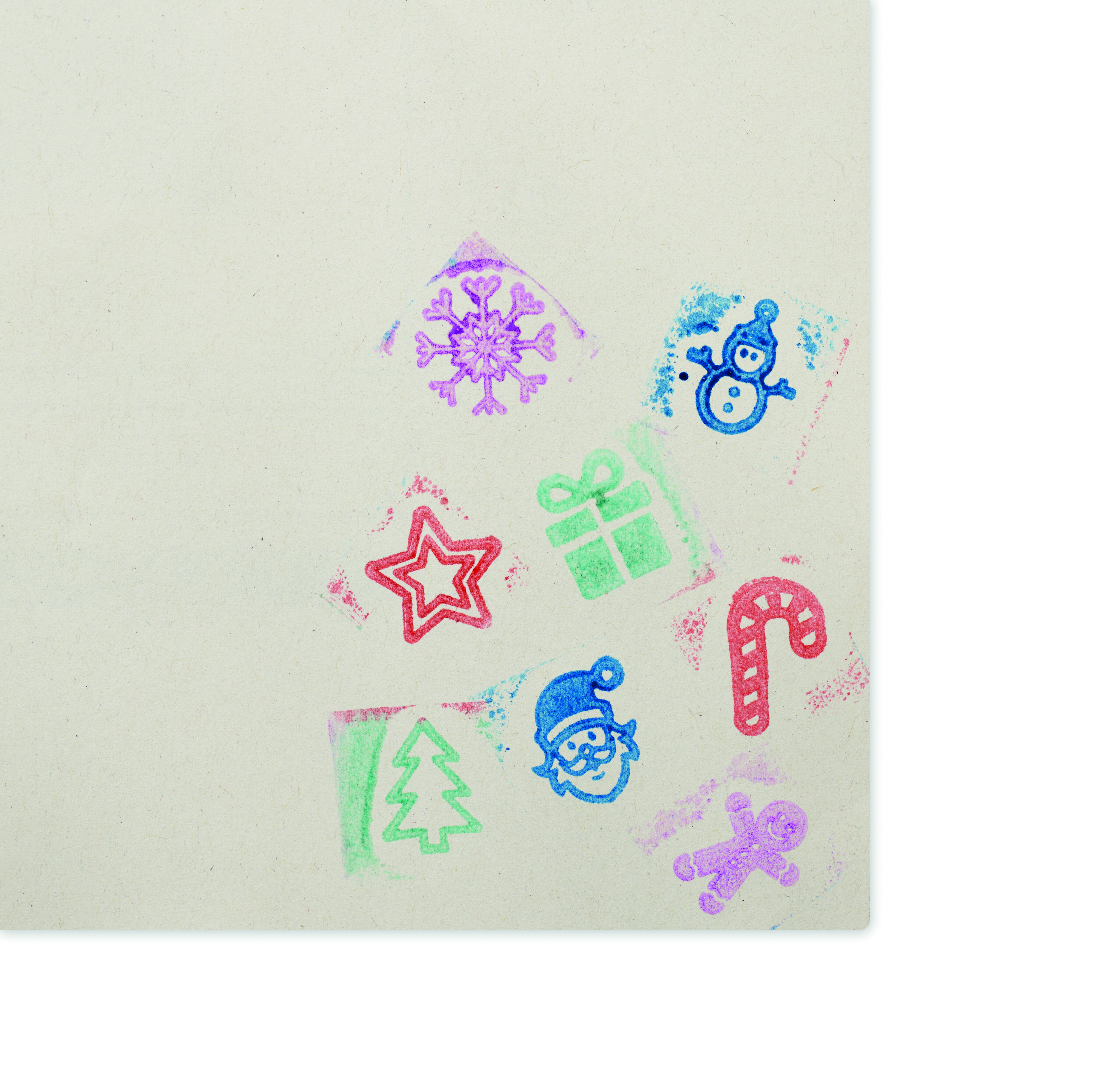 Zestaw 8 drewnianych stempli świątecznych w bawełnianej torbie ze sznurkiem.