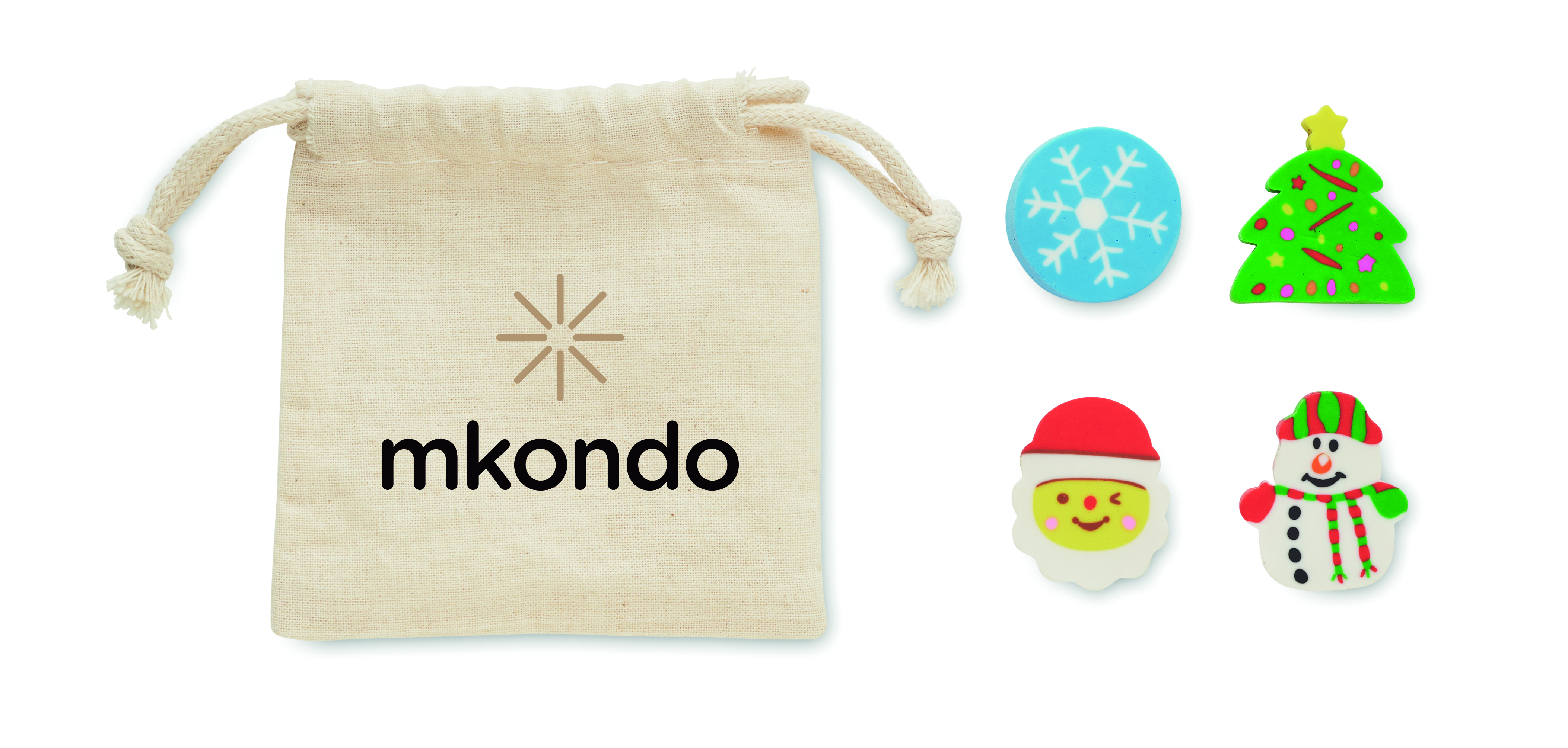 Zestaw 4 świątecznych gumek do zmazywania: płatek śniegu, Mikołaj, choinka i bałwan. Prezentowane w bawełnianym woreczku ze sznurkiem.