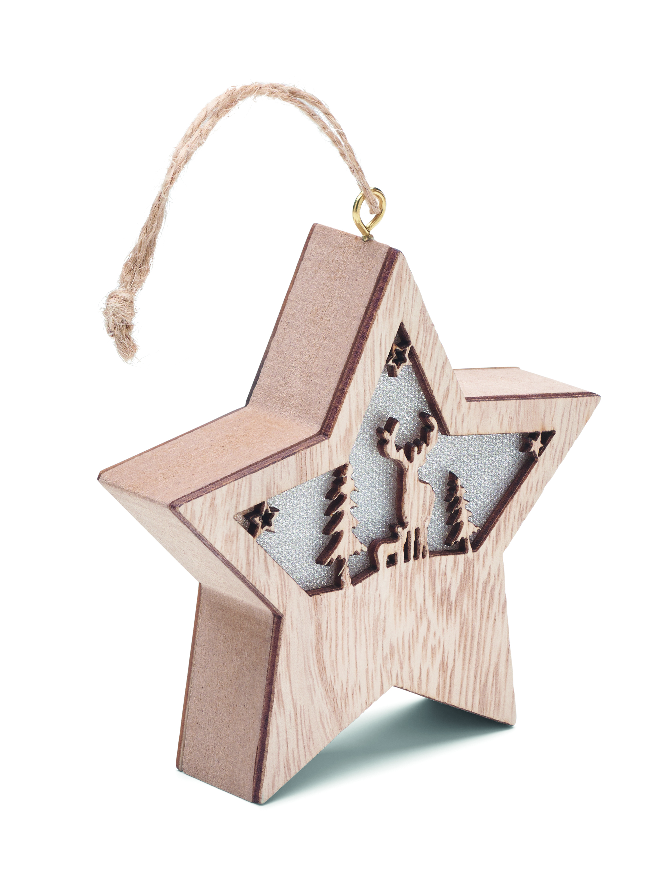 Gwiazda z płyty MDF z lampką w środku, z ozdobami świątecznymi i sznurkiem do zawieszania. Zawiera 3 baterie LR44.