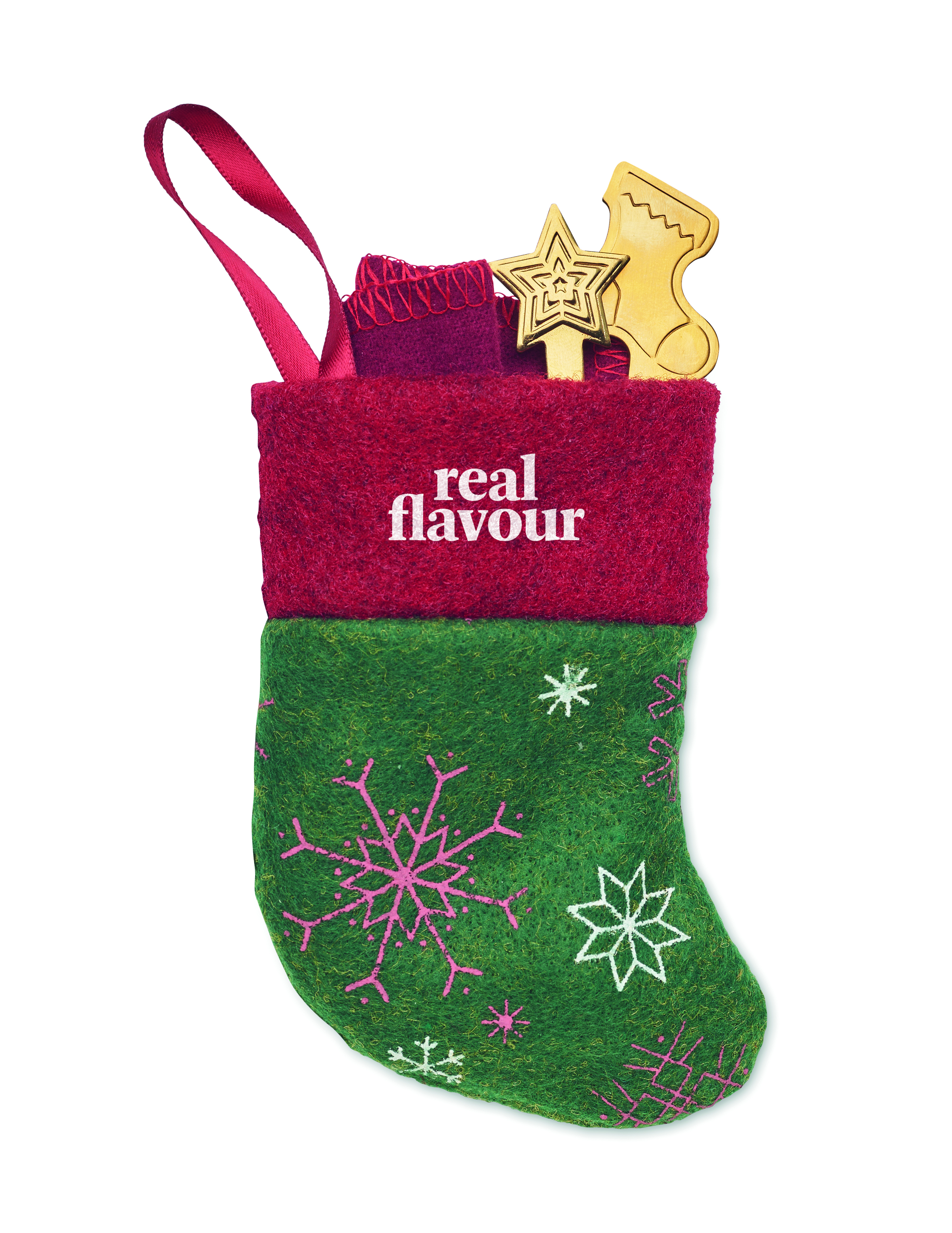 Świąteczny zestaw sztućców deserowych zawierający łyżkę i widelec ze stali nierdzewnej oraz bawełnianą serwetkę 150 gr/m². Zapakowane w świąteczne etui w kształcie skarpety.