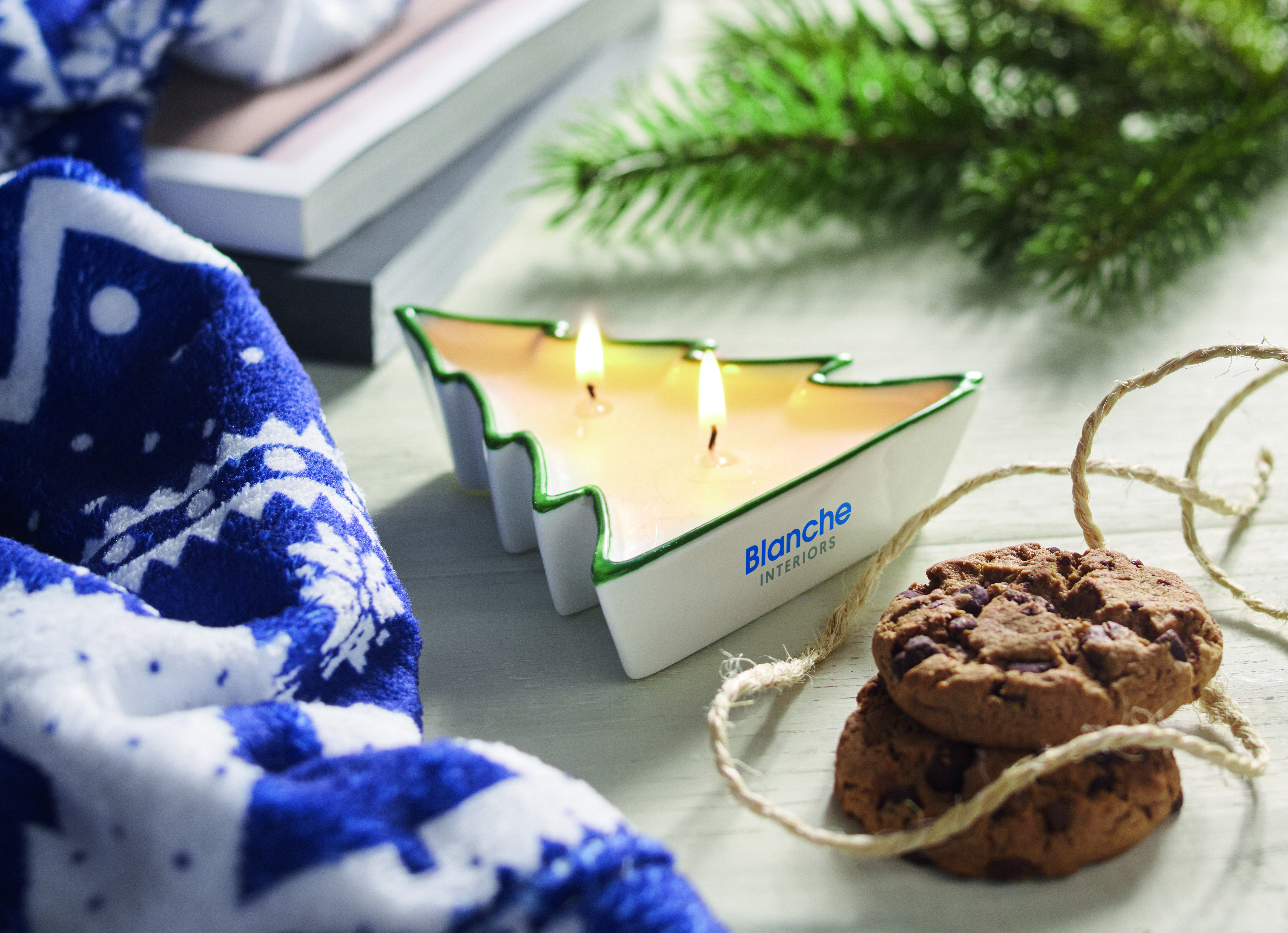 Świeca na bazie wosku roślinnego w porcelanowym pojemniku w kształcie choinki z 2 knotami. 60 gr. Czas palenia: 4 godziny.