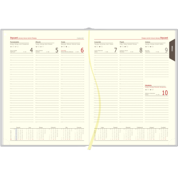 Układ: | tygodniowy, 1 tydzień na 2 stronach (cały tydzień na rozkładówce) |