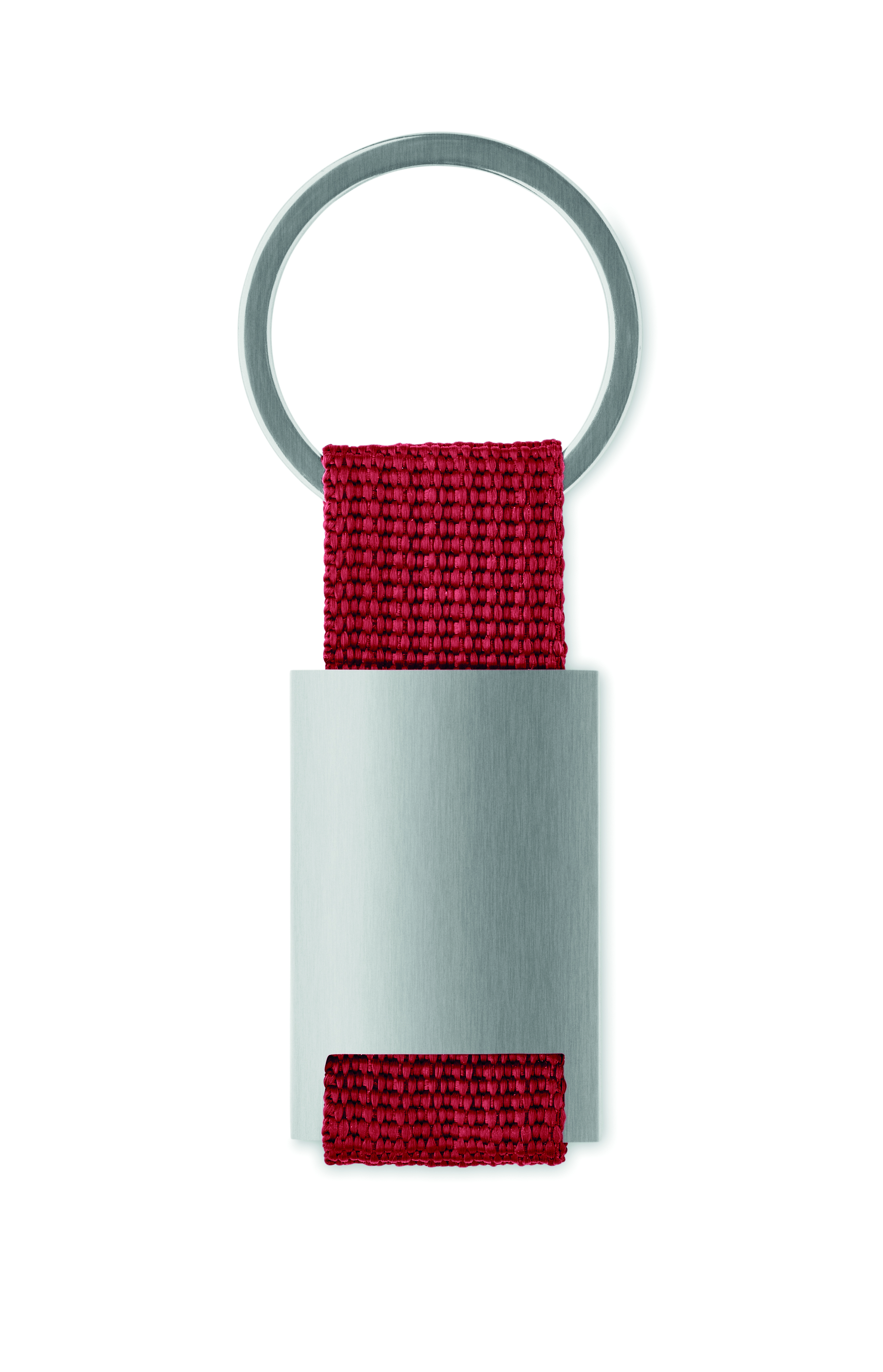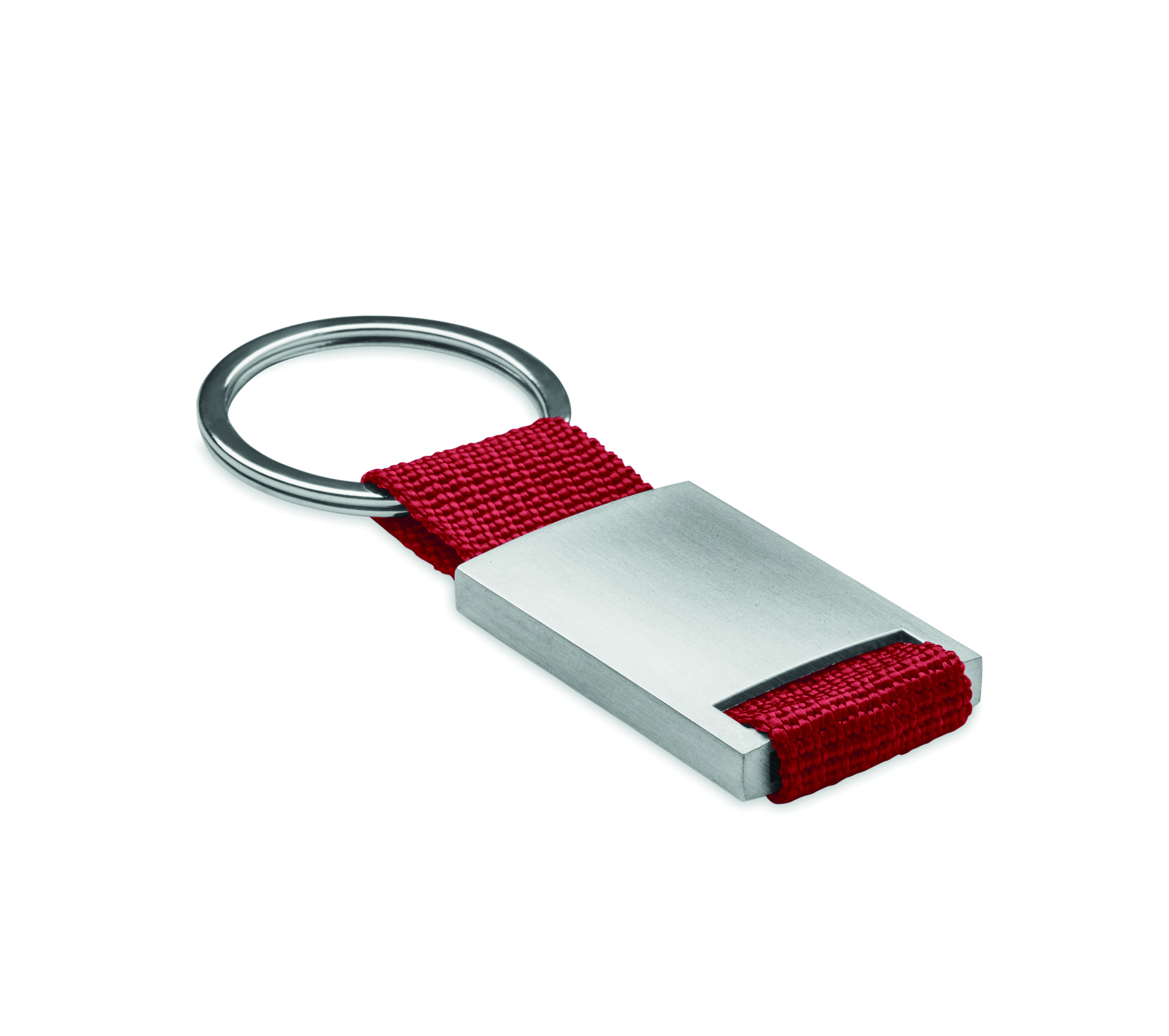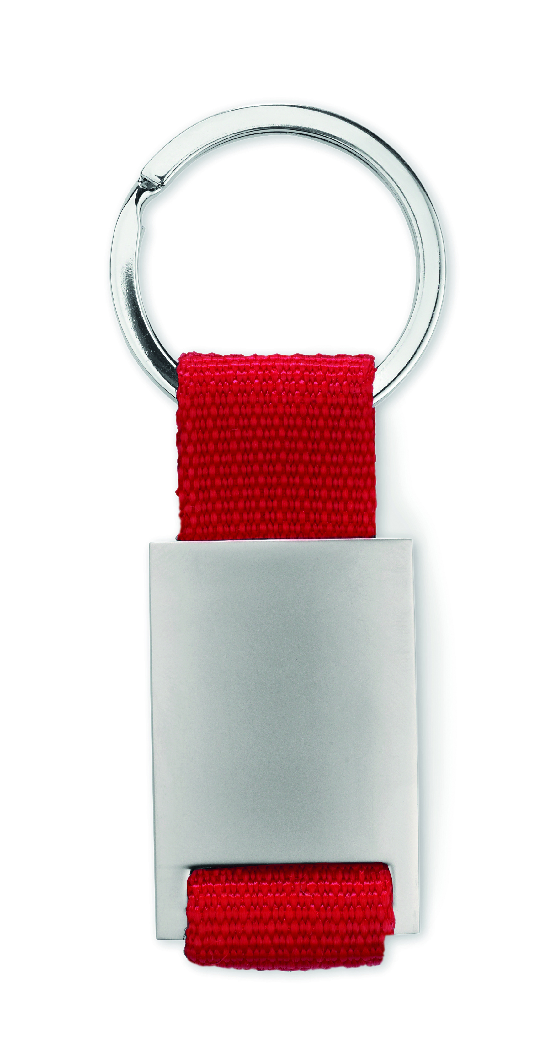Prostokątny brelok ze stopu cynku i z kolorową plecioną taśmą z polyestru.