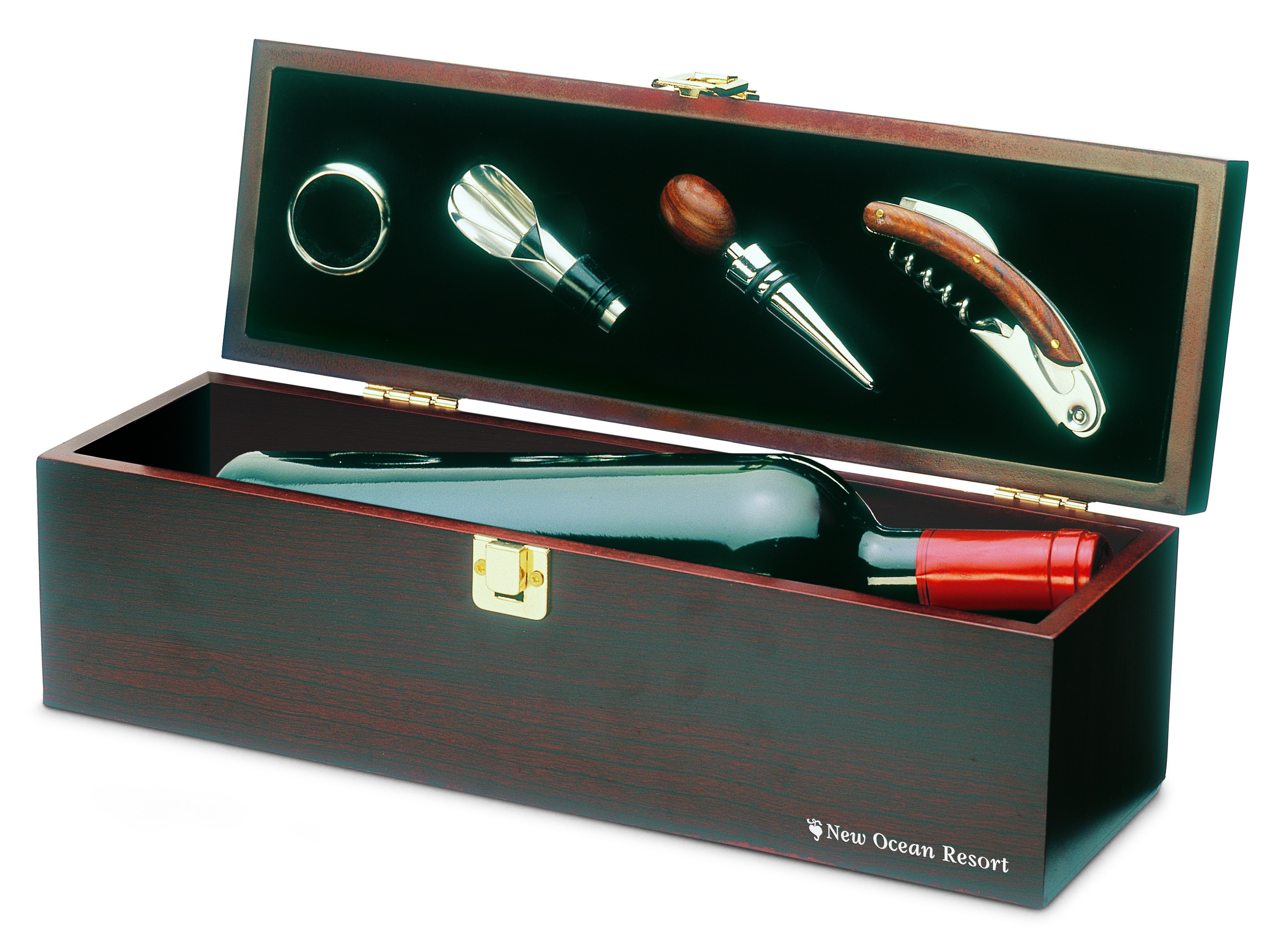 Drewniane pudełko na 1 butelkę wina, z akcesoriami. Wino nie dołączone.