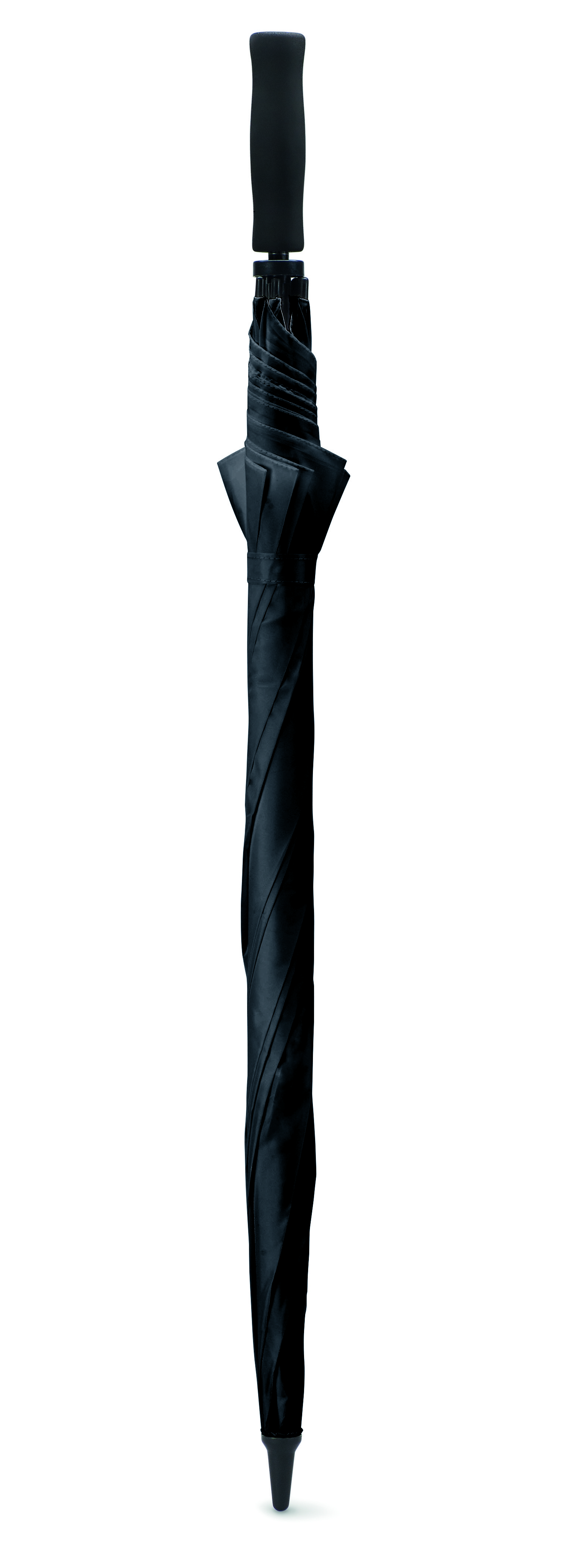 Parasol 30 cali, otwierany ręcznie, odporny na wiatr. Trzon i żebra z włókna szklanego, czarne plastikowe końcówki i szpic. Materiał: poliester 190T. Czarna, prosta rączka z EVA. Zamykany manualnie.