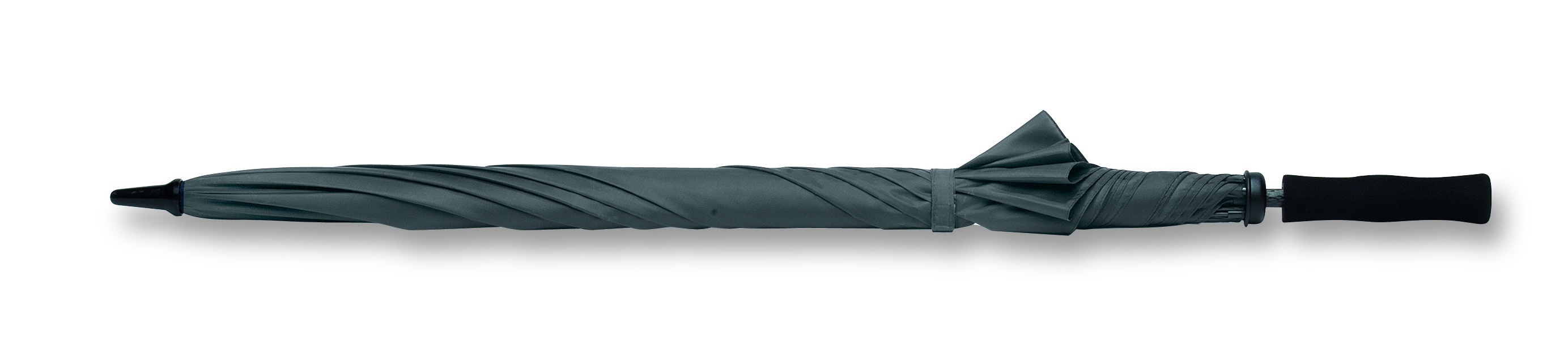 Parasol 30 cali, otwierany ręcznie, odporny na wiatr. Trzon i żebra z włókna szklanego, czarne plastikowe końcówki i szpic. Materiał: poliester 190T. Czarna, prosta rączka z EVA. Zamykany manualnie.