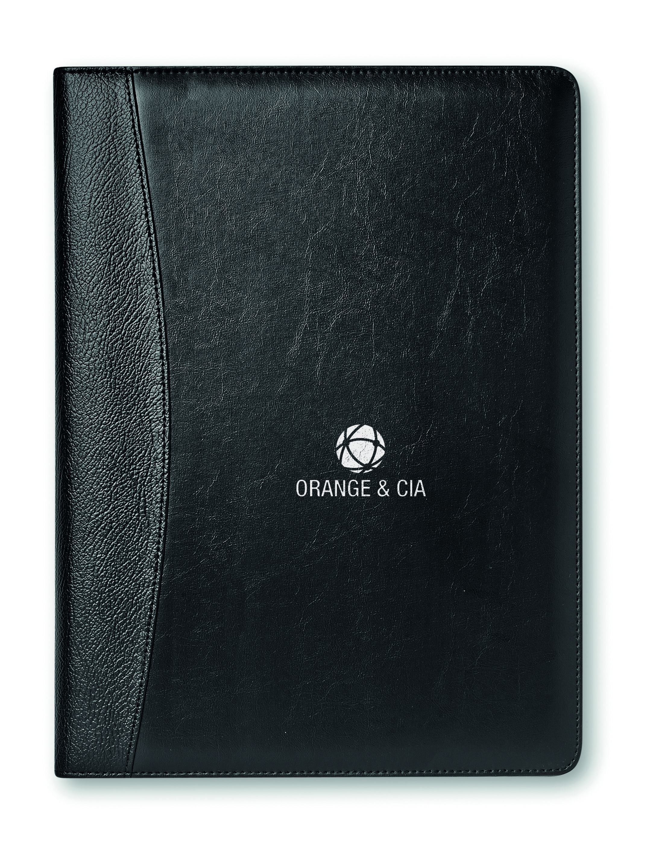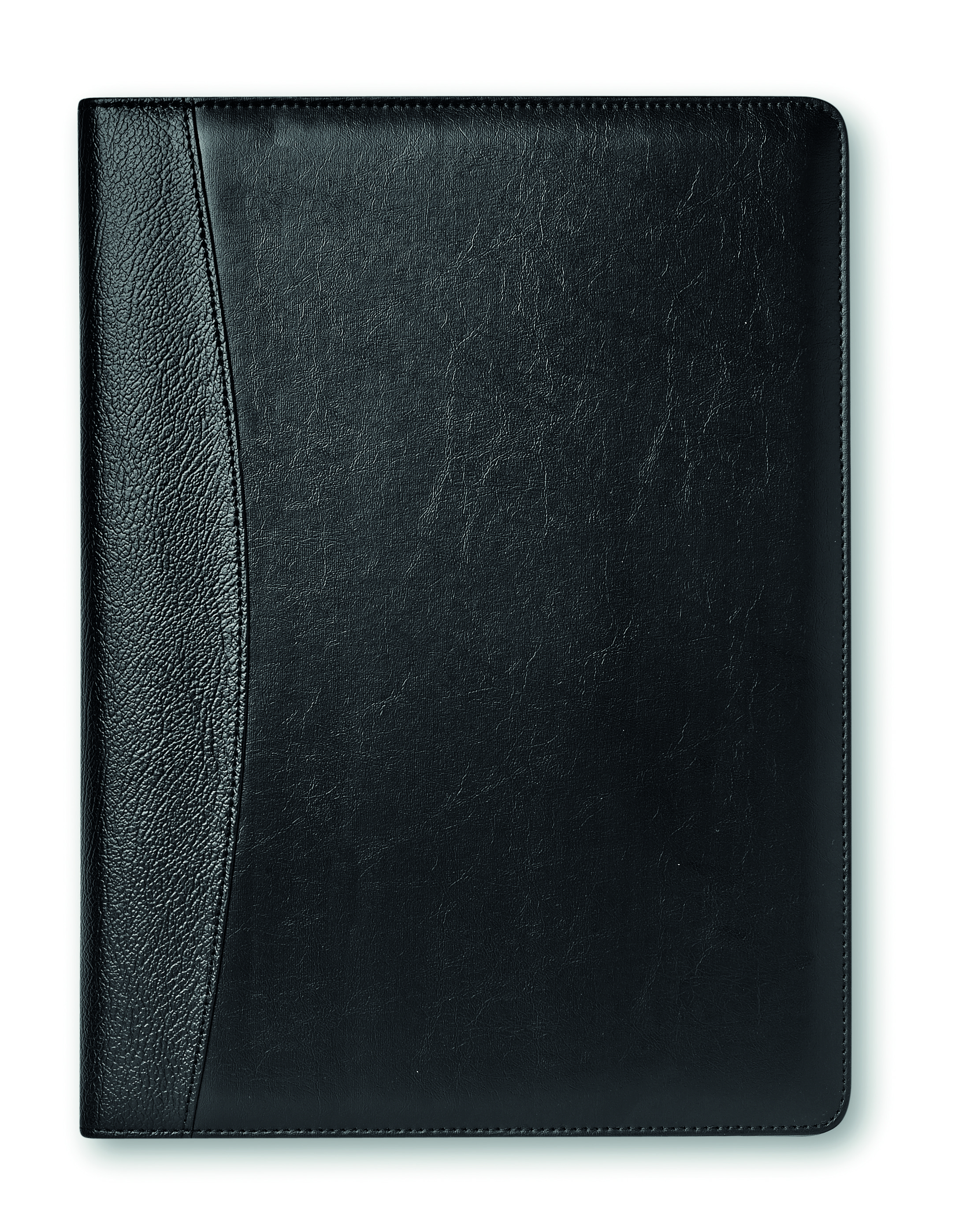 Teczka A4 z imitacji skóry. Z notesem w linie (20 kartek), kalkulatorem na baterię słoneczną, długopisem z niebieskim wkładem.