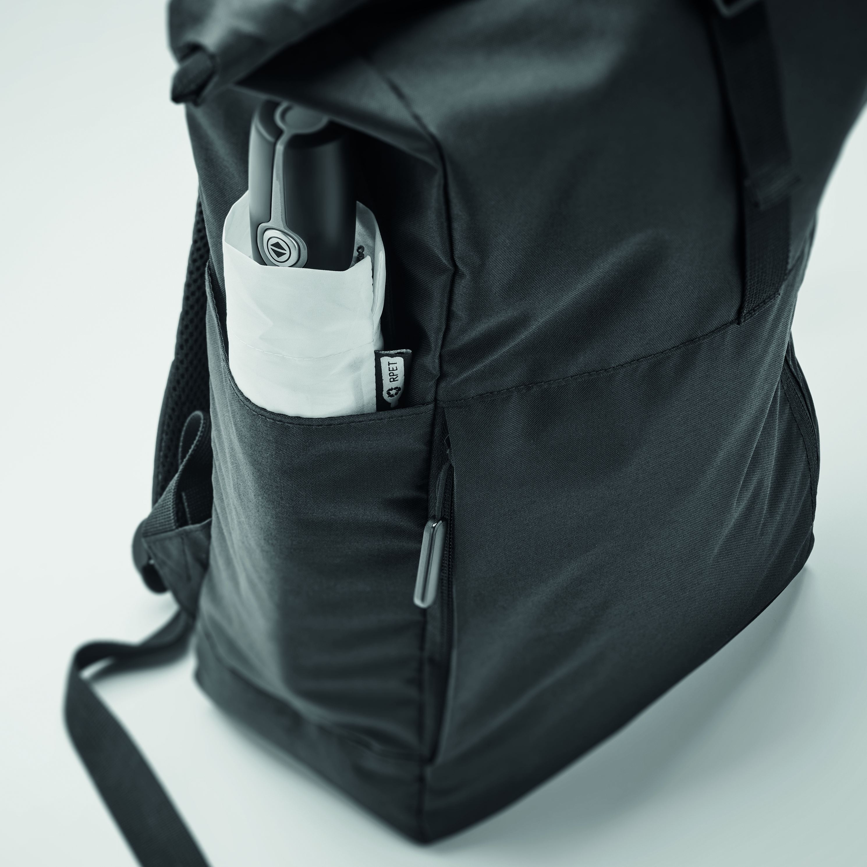 Plecak na laptopa 15 cali z zamknięciem typu rolltop, wykonany z poliestru 300D RPET. Duża przednia kieszeń zapinana na zamek, ukryta kieszeń boczna z małym karabińczykiem wewnątrz. Karabińczyk nie nadaje się do wspinaczki (nie do użytku profesjonalnego).