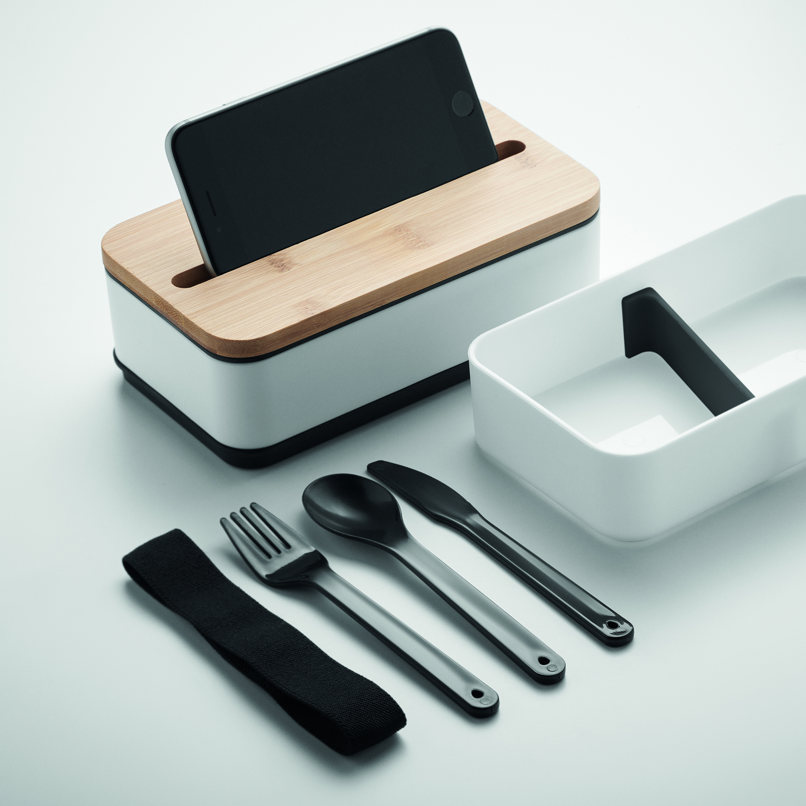 Dwupoziomowy pojemnik na lunch z PP z z wyjmowaną przegrodą i 3 sztućcami, z dołączoną opaską poliestrową, z bambusową pokrywą. Pokrywa ma funkcję podstawki pod telefon. Pojemność: 400 ml (2x). Bambus jest produktem naturalnym, dlatego mogą wystąpić nieznaczne różnice w kolorze, wzorze i rozmiarze.