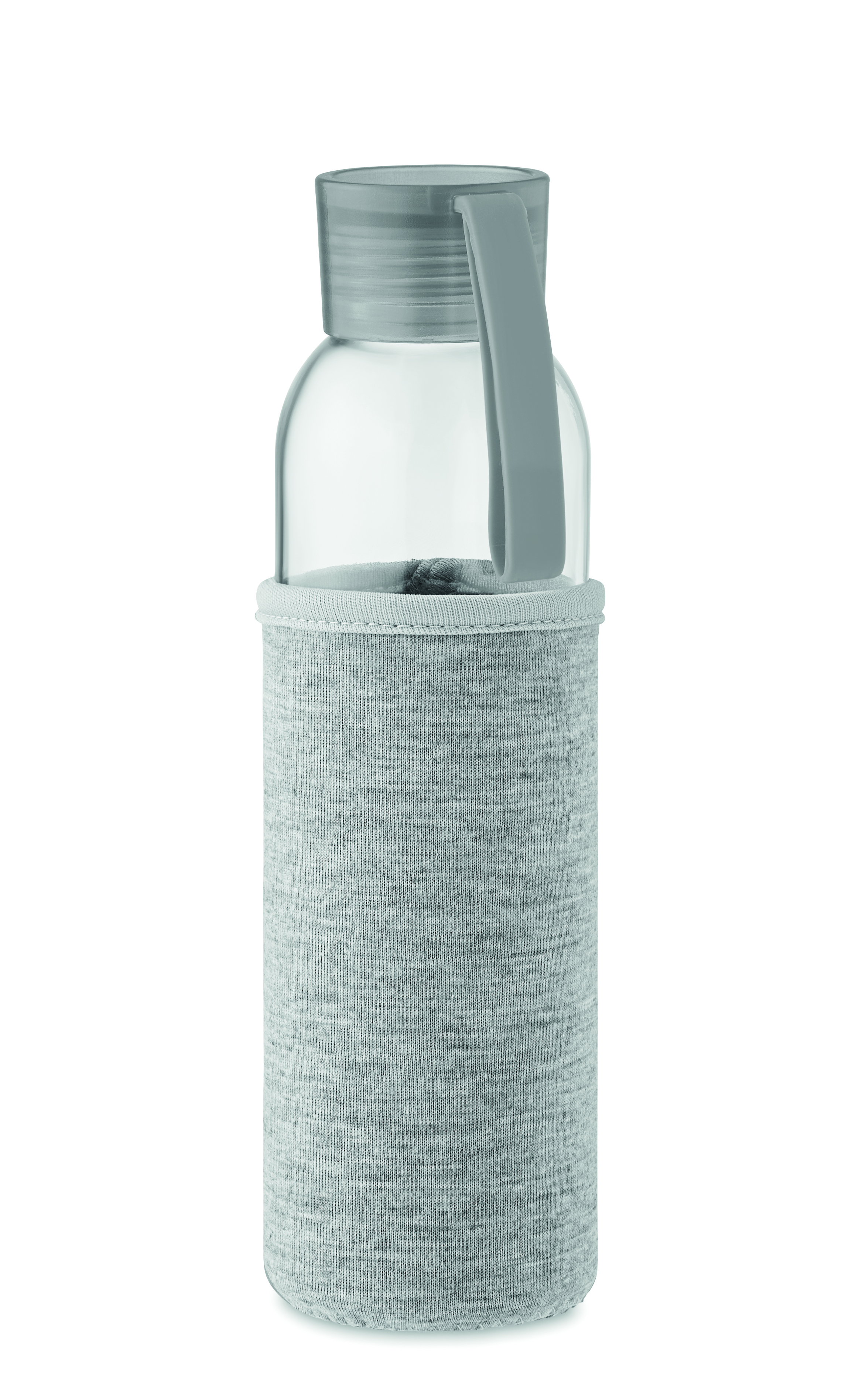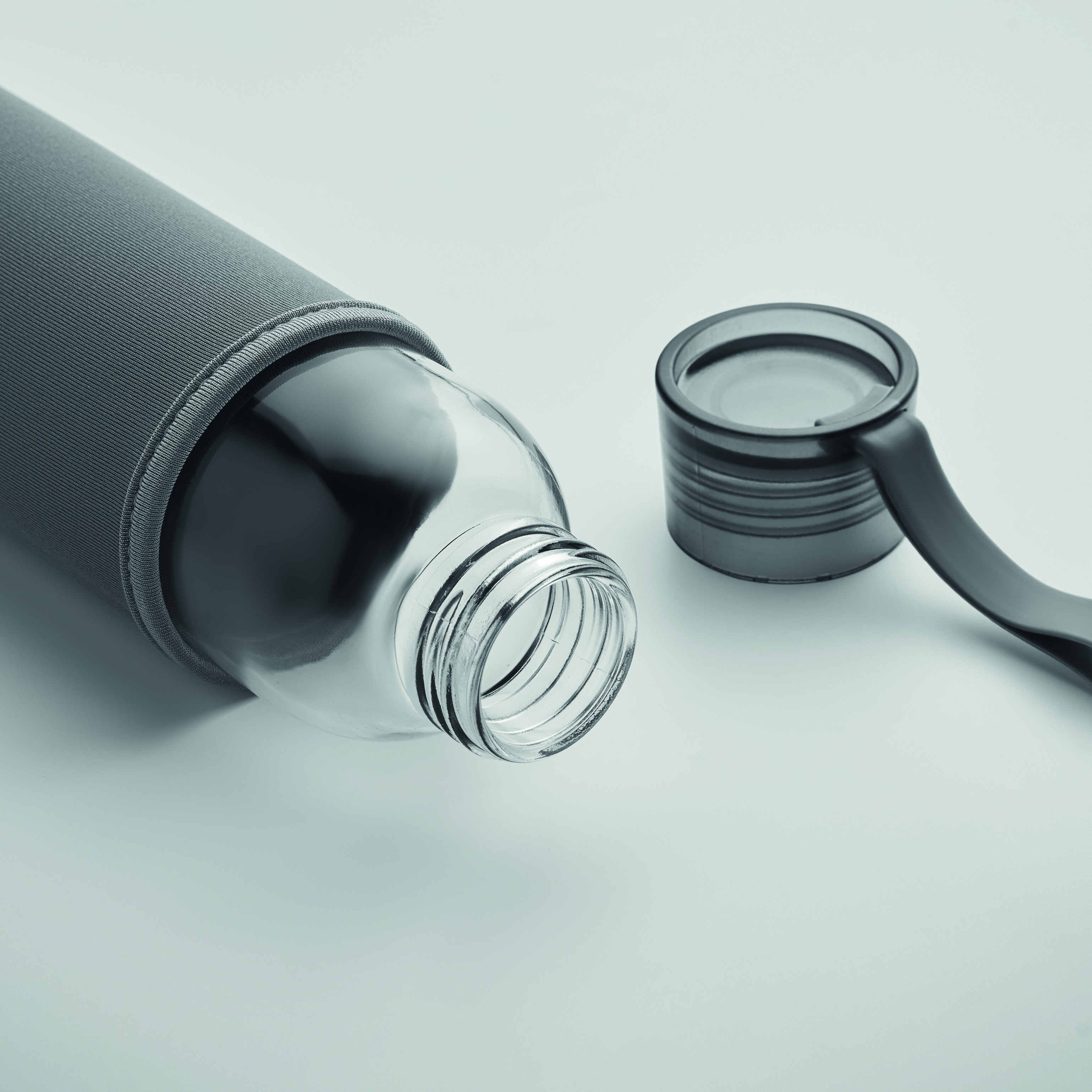 Szklana butelka z recyklingu z neoprenowym etui, z zakrętką z PP i z silikonową zwieszką. Szczelna. Pojemność: 500 ml.